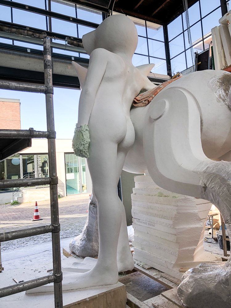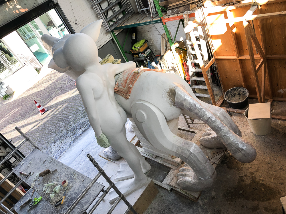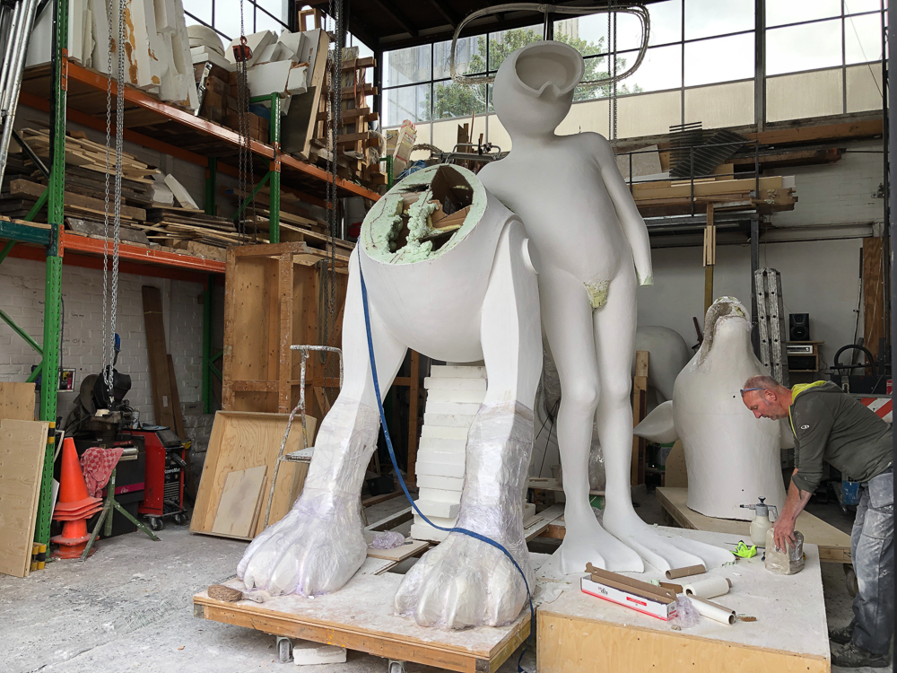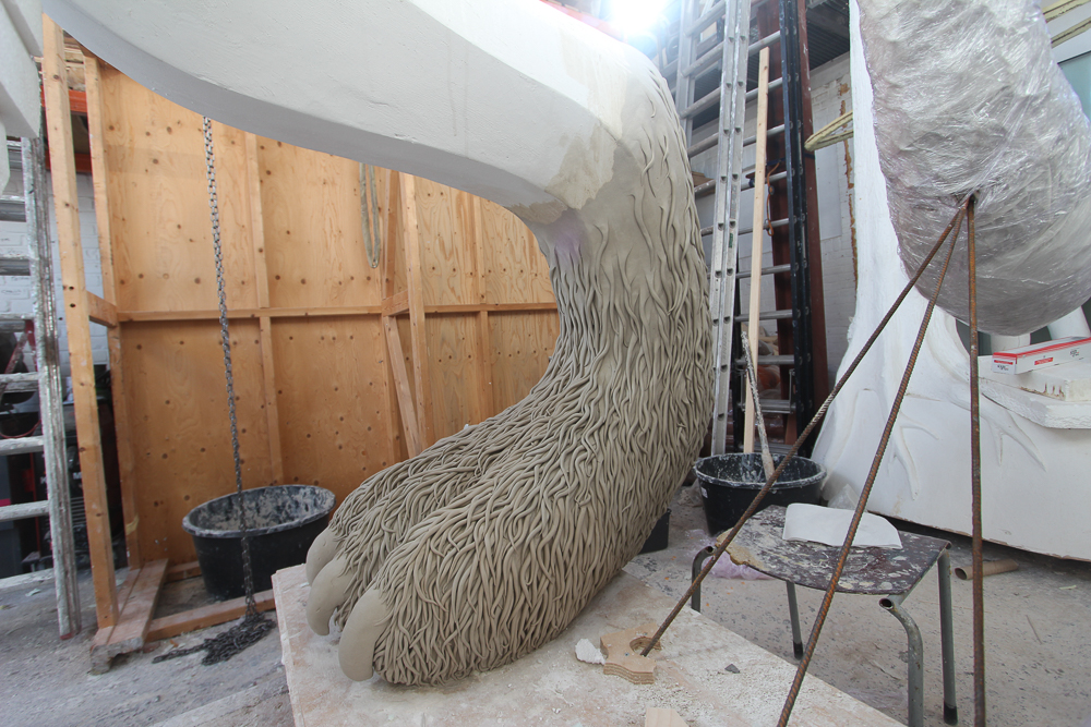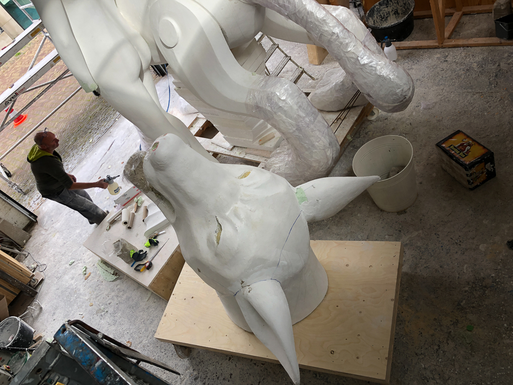 Nou ik zeg Kop d’r af…! En zo gedaan. Nadat we de Boudewijn tot waanzin hadden gedreven, werd het tijd voor wat logistieke Zen.., tenslotte giet je niet iedere dag een wolvenpup van 3.50m hoog. Om het model ook daadwerkelijk in de brons te krijgen, wordt er nog iets van inzicht gevraagd, omdat een smeltkroes nu eenmaal zo en zo groot is, of dat een stookoven voor de gips maar zus en me zoveel hoog en breed is, of omdat haren gieten toch echt wel een dingetje is….. Anyway conclusies waren snel getrokken en de zaag gaat erin, kop uit mekaar, omdat net als de poten de harige delen in een gipsmal gemaakt worden, die uitgestookt worden en maar beperkte maat mogen hebben. Dus kop zometeen in 6 delen, poten en staart apart in de vorm gezet en de rest van de Aquanaut en de Wolf in de zandbak ( dat is dus voor het afvormen van de zandmal) En dat is bijna zo ver want volgende week vrijdag worden de poten af gevormd en ligt het beeld bijna uit elkaar, na schade doch….! Tot zover maar weer..