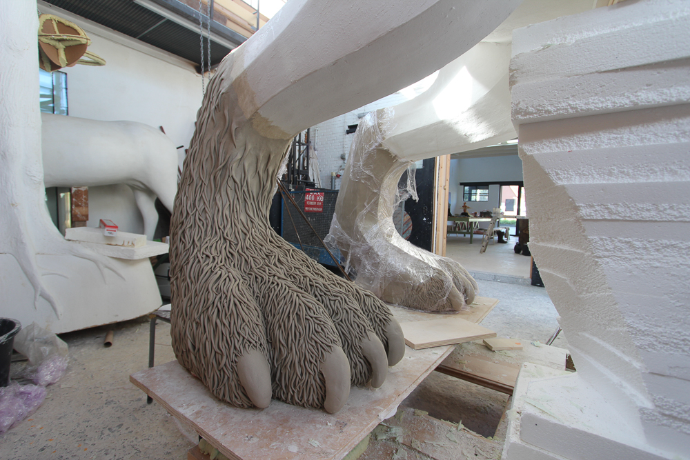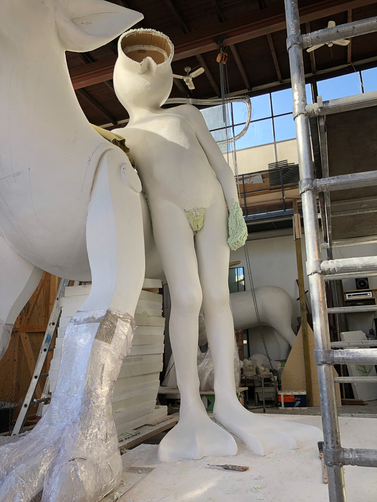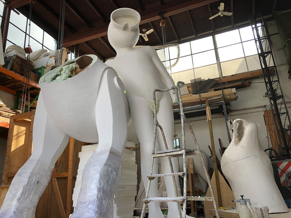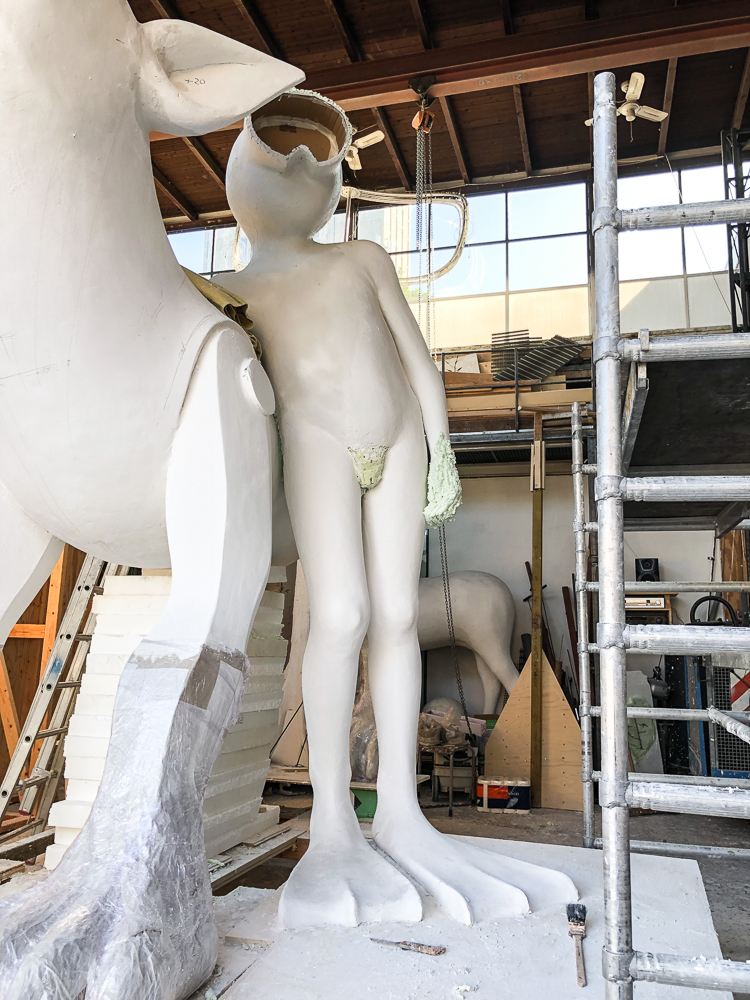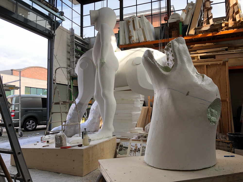 Nou ik zeg Kop d’r af…! En zo gedaan. Nadat we de Boudewijn tot waanzin hadden gedreven, werd het tijd voor wat logistieke Zen.., tenslotte giet je niet iedere dag een wolvenpup van 3.50m hoog. Om het model ook daadwerkelijk in de brons te krijgen, wordt er nog iets van inzicht gevraagd, omdat een smeltkroes nu eenmaal zo en zo groot is, of dat een stookoven voor de gips maar zus en me zoveel hoog en breed is, of omdat haren gieten toch echt wel een dingetje is….. Anyway conclusies waren snel getrokken en de zaag gaat erin, kop uit mekaar, omdat net als de poten de harige delen in een gipsmal gemaakt worden, die uitgestookt worden en maar beperkte maat mogen hebben. Dus kop zometeen in 6 delen, poten en staart apart in de vorm gezet en de rest van de Aquanaut en de Wolf in de zandbak ( dat is dus voor het afvormen van de zandmal) En dat is bijna zo ver want volgende week vrijdag worden de poten af gevormd en ligt het beeld bijna uit elkaar, na schade doch….! Tot zover maar weer..