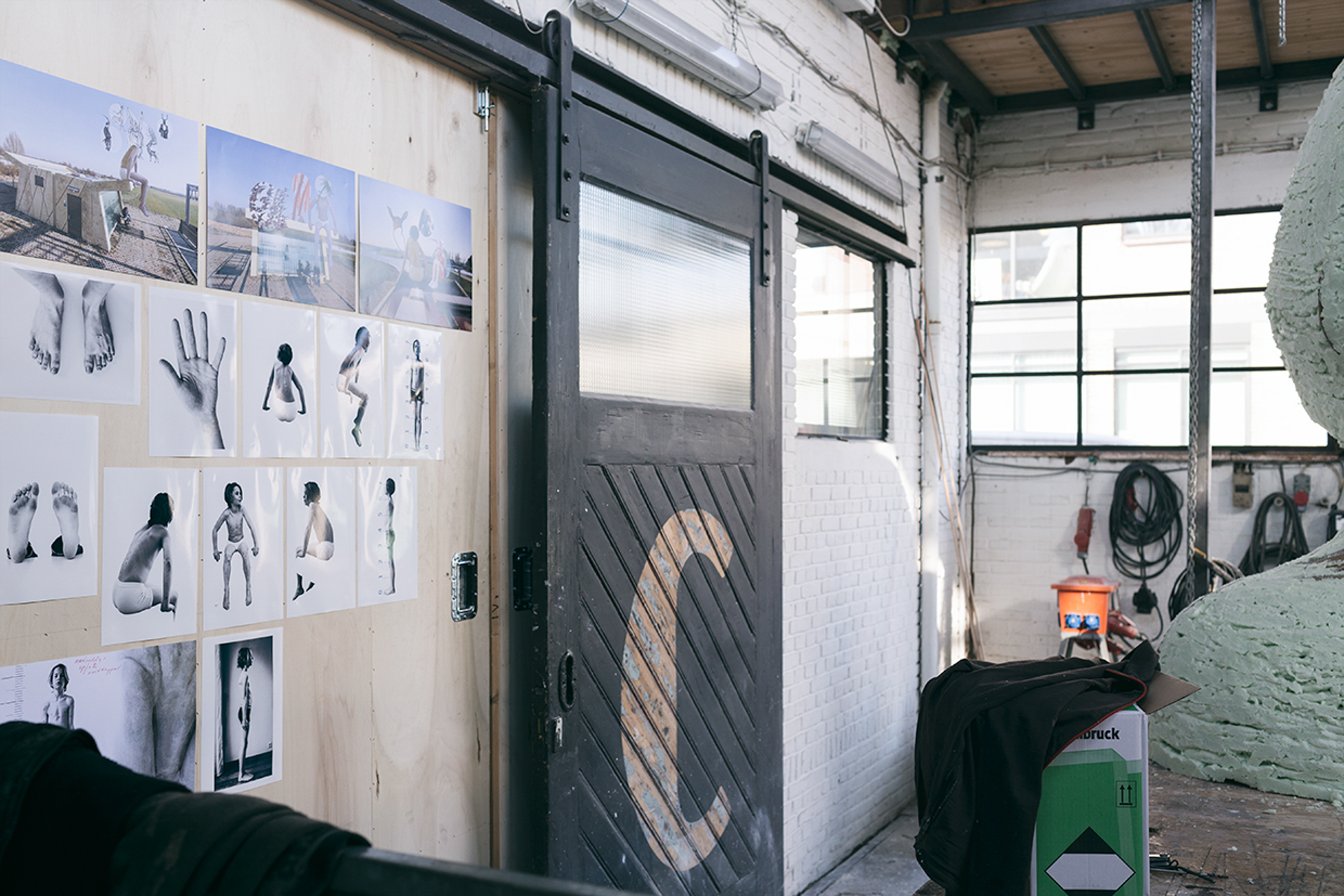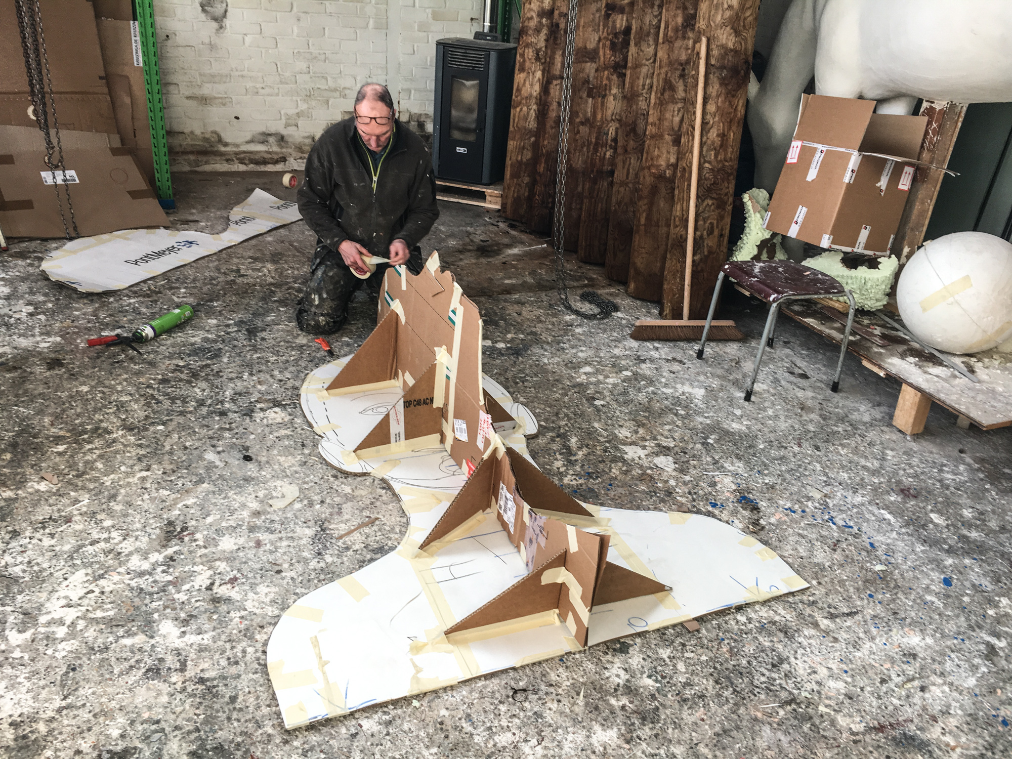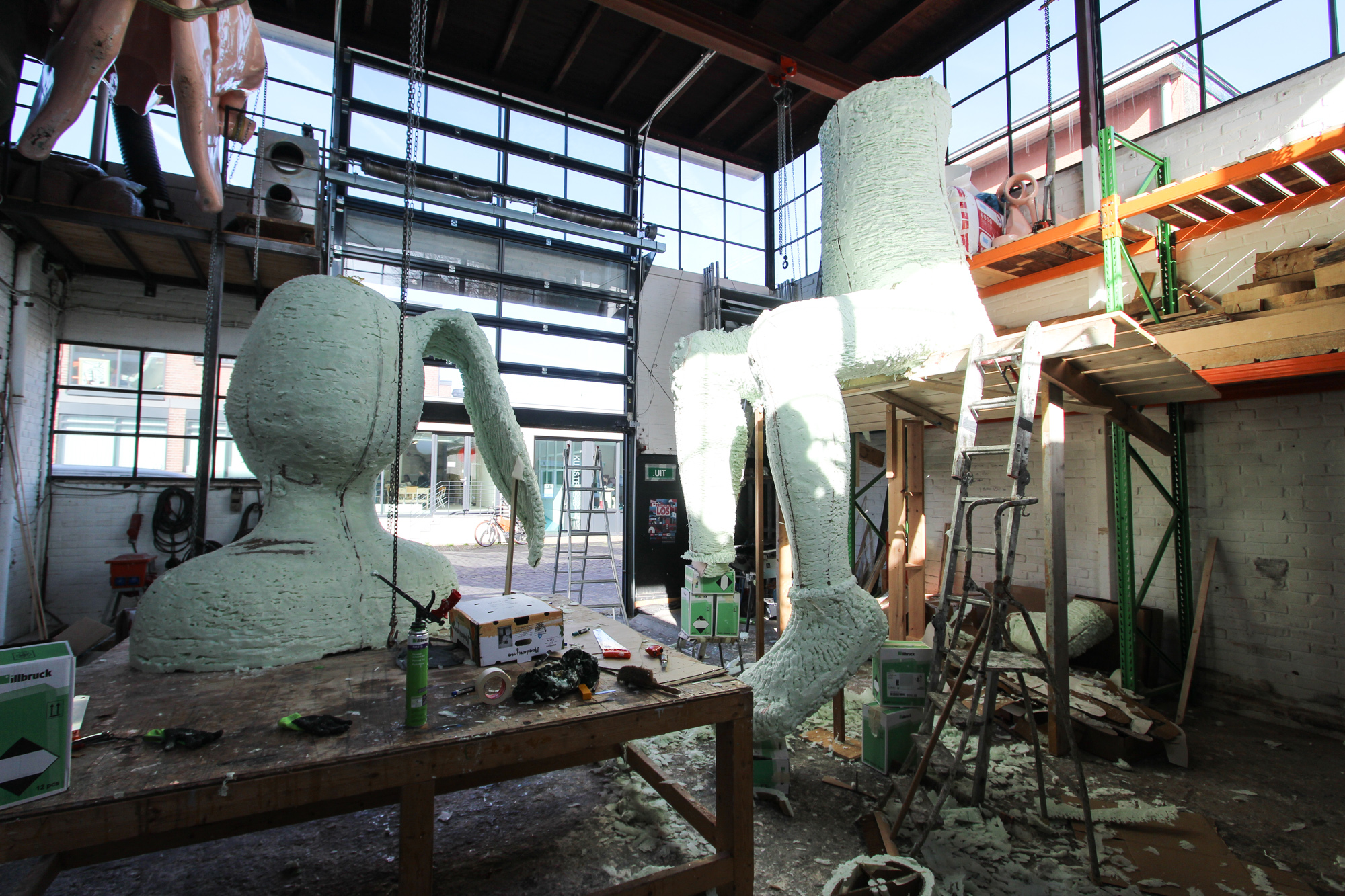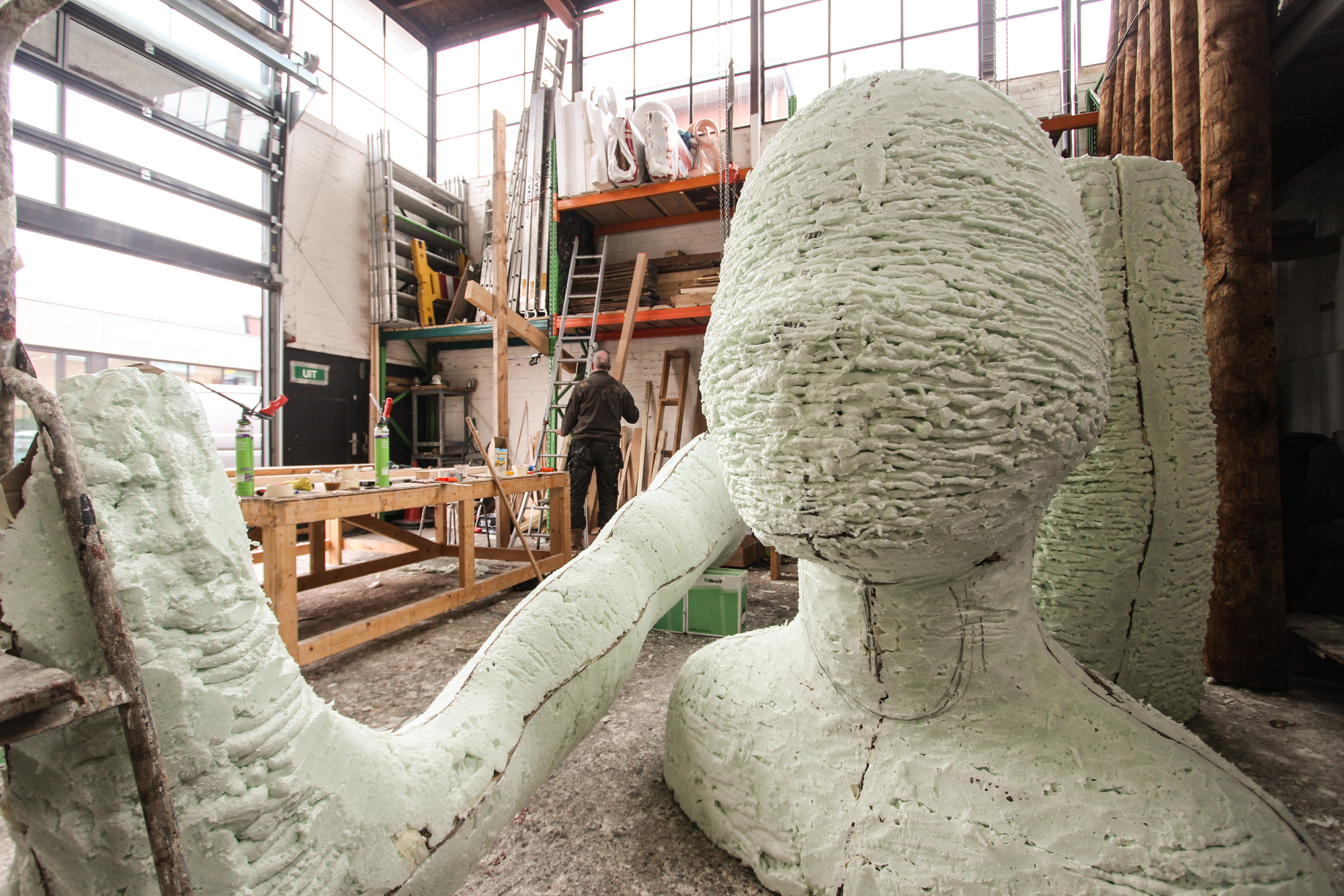 Voor het maken van ons ontwerp voor de IJsselbienale ging er nog wel een middagje fotoshoot aan vooraf met Paulien en Caspar Menzel. Alles moet natuurlijk wel de juiste plek krijgen… schaalmodel gebouwd van het gemaaltje om de zithoek goed te krijgen zodat het niet lijkt alsof er zojuist een Alien op het dak geland is maar God’s houding ook nog enigszins naturel overkomt. Caspar geheel en al ingemeten en op de foto’s uitgewerkt en daarna kon alles opgeschaald worden naar ca. 1:5. En dat hebben we geweten, want zijn we natuurlijk wel gewend om op flinke schaal te werken is dit wel iets om letterlijk een stapje terug te doen, anders past het niet op het netvlies. Paul heeft inmiddels veel vrienden gemaakt bij de PUR fabriek, die nu van plan is om in Deventer een extra productie faciliteit te gaan openen, anders kunnen ze de vraag niet meer bijhouden. Inmiddels zijn alle losse delen in de maat gezet en zijn we nu bezig om God in elkaar te zetten, Don’t try this at Home…..