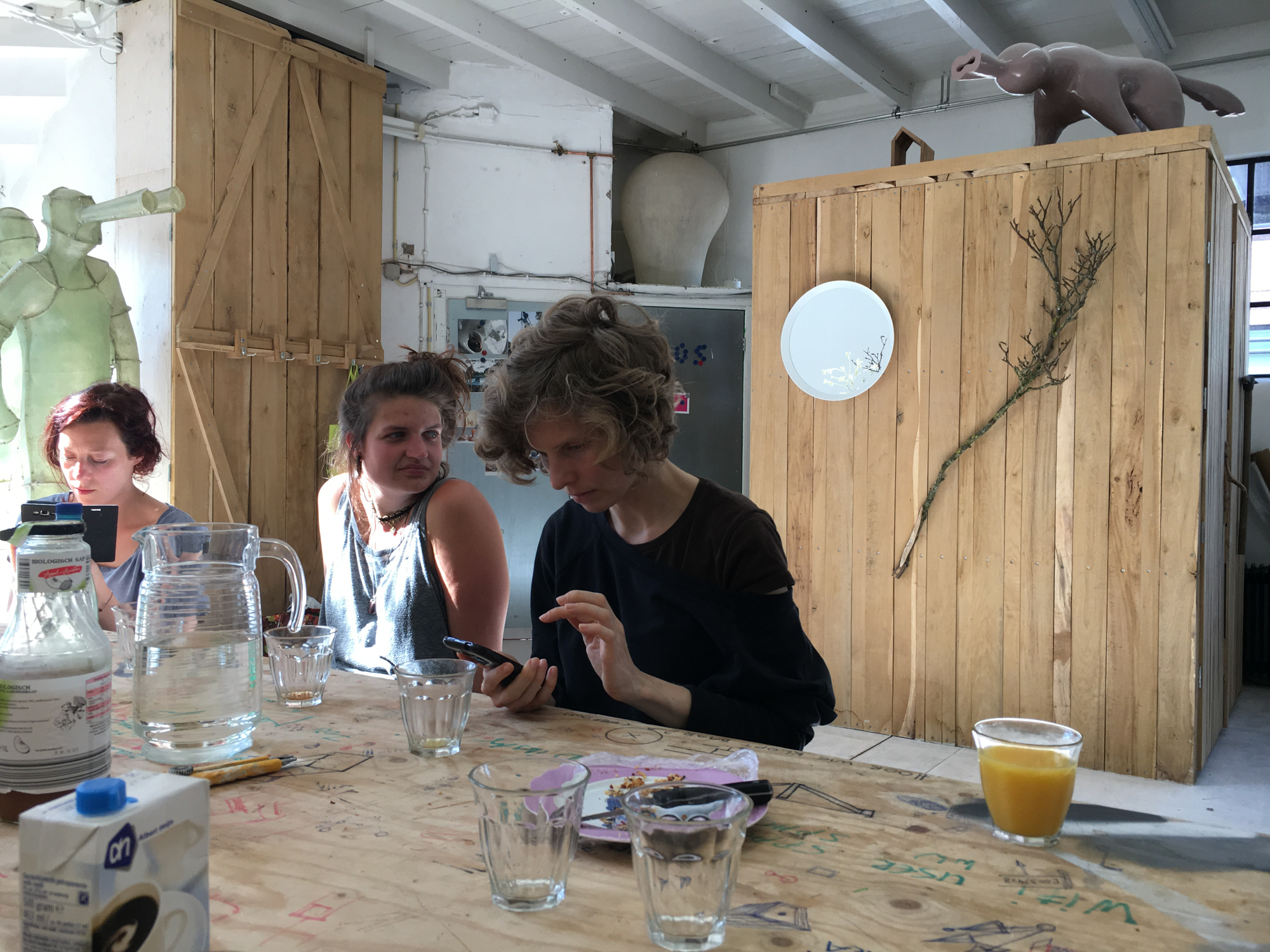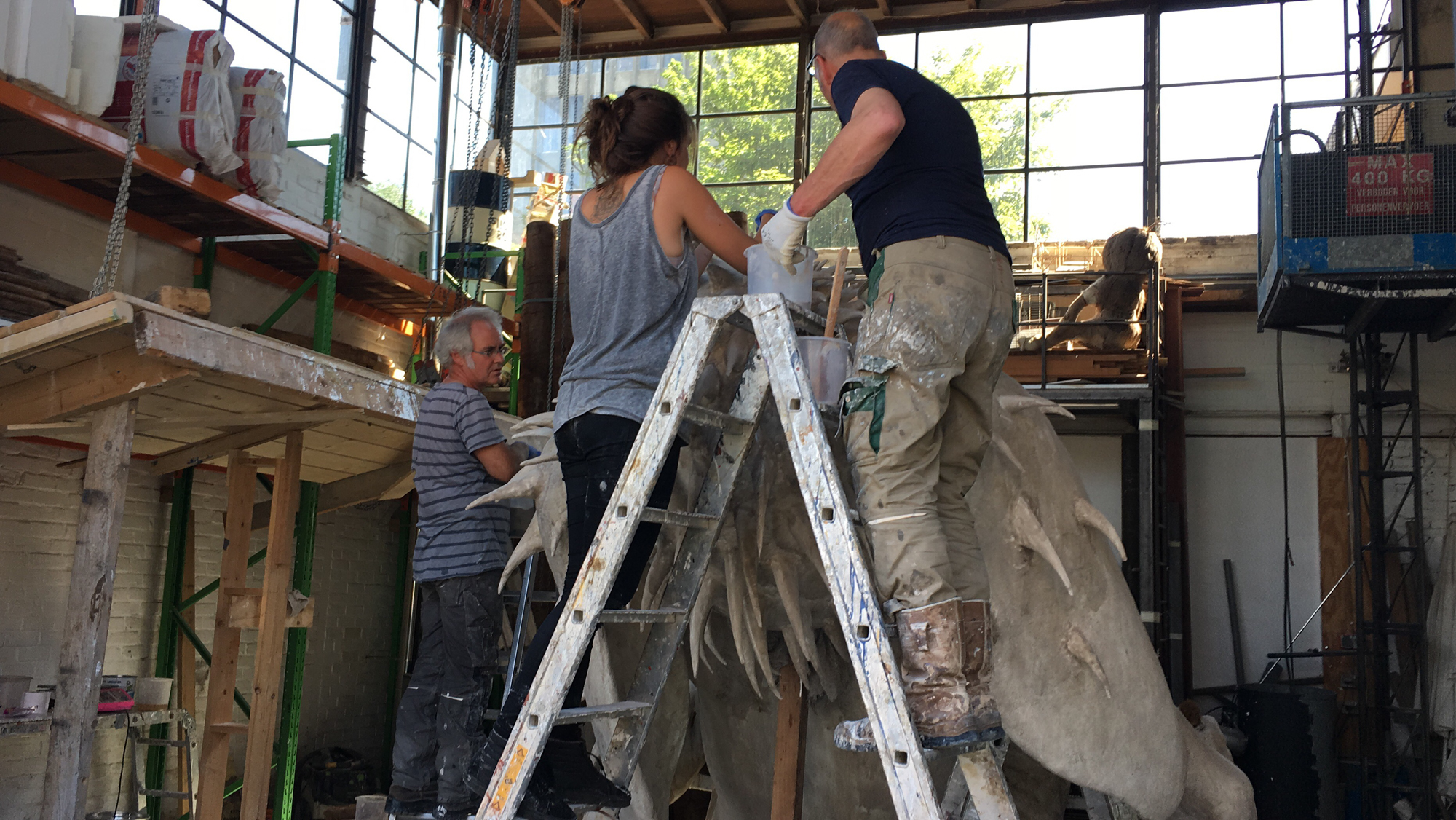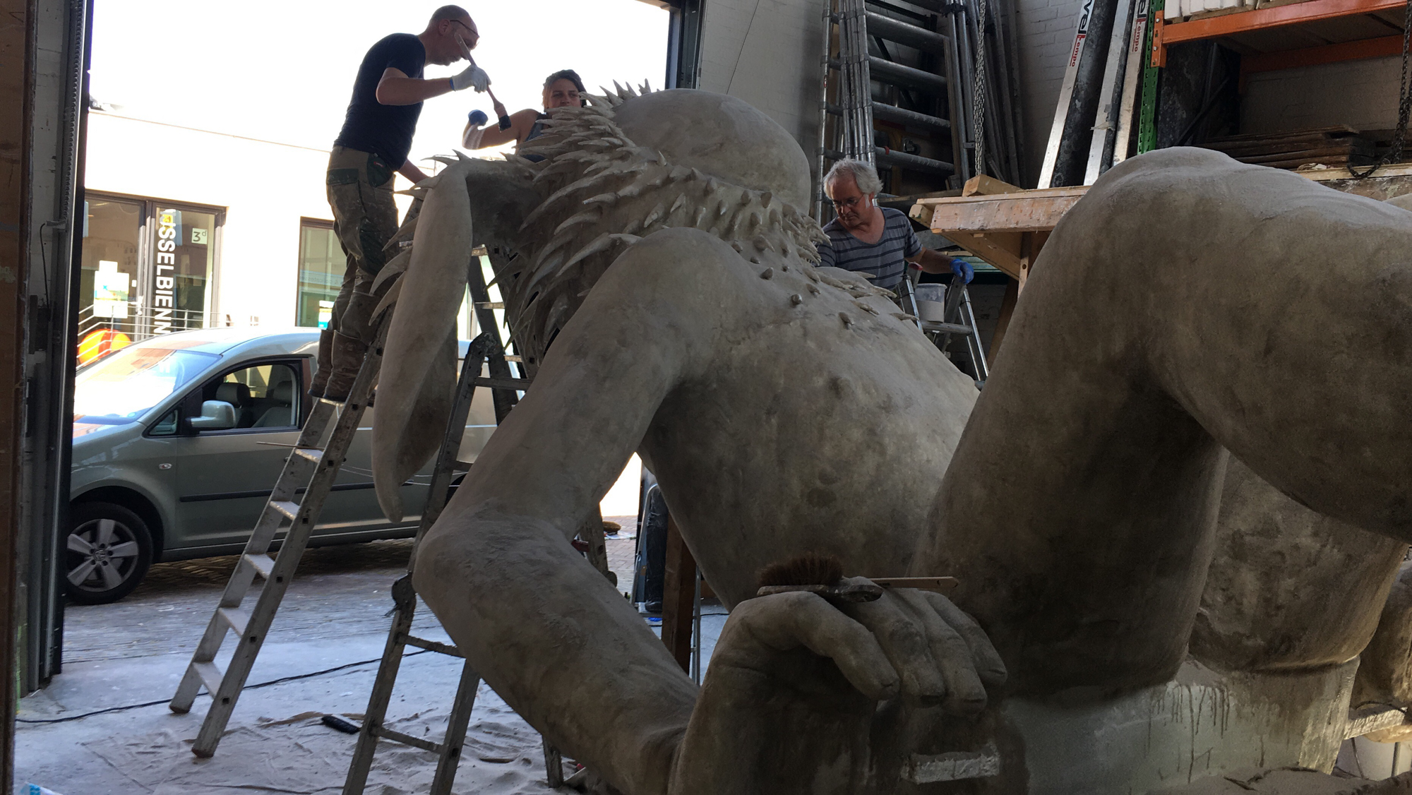 Beter laat dan nooit…maar nadat we woensdag de 17e mei een dagje strand hadden georganiseerd met de meiden, bij een  33 ºC en een luchtvochtigheidsgraad van ca. 98%, waren we zo stuk dat Paul 3 dagen later de boot gepakt heeft en naar Zweden is vertrokken, om daar voorlopig even niet meer na te hoeven denken over 8 meter hoge beelden op een dak. Maar goed ondertussen hebben we alles op z’n plek gezet met onze kleine vriend en is tijdens het dagje uit de zandhuid aangebracht, op de hand , dat wel. En daar hebben we assistentie bij gekregen, van Suzanne en Marit en Miriam uit Groningen, samengepropt in die kleine rokende Fiat Punto. Het was een bloedhete dag en we hebben flink wat strand door de handen laten gaan, maar vriend GOD is nu wel verschoten van een lief engeltje naar een zo mogelijk duisterder exemplaar. Kan niet wachten tot 12 juni, voor z’ date met het gemaal bij Nijebeek. wordt vervolgd