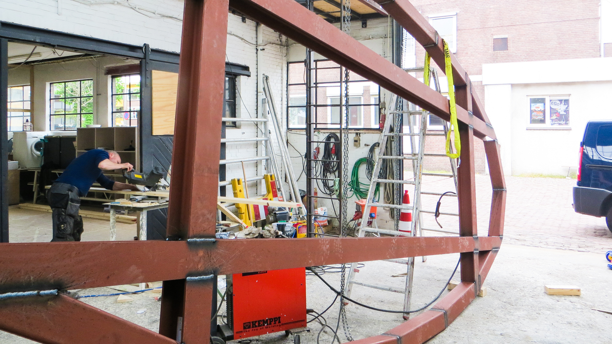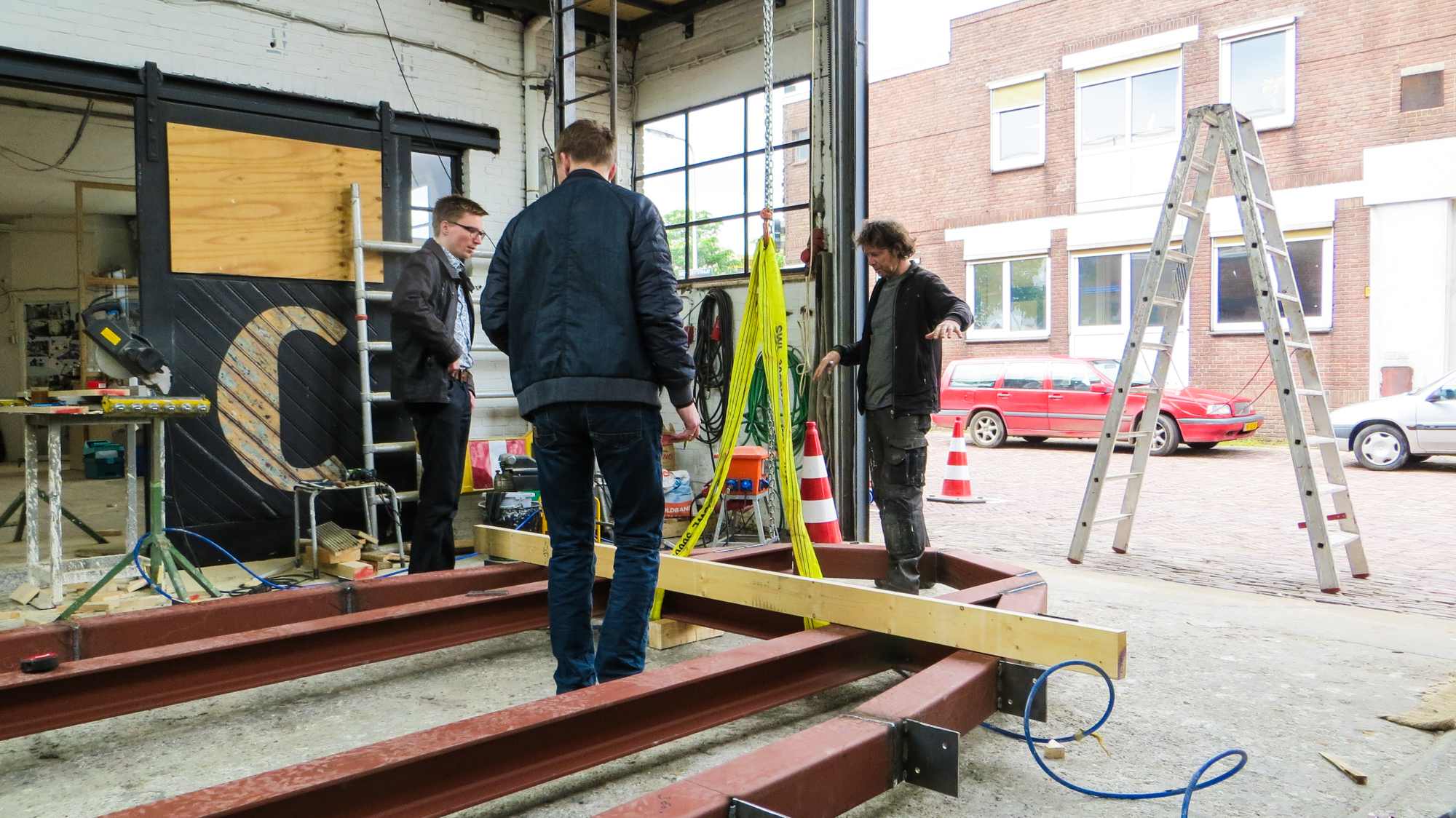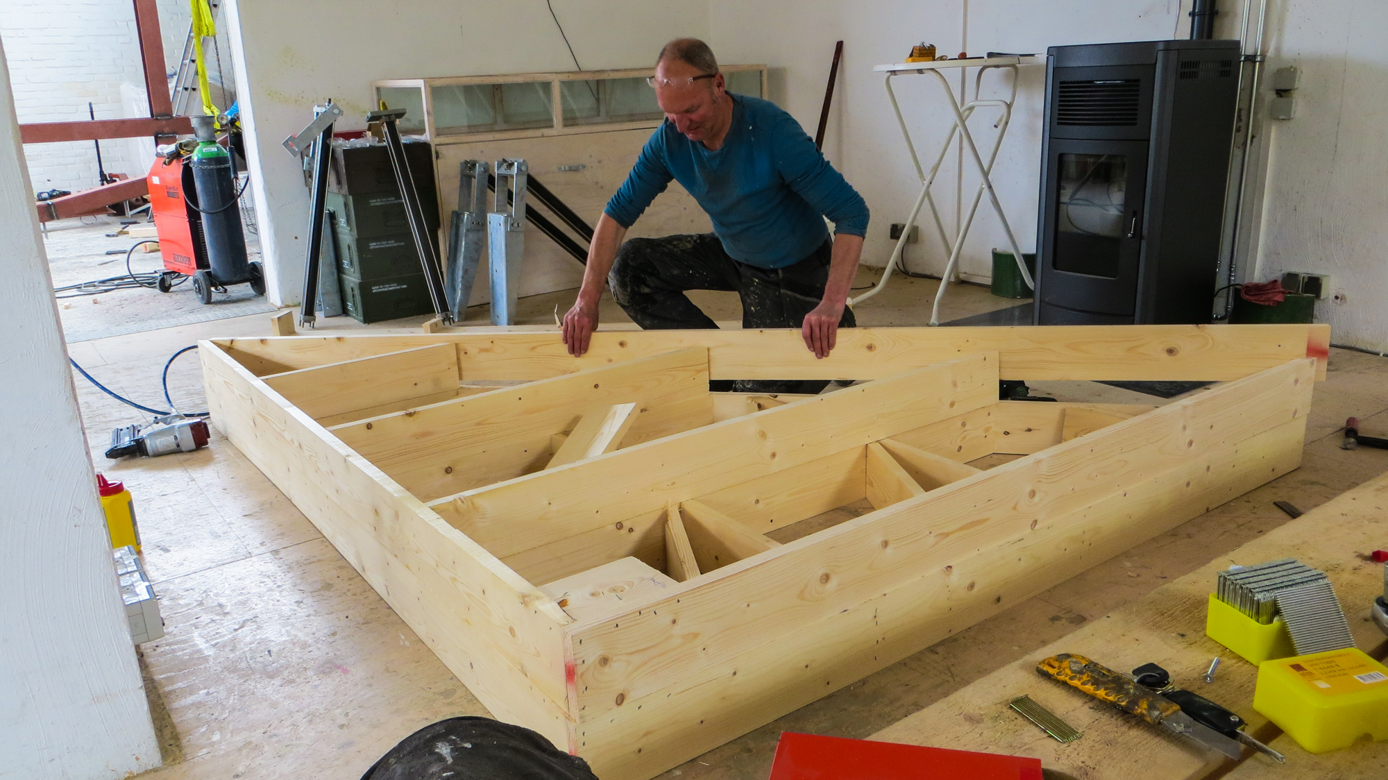 Kregen we afgelopen woensdag de vloer van de Lucy GLXY in onderdelen aangevoerd , alles keurig op maat gesneden , gezaagd en gehecht , hebben we vrijdag en vandaag flink de lasmachine laten zweten om de het geheel af te lassen en een begin te maken met de houten vloer . Ondertussen is collega Keizer flink aan het timmeren aan zijn duivenhok , die bovenop de trapopgang komt te staan en ik moet zeggen , dat gaat nog een flinke ervaring worden als je naar de Lucy gaat . Vandaag nog even bezoek gehad van de bouwkundige en de architect van Studio Groen & Schild , die al het tekenwerk hebben verricht voor de Lucy en nu dus ook in het echie komen kijken, hoe of dat ze er uit gaat zien en gelukkig bleek ook hier theorie en praktijk twee verschillende werelden . Hopelijk morgen aan de slag met de ribben , dan kunnen we met de wanden beginnen . Goed , binnenkort verder .