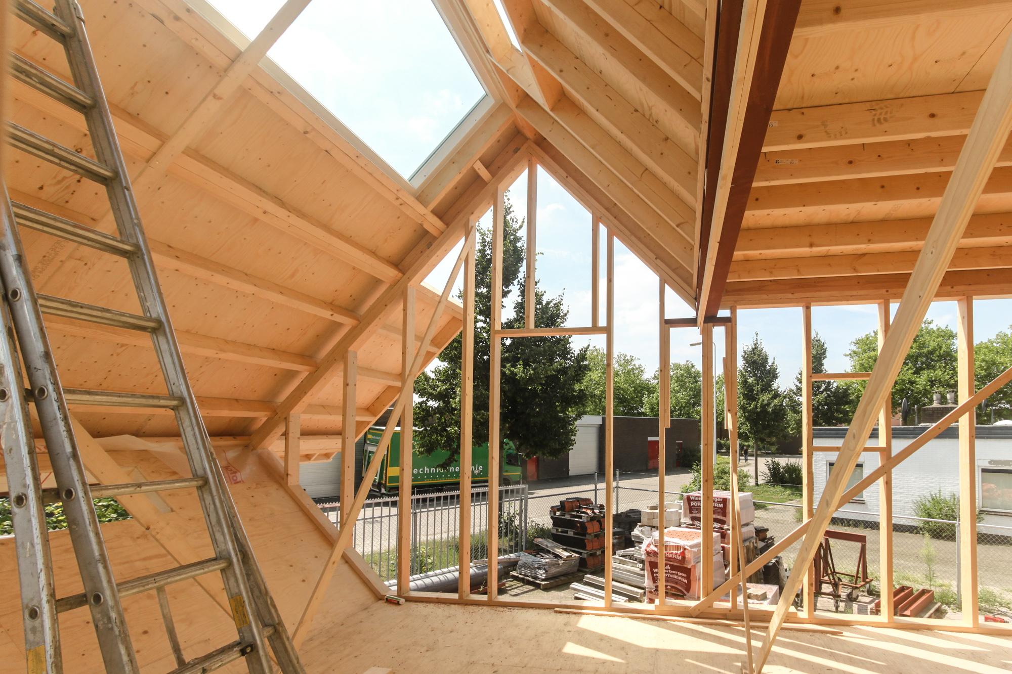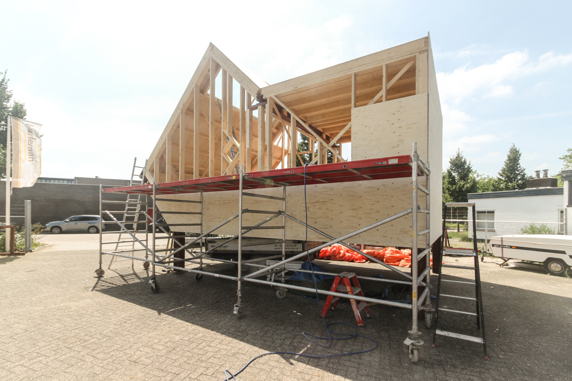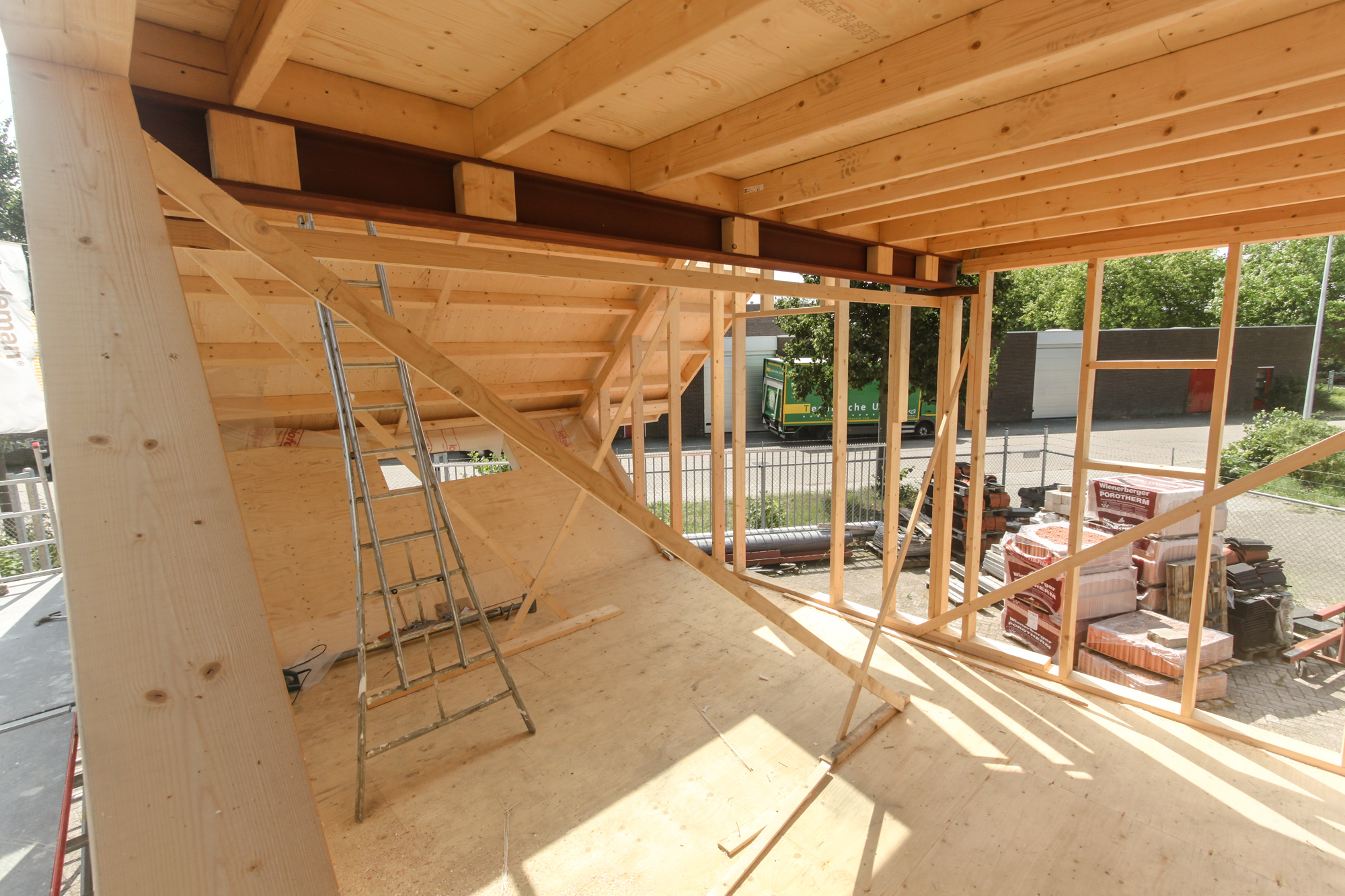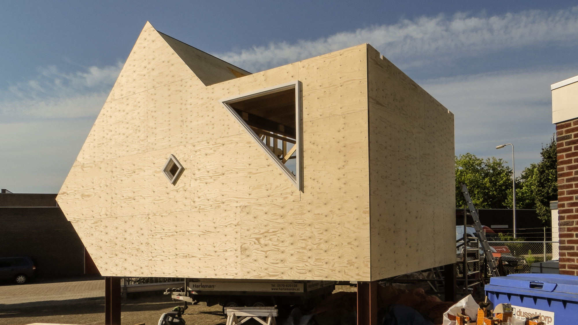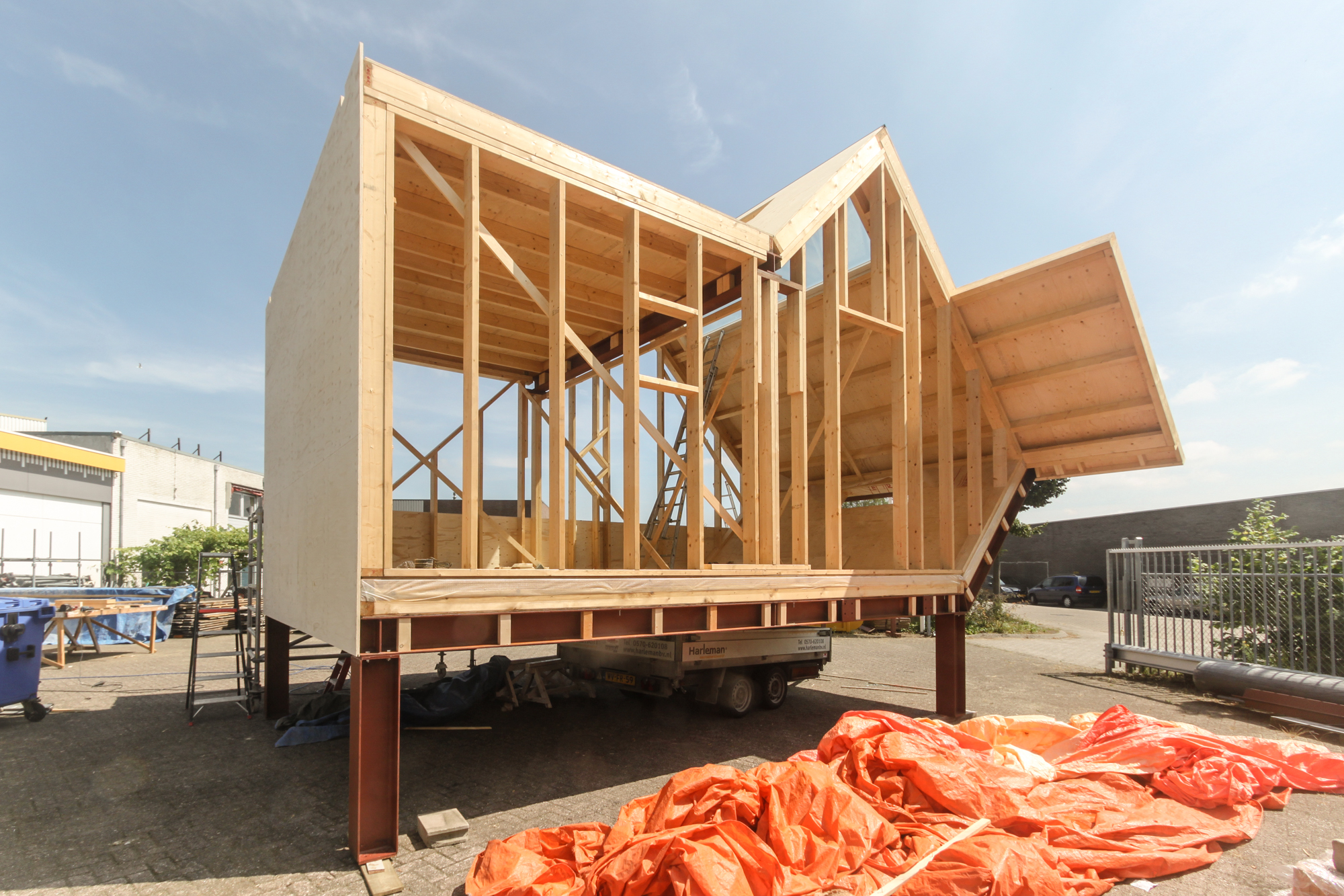 Maurer United & Boris Tellegen zijn de ontwerpers van LucyPWR , en zo als het zich nu laat aanzien aanhangers van de all American Homestead traditie , want het mag gezegd worden ein fabelhafte stadsvilla annex Little House on the Prairy begint zich te ontvouwen op het terrein aan de Staverenstraat bij Theo Harleman . Maar dan wel American Graffitti meets Mondriaan , want hoewel we nu kijken naar de echt prachtige constructieve opbouw van LucyPWR speelt Boris straks nog een aanzienlijke rol bij het aanbrengen van de huid , in de vorm van planken , hout etc. maar dan wel Boris’ stijl . LucyPWR is bijna wind en waterdicht met een deur die op slot kan en gaat volgende week geplaatst worden aan de Mr de Boerlaan , gezellig tussen de al bestaande nieuwbouw , ter hoogte van container Mai Han ( waar overigens de vloer van de Alpha tent ligt te drogen ) Goed,……. inmiddels zit ook LucyGLXY in de kleren en laten we daar morgen wat opgewonden kiekjes van zien ,plus as maandag de 28e gaat ze het dak op om ca 12.00 uur . Tot dan………