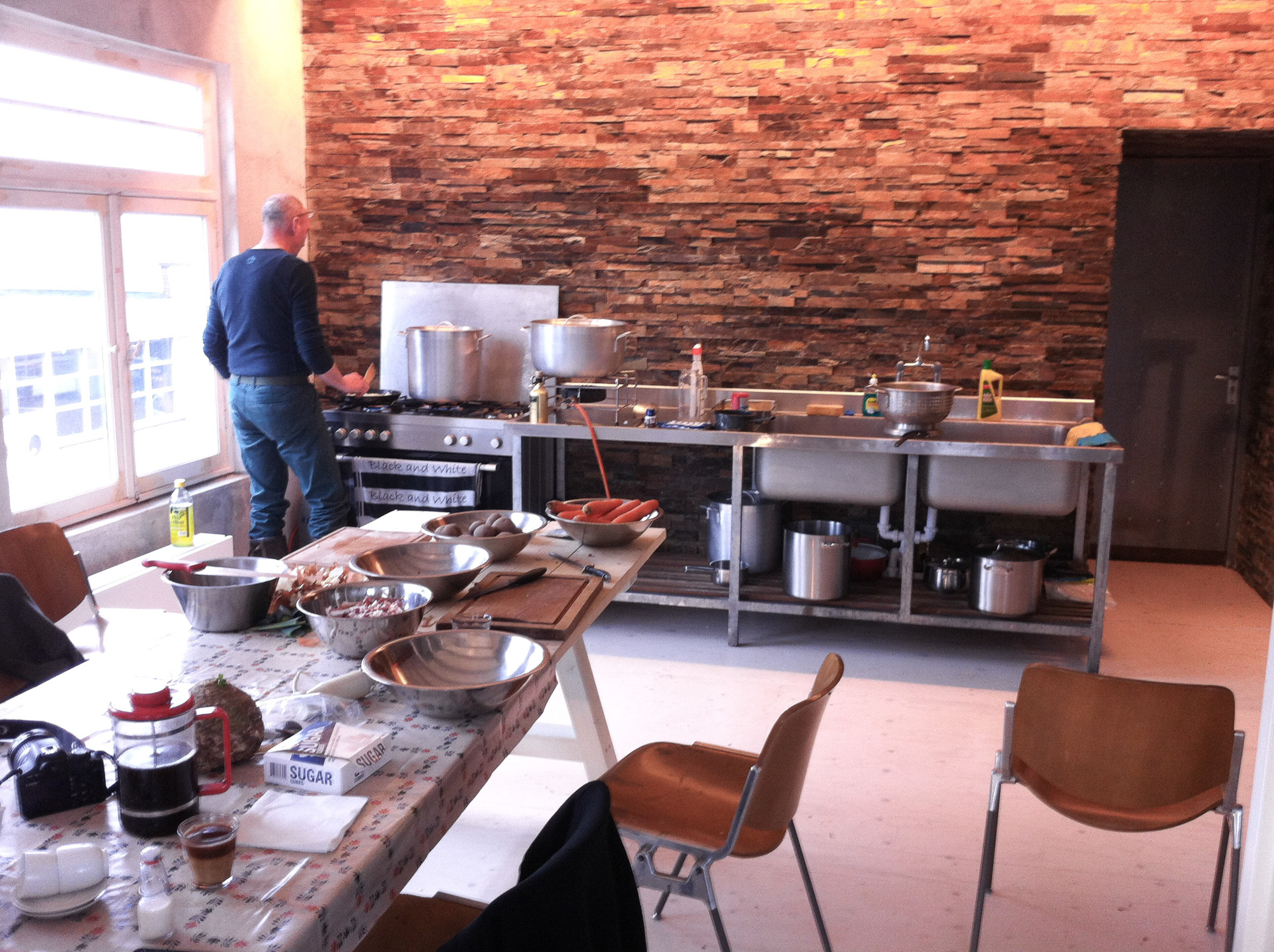 En vandaag even snel de zaken omgegooid , want ipv deuren repareren, wandjes stuken en vooral veel aan de telefoon hangen , hebben we ons opgesloten in de keuken om een begin te maken met Lucy’s Sn∅rt . Eerst naar de markt voor 6 kg spliterwten , 2 kg uien , 2kg aardappelen , 4 preien, 1 knolselderij , 2 kg winterwortels en Oh shit ,de peterselie vergeten morgen dan maar . Daarna pannen uit de kast , op het vuur , schillen , hakken ,snijden , bakken en braden . 5 uur later staat de sn∅rt langzaam gaar te worden in het koude water . Lucy Lust Sn∅rt 16 februari van 12.00 – 18.00 . Eet smakelijk !