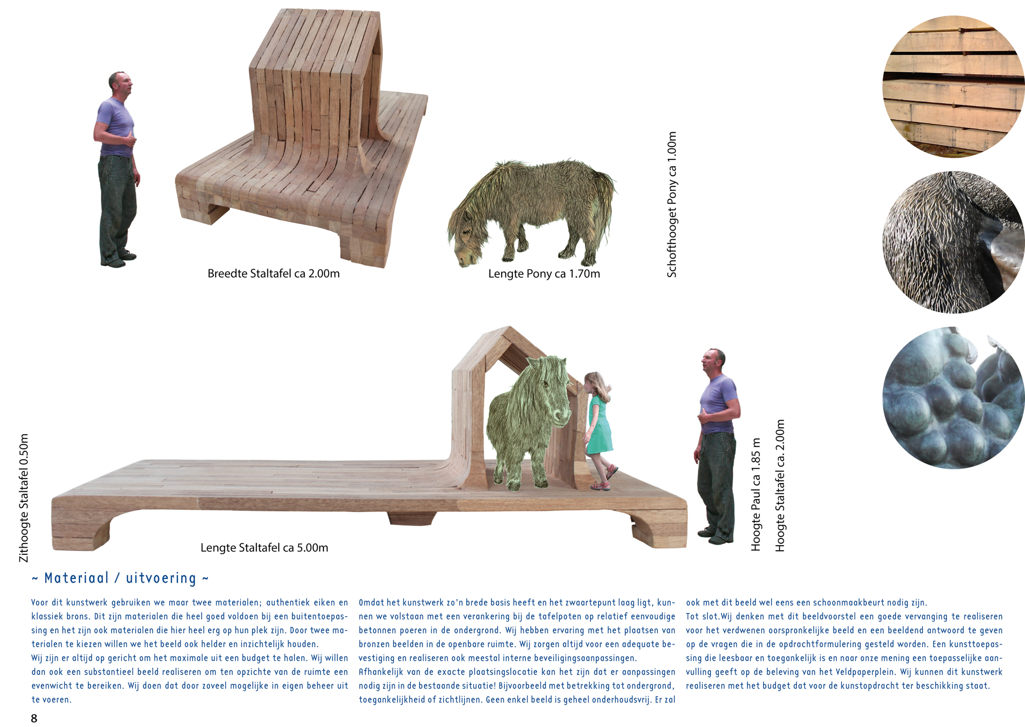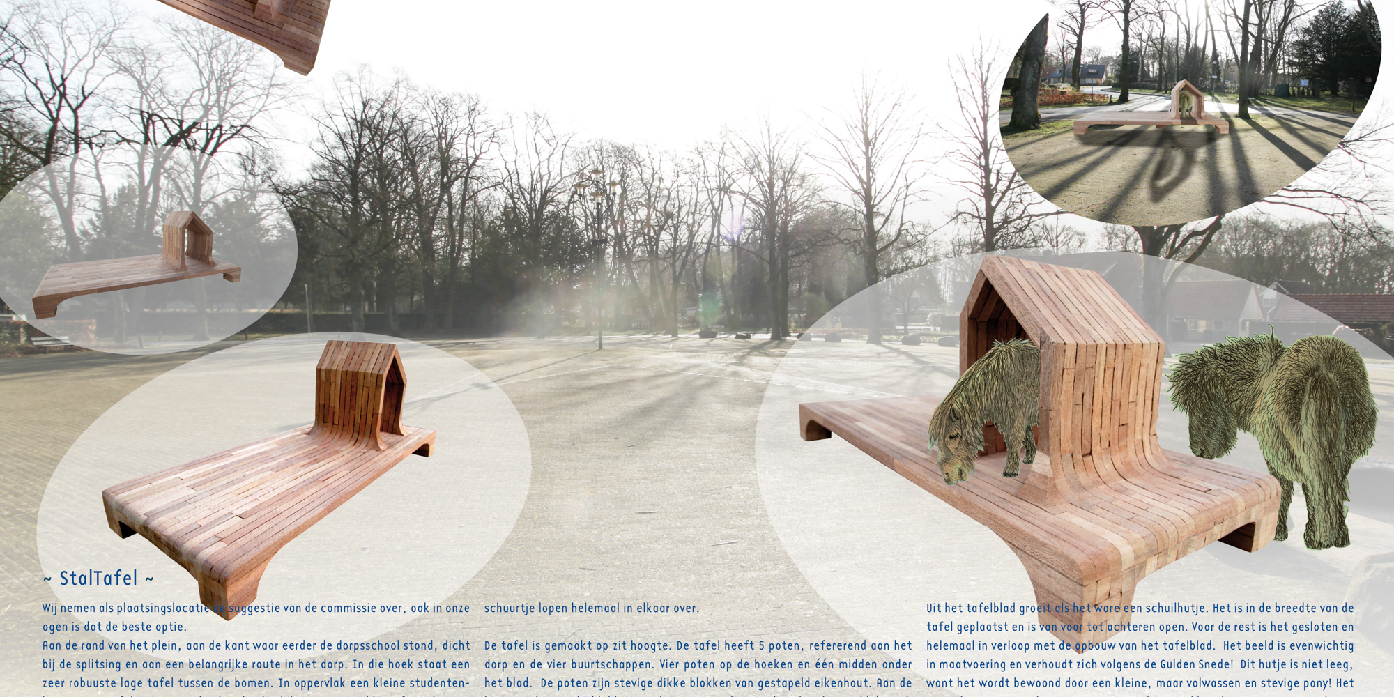 Werd het na 2 jaar renoveren, verbouwen, hotelmanagement en losse eindjes plakken, niet eens tijd om weer serieus werk aan het werk te gaan? Ik bedoel dan, hakken, breken, lijmen, timmeren, plakken, Uhhh…kunst maken dus. Juist. En dat gaan we zeker doen, want na een lichte periode van trial & error, dachten we even onze Mojo kwijt te zijn, maar nee daar was’tie dan toch echt. Om het hoekje stond t’ie te wachten op ons, mooie opdracht in de bek, slingerend met z’n staartje en de kuif in het vet. Inderdaad we mogen weer aan het werk, redelijk dichtbij namelijk voor het Veldpaperplein in Colmschate. En wat hebben we daarvoor bedacht? Een stoere tafel met schuilstal & Pony, de Staltafel…. Robuuste eiken balken uit eigen tuin, nou ja uit de tuin van de buren dan, de Bannink of het Ijssellandschap vermoedelijk en de Shetlander uit de stal van Kemner uit Cuijk. Goed binnenkort vast meer….