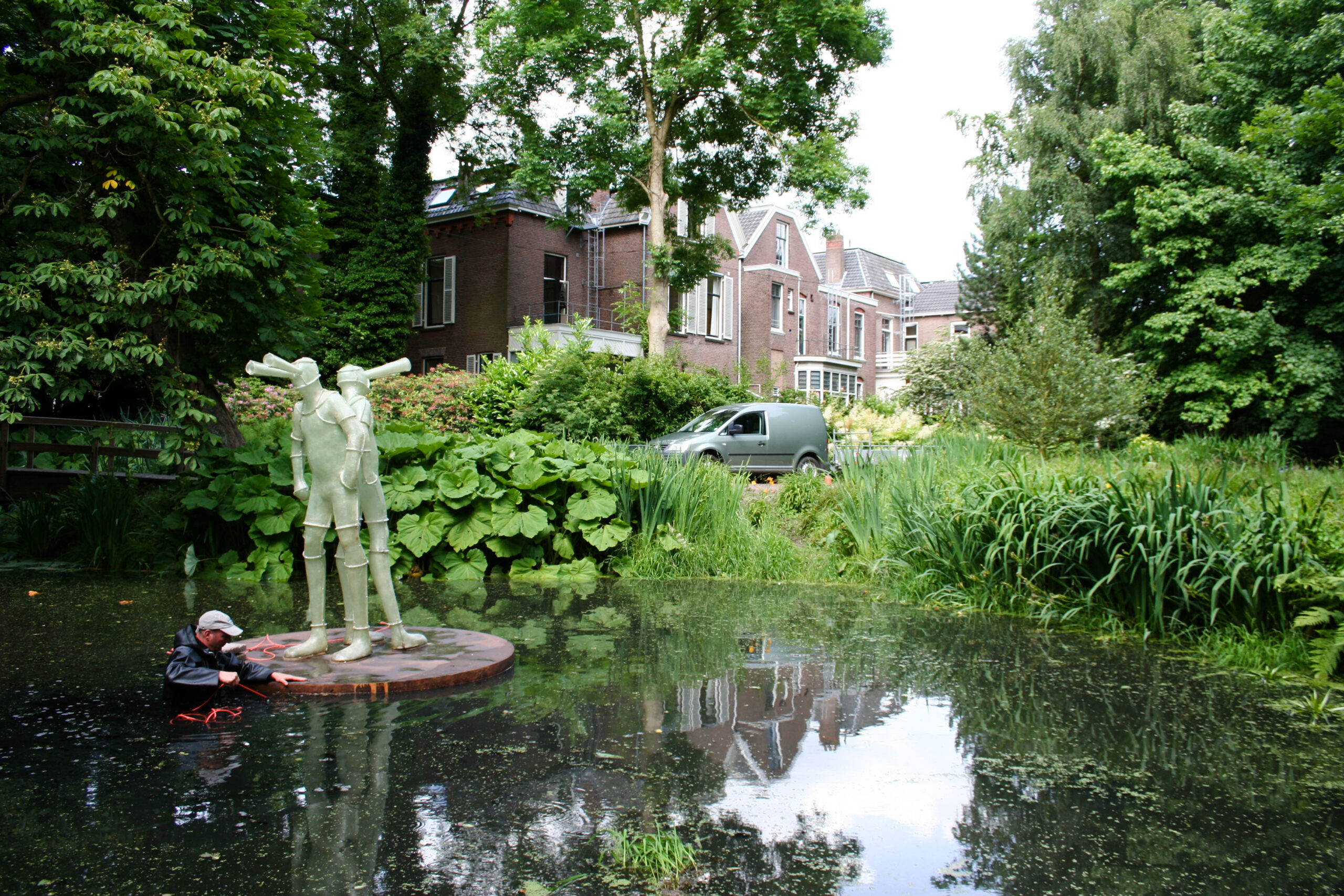 Rug aan rug staan twee lange mannen als wachters in de verte te turen.