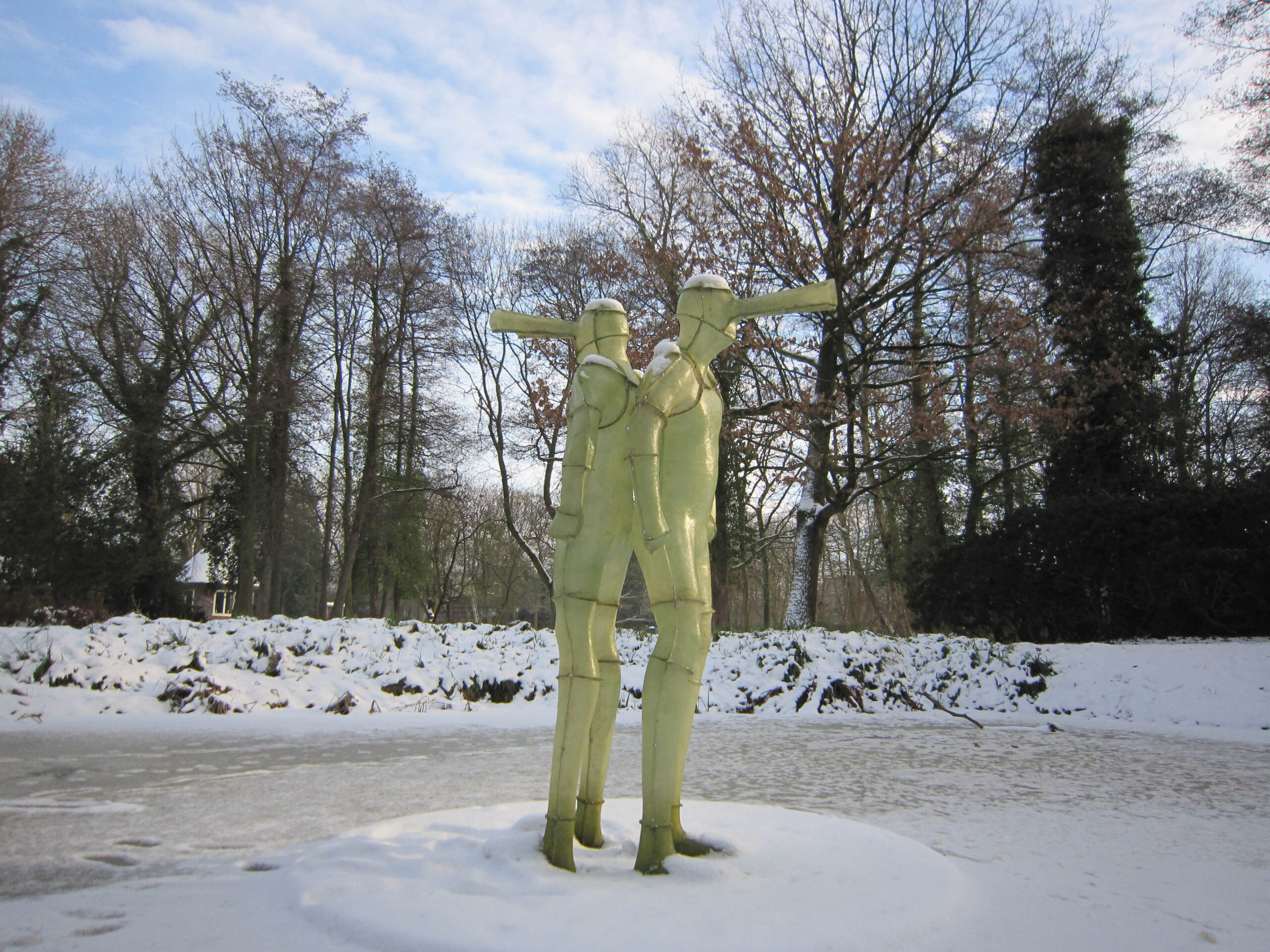 Hun houding is alert en waakzaam, zo duidelijk weerbaar stellen zij zich op. Tegelijk zoeken zij duidelijke steun en vertrouwen bij elkaar, zij kunnen er niet alleen voor staan. Een beetje onbeholpen met hun lichaam dubben zij over hun eigen kracht of kwetsbaarheid.