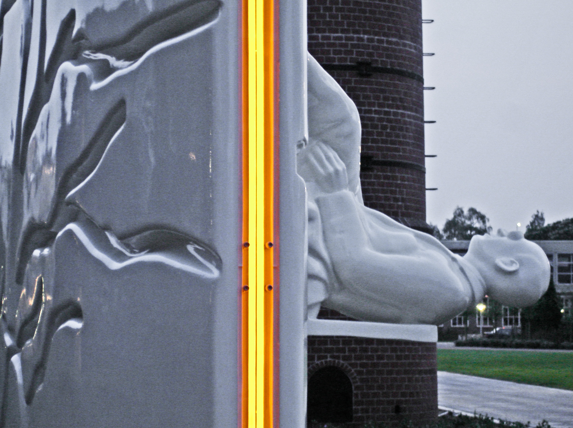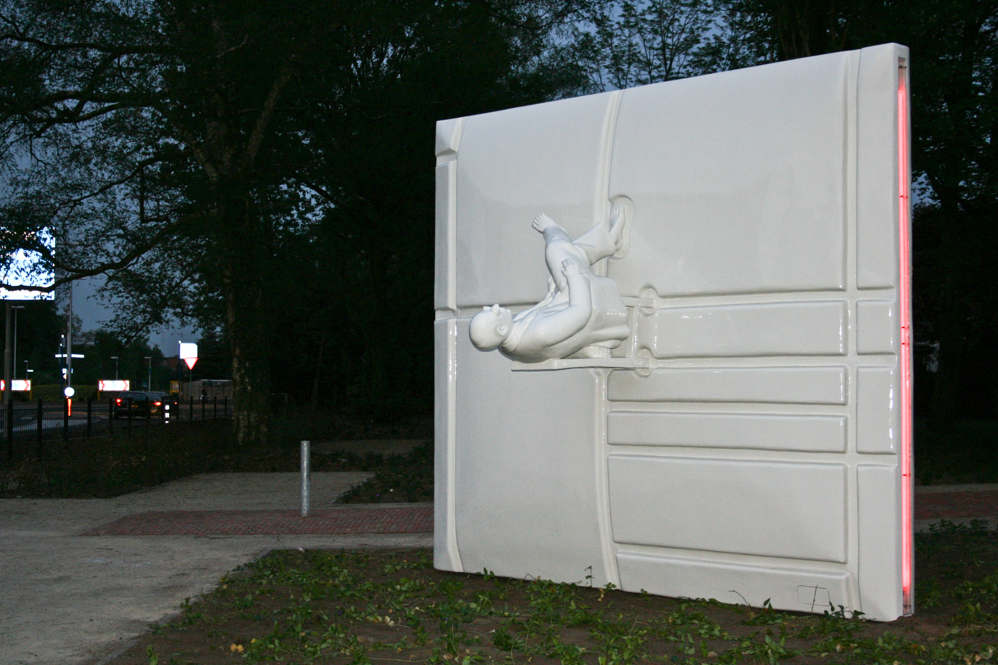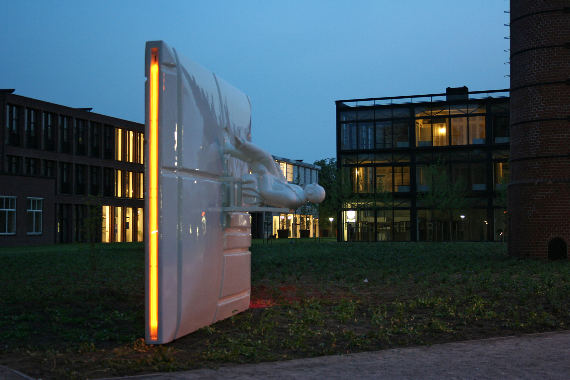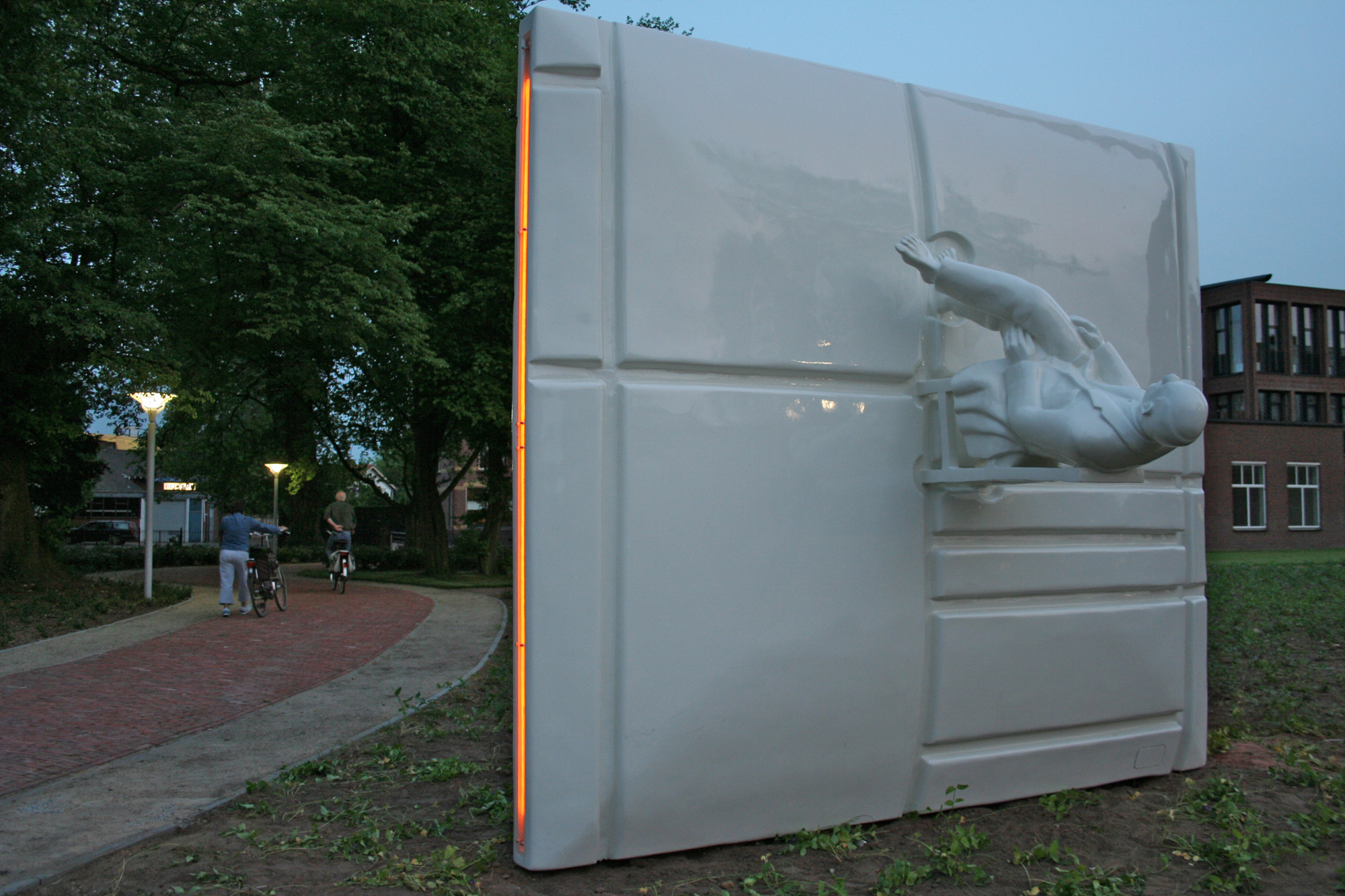 Op de stoel zit een man. Een figuratie van Mondriaan. Hij zit ‘gewoon’ op de stoel. Maar door de positie van de stoel is zijn bovenlichaam voor de toeschouwer in een horizontale positie. Daardoor zijn de benen naar de bovenzijde van de wand gericht. Mondriaan heeft de benen over elkaar geslagen en de handen rusten op de bovenbenen. Hij heeft blote voeten en zijn linkervoet staat op de wand in een vergelijkbaar kommetje als de stoelpoten. Hij kijkt, zoals hij altijd deed. En nu, door z’n positie in dit beeld, kijkt hij naar de lucht. Zijn hoofd bevindt zich, in de horizontale positie zoals hij nu op de wand zit, op ooghoogte van een gemiddelde man ( circa 1,80 meter ). Dichtbij en aanraakbaar, maar toch verheven. Het totaal van wand èn figuur is één naadloos geheel. Uitgevoerd in een gladde, glanzende kunststof. Door ook voor alles één monochrome witte kleur te gebruiken, is er werkelijk sprake van een geheel. Er is, los van de vorm, geen onderscheid. Het één komt uit het ander voort. Normaal gesproken verdwijnt s’avonds geleidelijk aan de kleur uit de wereld. Bij dit beeld is het anders. Wij willen het beeld op alle momenten van de dag aanwezig laten zijn. Daarom is in de dunne zijkanten en de bovenkant van de wand, per kant een neon-kleurlicht verwerkt. Terwijl overdag het beeld een wit geheel is, lichten (alleen) s’avonds de ‘Mondriaan’ kleuren geel, blauw en rood op.