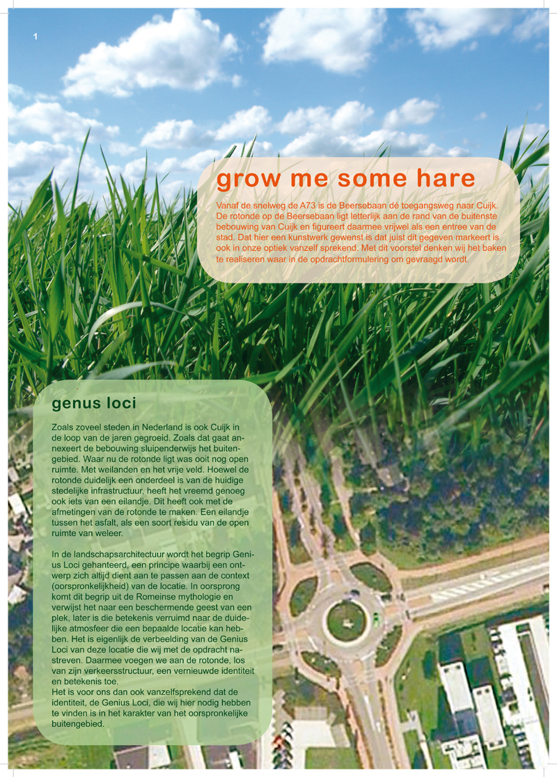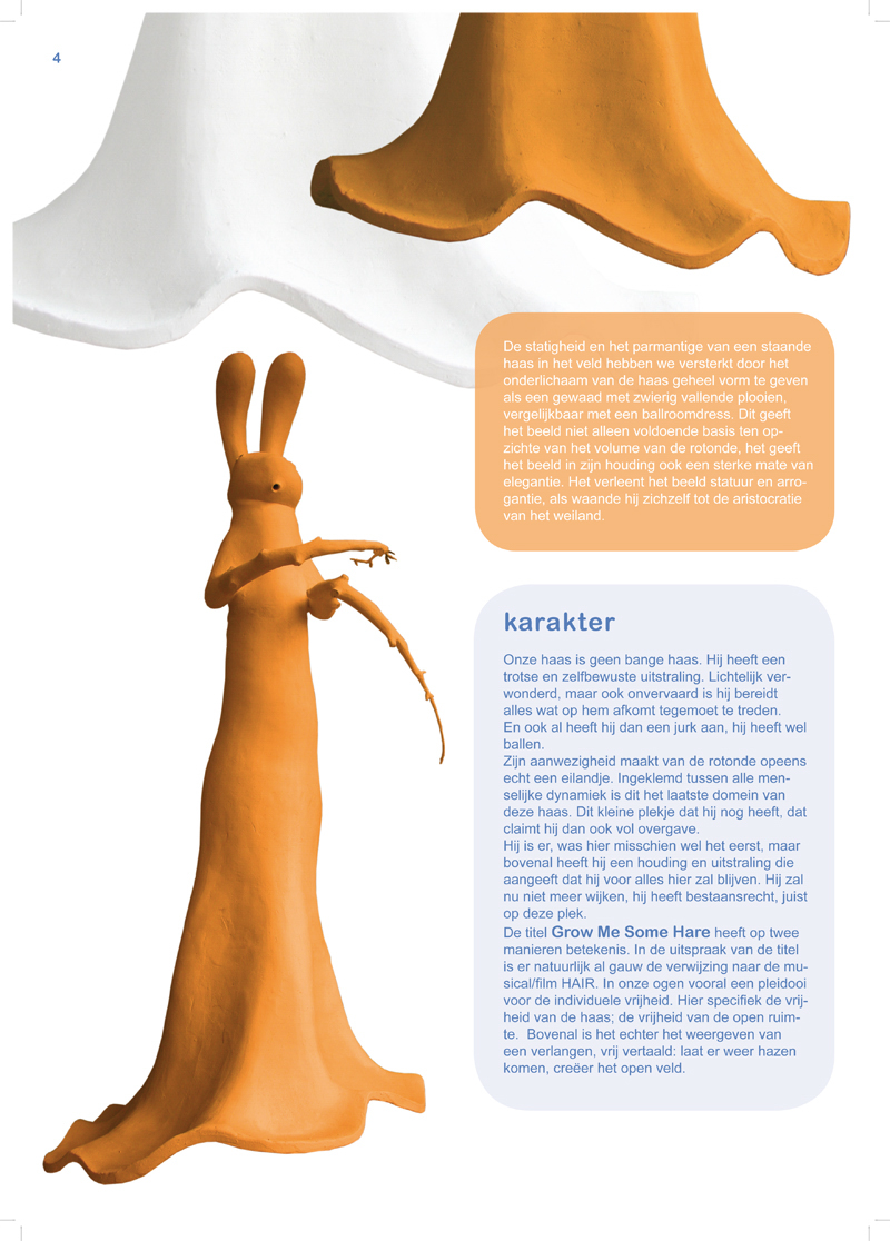 Onze haas is geen bange haas. Hij heeft een trotse en zelfbewuste uitstraling. Lichtelijk verwonderd, maar ook onvervaard is hij bereidt alles wat op hem afkomt tegemoet te treden. En ook al heeft hij dan een jurk aan, hij heeft wel ballen. Zijn aanwezigheid maakt van de rotonde opeens echt een eilandje. Ingeklemd tussen alle menselijke dynamiek is dit het laatste domein van deze haas. Dit kleine plekje dat hij nog heeft, dat claimt hij dan ook vol overgave. Hij is er, was hier misschien wel het eerst, maar bovenal heeft hij een houding en uitstraling die aangeeft dat hij voor alles hier zal blijven. Hij zal nu niet meer wijken, hij heeft bestaansrecht, juist op deze plek. De titel Grow Me Some Hare heeft op twee manieren betekenis. In de uitspraak van de titel is er natuurlijk al gauw de verwijzing naar de musical/ film HAIR. In onze ogen vooral een pleidooi voor de individuele vrijheid. Hier specifiek de vrijheid van de haas; de vrijheid van de open ruimte. Bovenal is het echter het weergeven van een verlangen, vrij vertaald: laat er weer hazen komen, creëer het open veld. De statigheid en het parmantige van een staande haas in het veld hebben we versterkt door het onderlichaam van de haas geheel vorm te geven als een gewaad met zwierig vallende plooien, vergelijkbaar met een ballroomdress. Dit geeft het beeld niet alleen voldoende basis ten opzichte van het volume van de rotonde, het geeft het beeld in zijn houding ook een sterke mate van elegantie. Het verleent het beeld statuur en arrogantie, als waande hij zichzelf tot de aristocratie van het weiland.