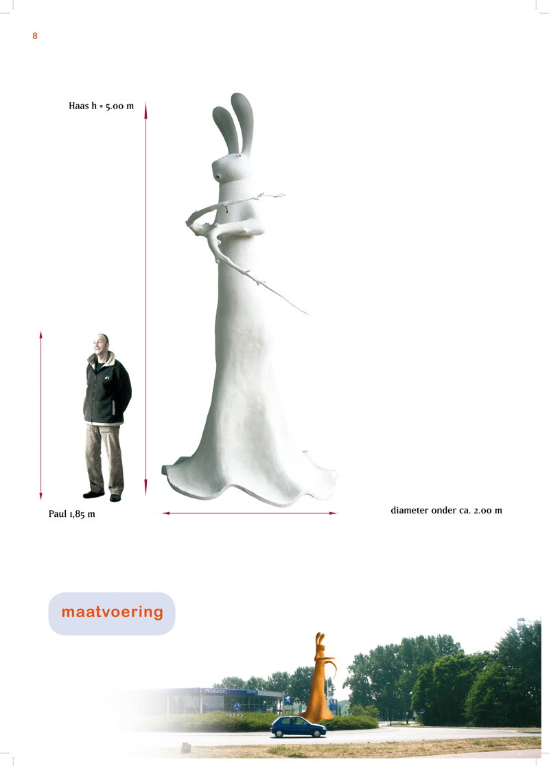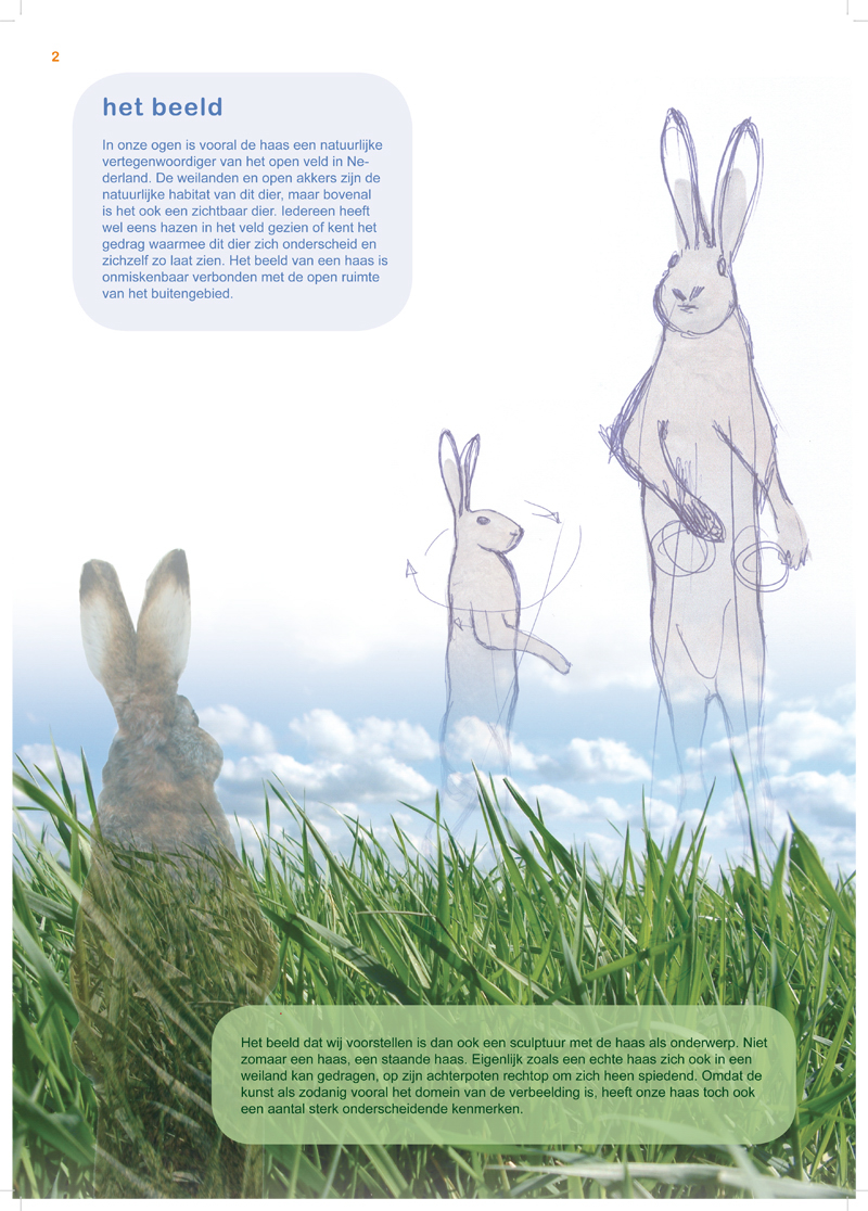Het beeld dat wij voorstellen is dan ook een sculptuur met de haas als onderwerp. Niet zomaar een haas, een staande haas. Eigenlijk zoals een echte haas zich ook in een weiland kan gedragen, op zijn achterpoten rechtop om zich heen spiedend. Omdat de kunst als zodanig vooral het domein van de verbeelding is, heeft onze haas toch ook een aantal sterk onderscheidende kenmerken. het beeld In onze ogen is vooral de haas een natuurlijke vertegenwoordiger van het open veld in Nederland. De weilanden en open akkers zijn de natuurlijke habitat van dit dier, maar bovenal is het ook een zichtbaar dier. Iedereen heeft wel eens hazen in het veld gezien of kent het gedrag waarmee dit dier zich onderscheid en zichzelf zo laat zien. Het beeld van een haas is onmiskenbaar verbonden met de open ruimte van het buitengebied.