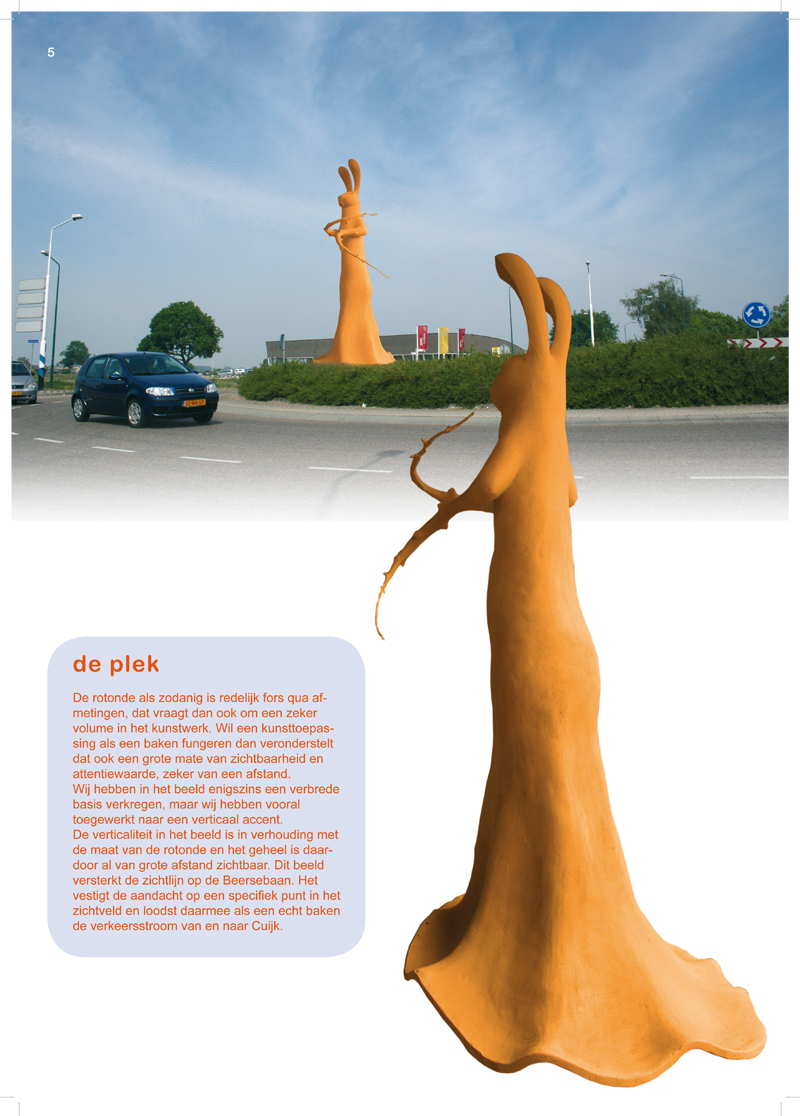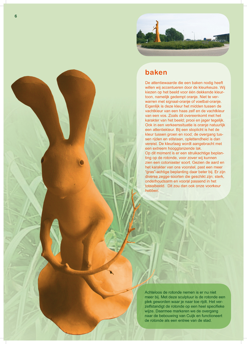 De attentiewaarde die een baken nodig heeft willen wij accentueren door de kleurkeuze. Wij kiezen op het beeld voor één dekkende kleurtoon, namelijk gedempt oranje. Niet te verwarren met signaal-oranje of voetbal-oranje. Eigenlijk is deze kleur het midden tussen de vachtkleur van een haas zelf en de vachtkleur van een vos. Zoals dit overeenkomt met het karakter van het beeld; prooi en jager tegelijk. Ook in een verkeerssituatie is oranje natuurlijk een attentiekleur. Bij een stoplicht is het de kleur tussen groen en rood; de overgang tussen rijden en stilstaan, oplettendheid is dan vereist. De kleurlaag wordt aangebracht met een extreem hoogglanzende lak. Op dit moment is er een struikachtige beplanting op de rotonde, voor zover wij kunnen zien een cotoneaster soort. Gezien de aard en het karakter van ons voorstel, past een meer “gras”-achtige beplanting daar beter bij. Er zijn diverse zegge-soorten die geschikt zijn; sterk, onderhoudsarm en vooral passend in het totaalbeeld. Dit zou dan ook onze voorkeur hebben. Achteloos de rotonde nemen is er nu niet meer bij. Met deze sculptuur is de rotonde een plek geworden waar je naar toe rijdt. Het verzelfstandigt de rotonde op een heel specifieke wijze. Daarmee markeren we de overgang naar de bebouwing van Cuijk en functioneert de rotonde als een entree van de stad.