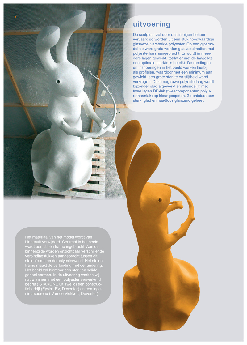 De sculptuur zal door ons in eigen beheer vervaardigd worden uit één stuk hoogwaardige glasvezel versterkte polyester. Op een gipsmodel op ware grote worden glasvezelmatten met polyesterhars aangebracht. Er wordt in meerdere lagen gewerkt, totdat er met de laagdikte een optimale sterkte is bereikt. De rondingen en insnoeringen in het beeld werken hierbij als profielen, waardoor met een minimum aan gewicht, een grote sterkte en stijfheid wordt verkregen. Deze nog ruwe polyesterlaag wordt bijzonder glad afgewerkt en uiteindelijk met twee lagen DD-lak (tweecomponenten polyurethaanlak) op kleur gespoten. Zo ontstaat een sterk, glad en naadloos glanzend geheel. Het materiaal van het model wordt van binnenuit verwijderd. Centraal in het beeld wordt een stalen frame ingebracht. Aan de binnenzijde worden onzichtbaar verschillende verbindingstukken aangebracht tussen dit stalenframe en de polyesterwand. Het stalen frame maakt de verbinding met de fundering. Het beeld zal hierdoor een sterk en solide geheel vormen. In de uitvoering werken wij nauw samen met een polyester verwerkend bedrijf ( STARLINE uit Twello) een constructiebedrijf (Eysink BV, Deventer) en een ingenieursbureau ( Van de Vlekkert, Deventer)