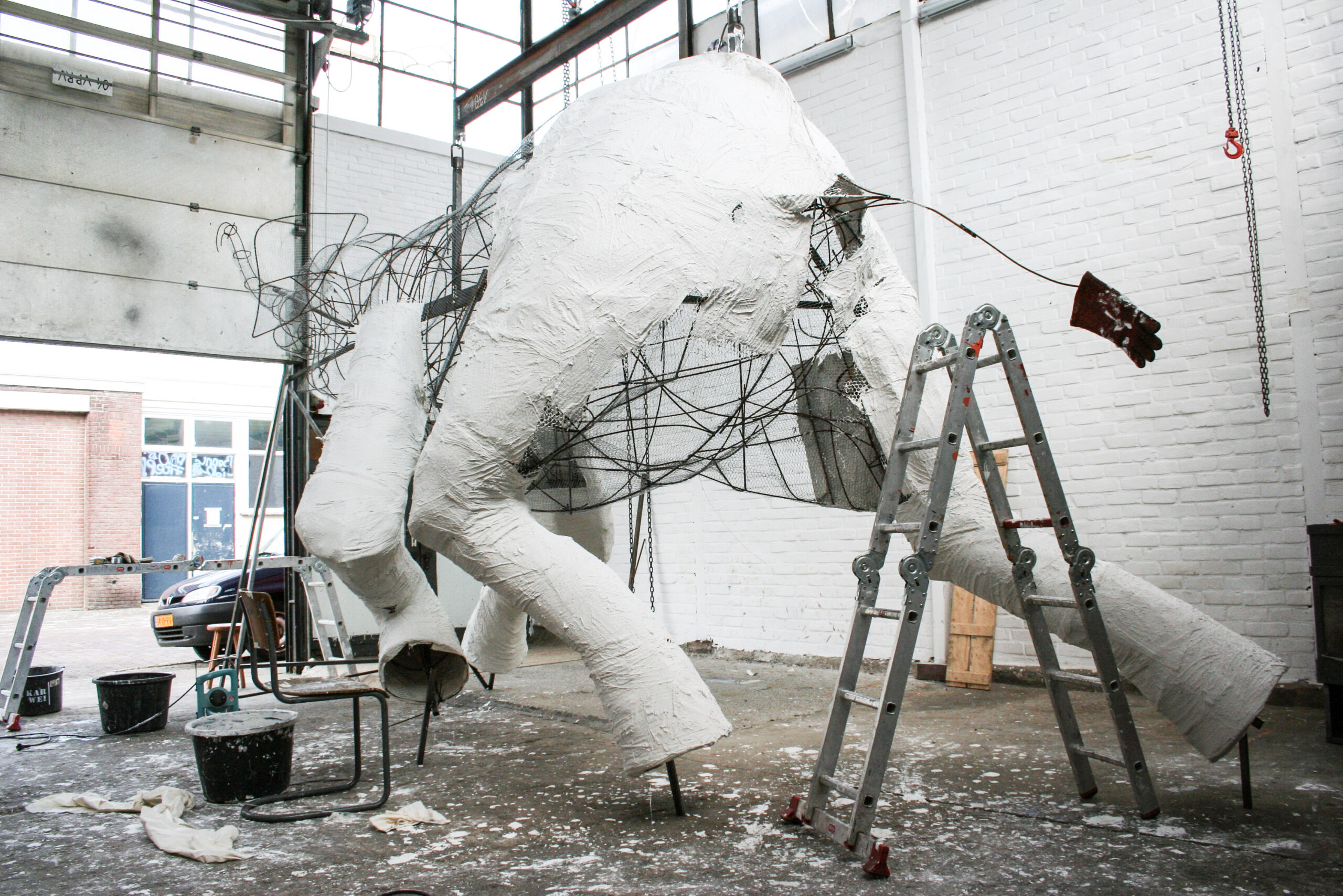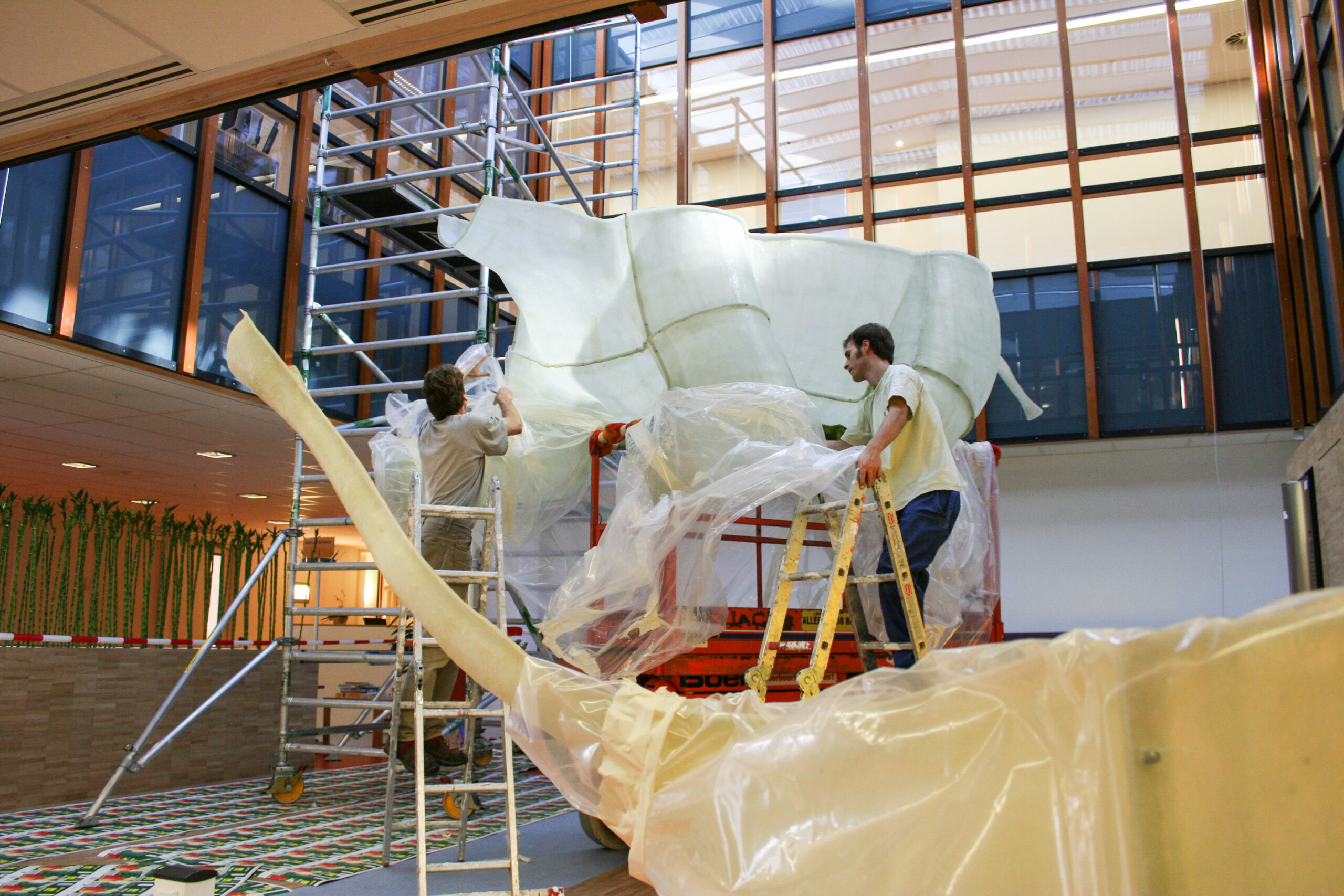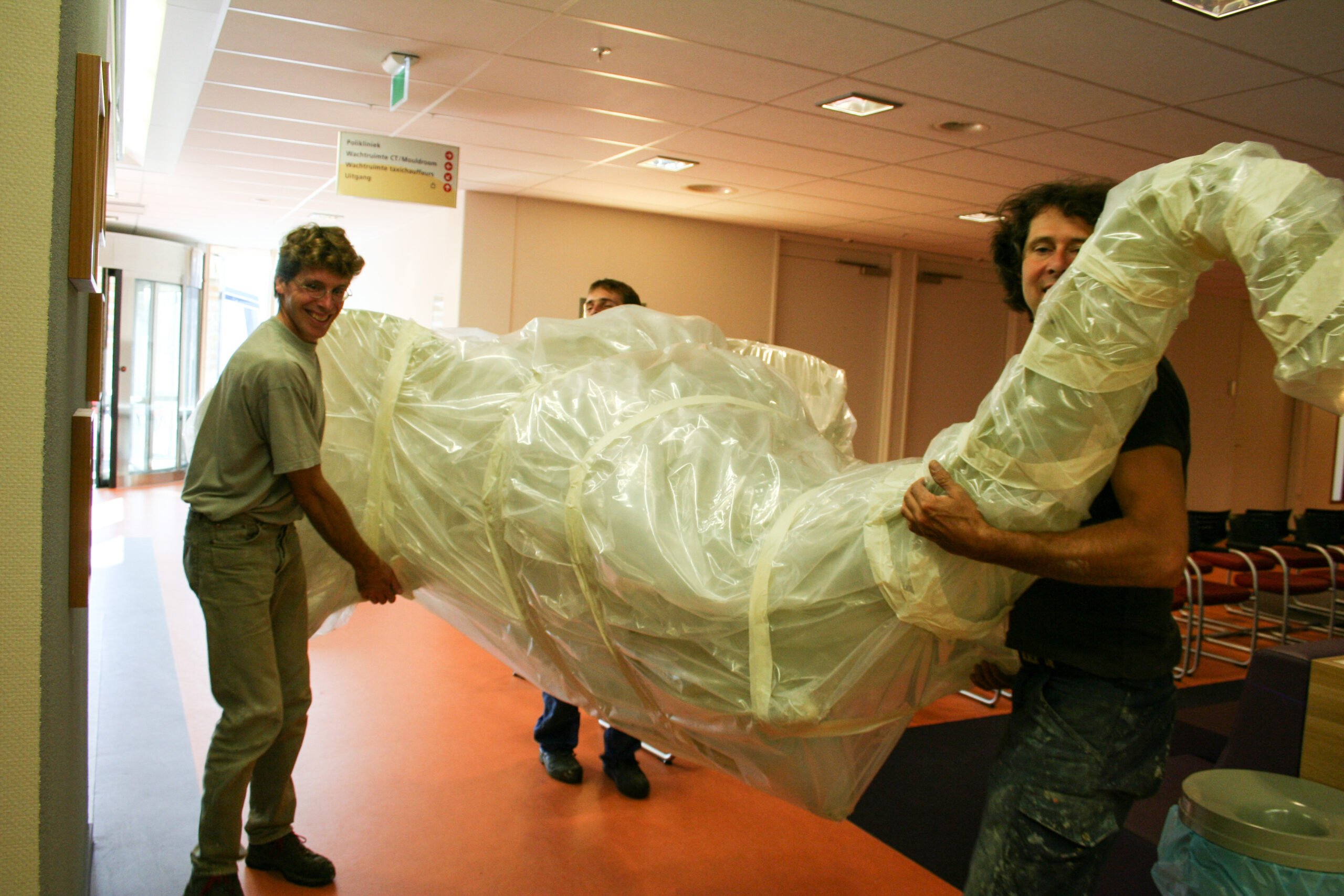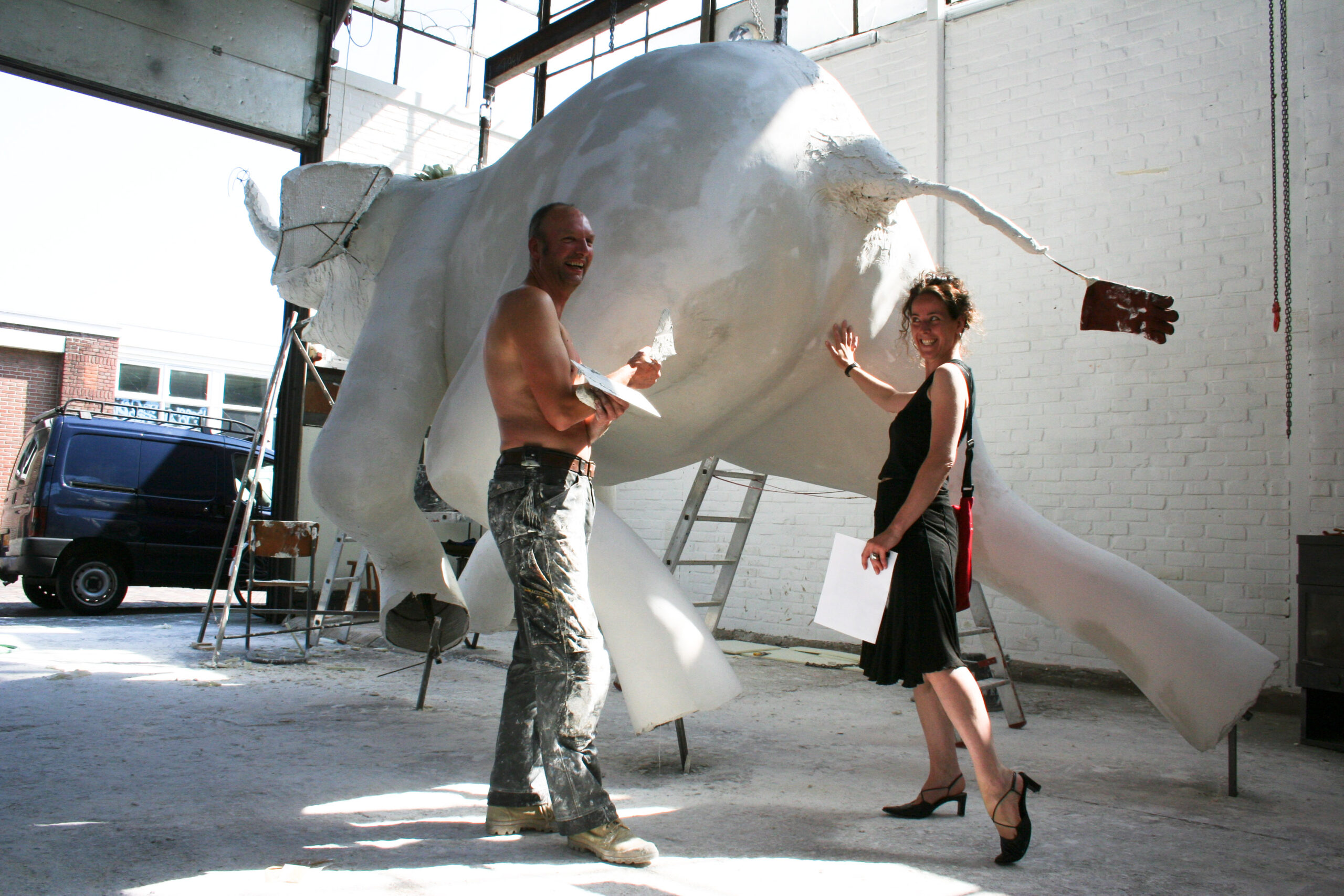 De positie van de olifant is in het bovenste gedeelte van de wachtruimte, een deel van de achterpoten is nog in het begane grond volume. Er is min of meer sprake van een gestolde zwem beweging. De richting van de sculptuur is in de diagonaal van de ruimte, van rechtsonder naar linksboven. De achterpoten laag en de slurf reikend naar het bovenlicht. Het geheel wordt met een aantal dunne staalkabels op zijn plek gehouden. In dit deel van de ruimte is er daglicht. Dat verandert met de stand van de zon en de tijd van het jaar. Die veranderingen in het licht zullen ook zichtbaar zijn in het beeld, dat verandert mee. De sculptuur is hol en transparant; vanaf verschillende posities zitten daardoor verschillende lagen achter elkaar. Samen met het effect van het licht geeft dit telkens een ander beeld. Bovendien laten wij de voetzolen in het beeld open, waardoor er posities ontstaan waarbij je ook echt in het beeld kan kijken.
