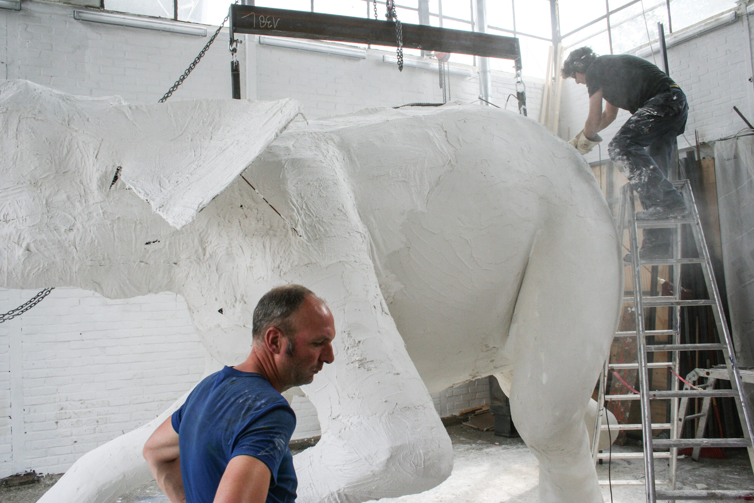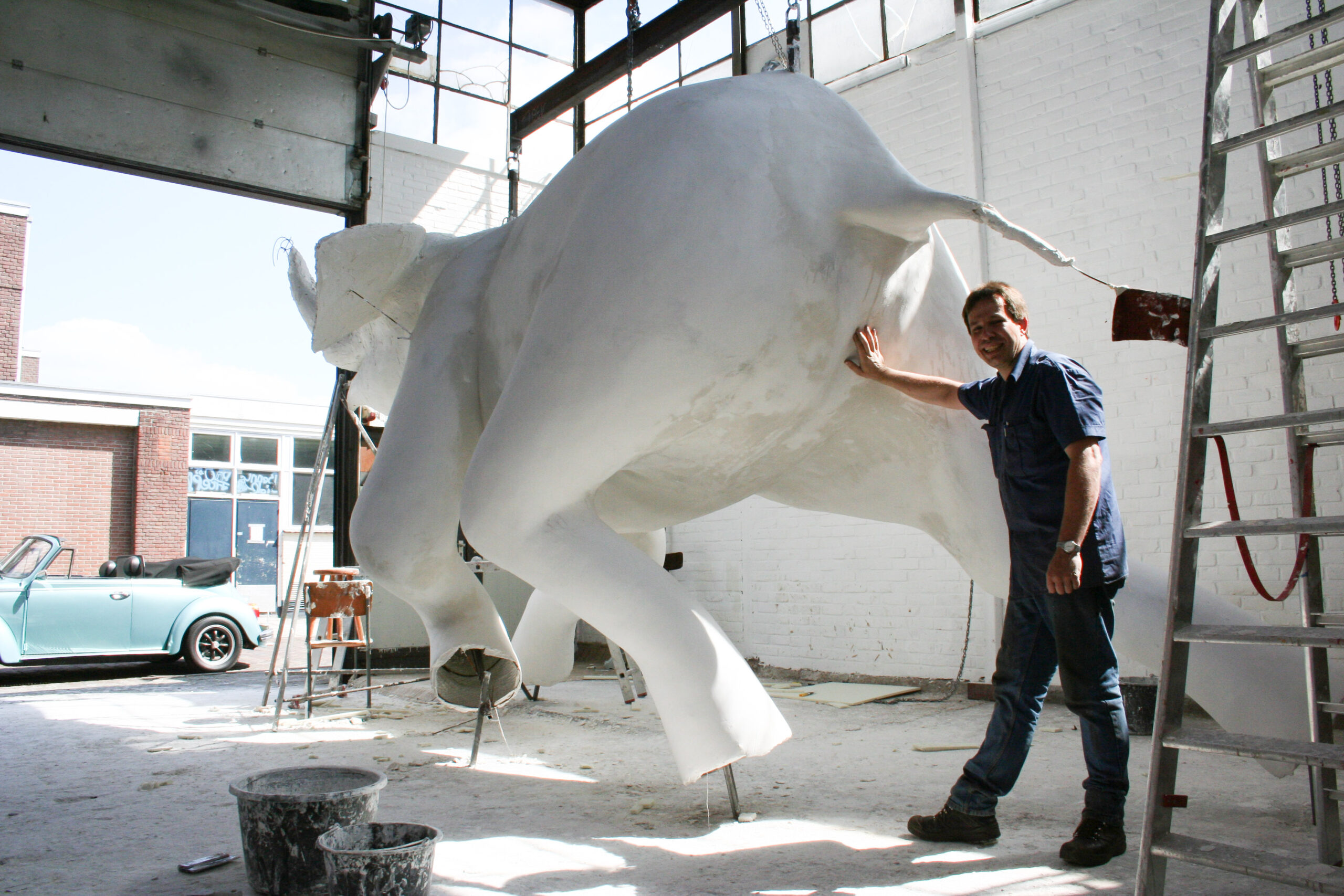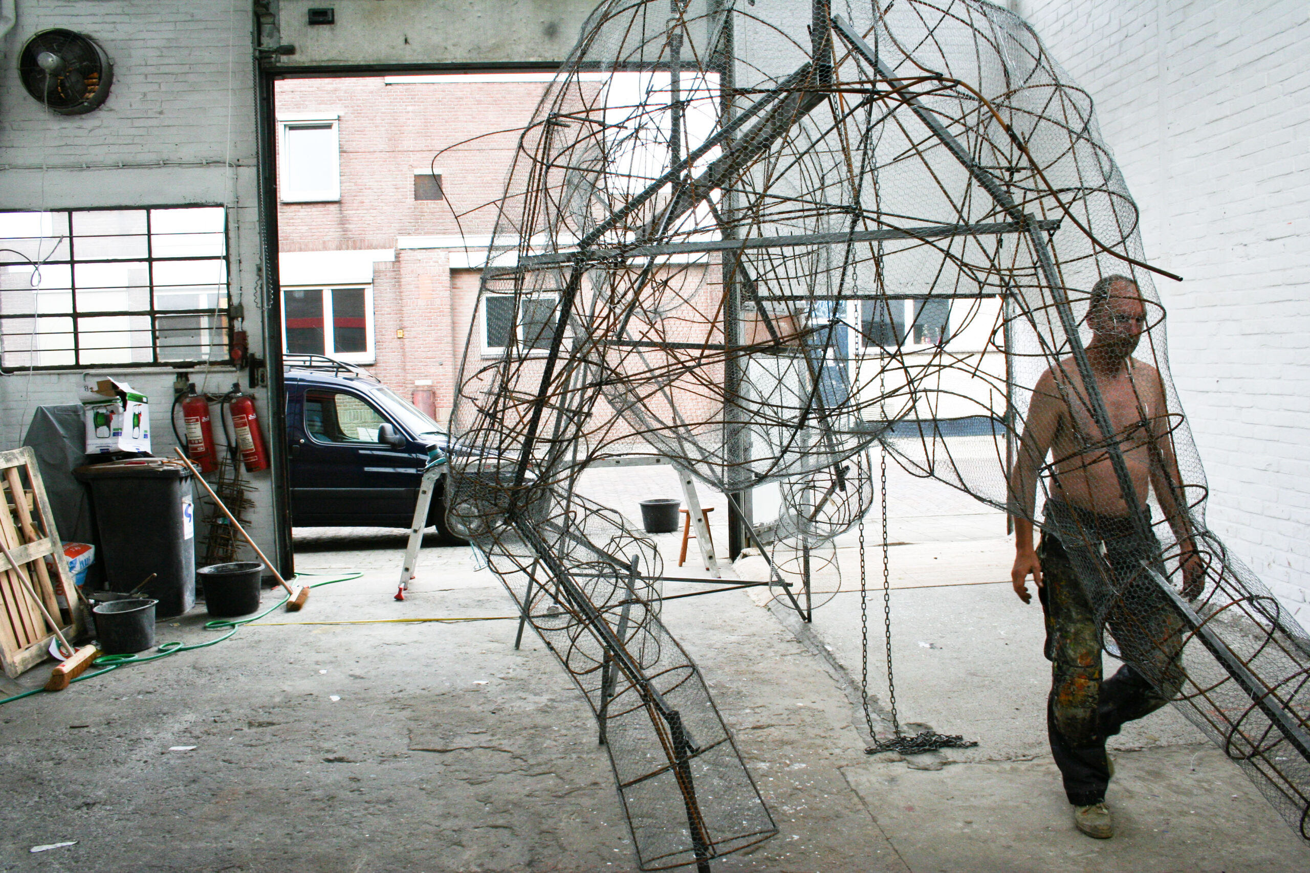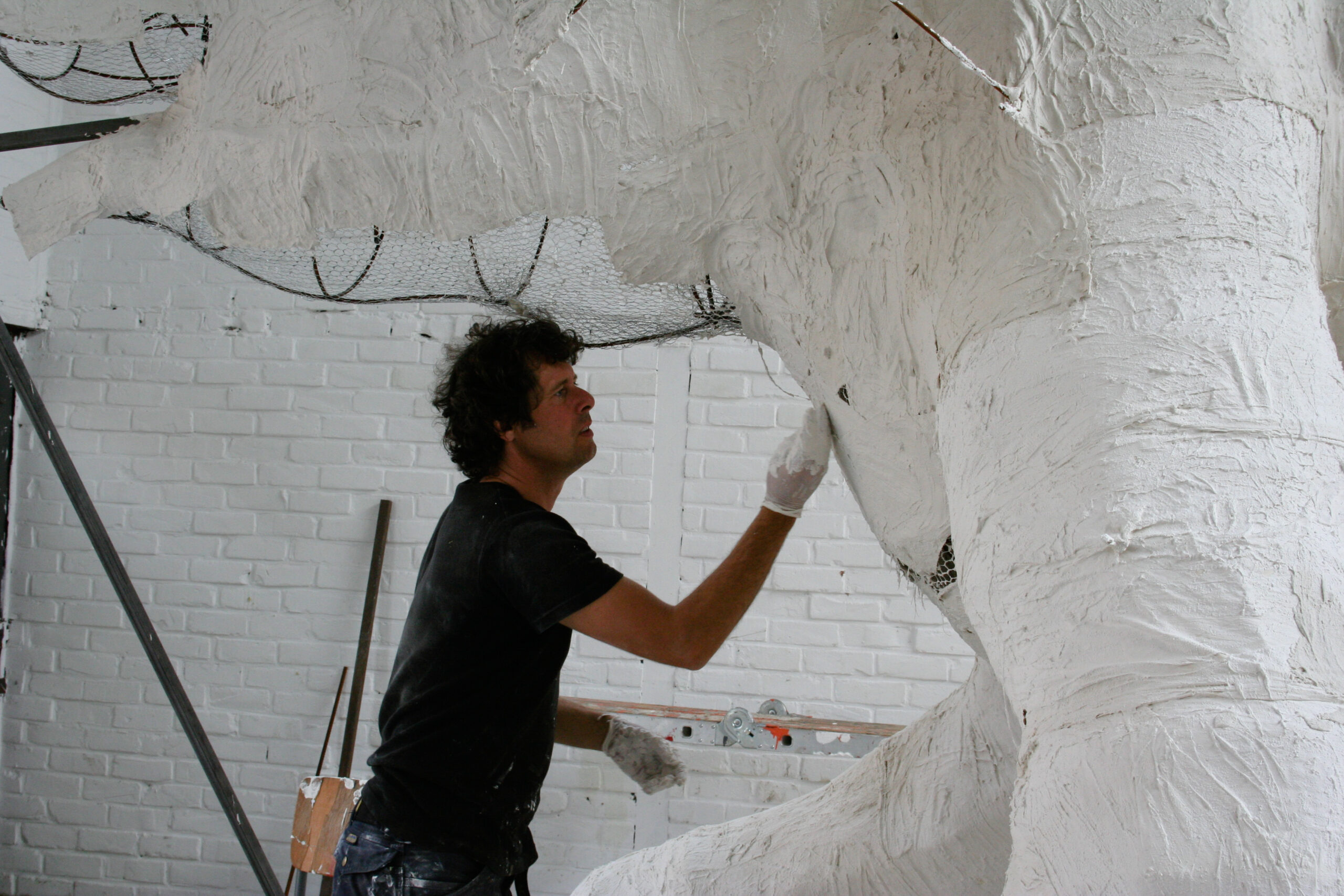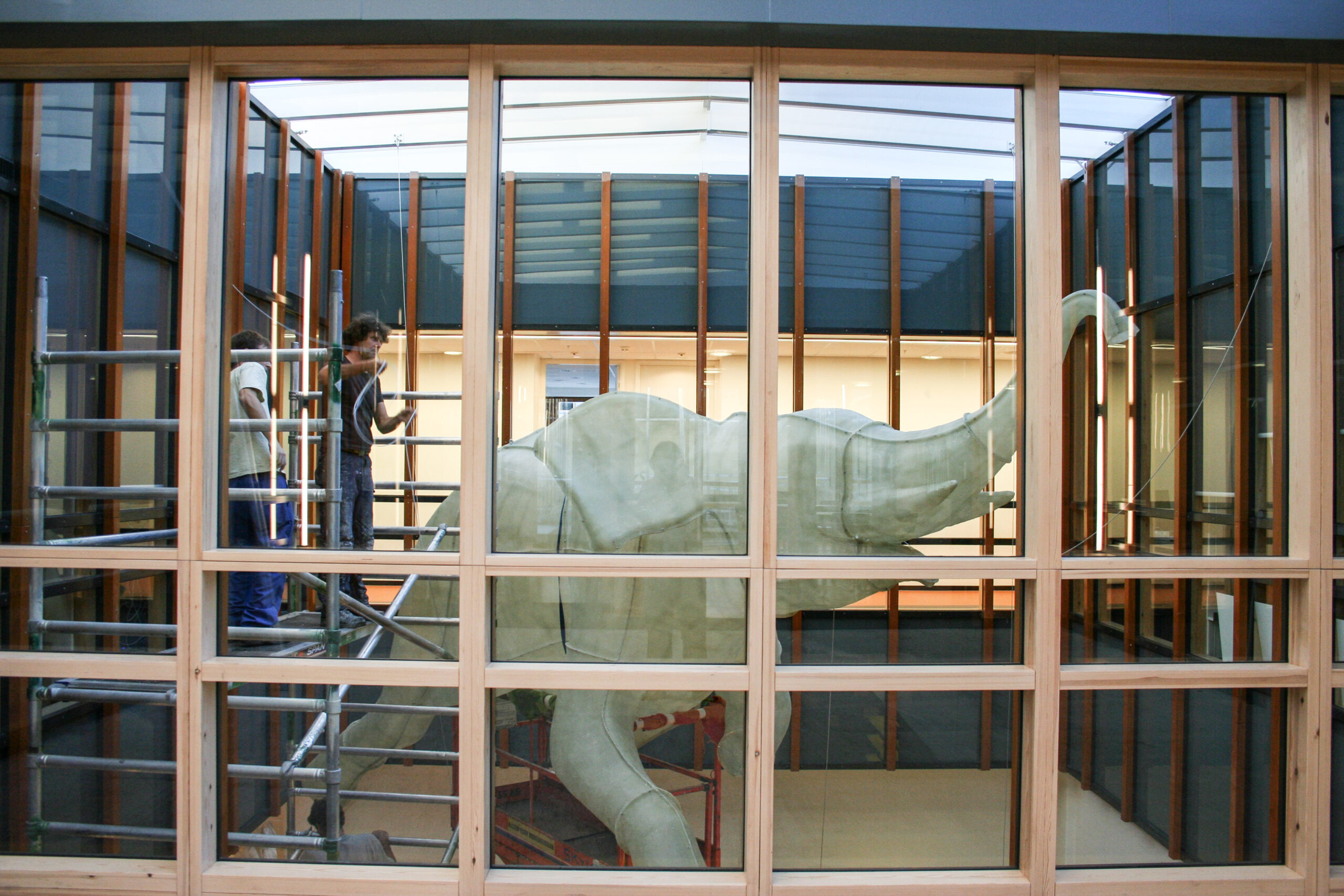 De positie van de olifant is in het bovenste gedeelte van de wachtruimte, een deel van de achterpoten is nog in het begane grond volume. Er is min of meer sprake van een gestolde zwem beweging. De richting van de sculptuur is in de diagonaal van de ruimte, van rechtsonder naar linksboven. De achterpoten laag en de slurf reikend naar het bovenlicht. Het geheel wordt met een aantal dunne staalkabels op zijn plek gehouden. In dit deel van de ruimte is er daglicht. Dat verandert met de stand van de zon en de tijd van het jaar. Die veranderingen in het licht zullen ook zichtbaar zijn in het beeld, dat verandert mee. De sculptuur is hol en transparant; vanaf verschillende posities zitten daardoor verschillende lagen achter elkaar. Samen met het effect van het licht geeft dit telkens een ander beeld. Bovendien laten wij de voetzolen in het beeld open, waardoor er posities ontstaan waarbij je ook echt in het beeld kan kijken.