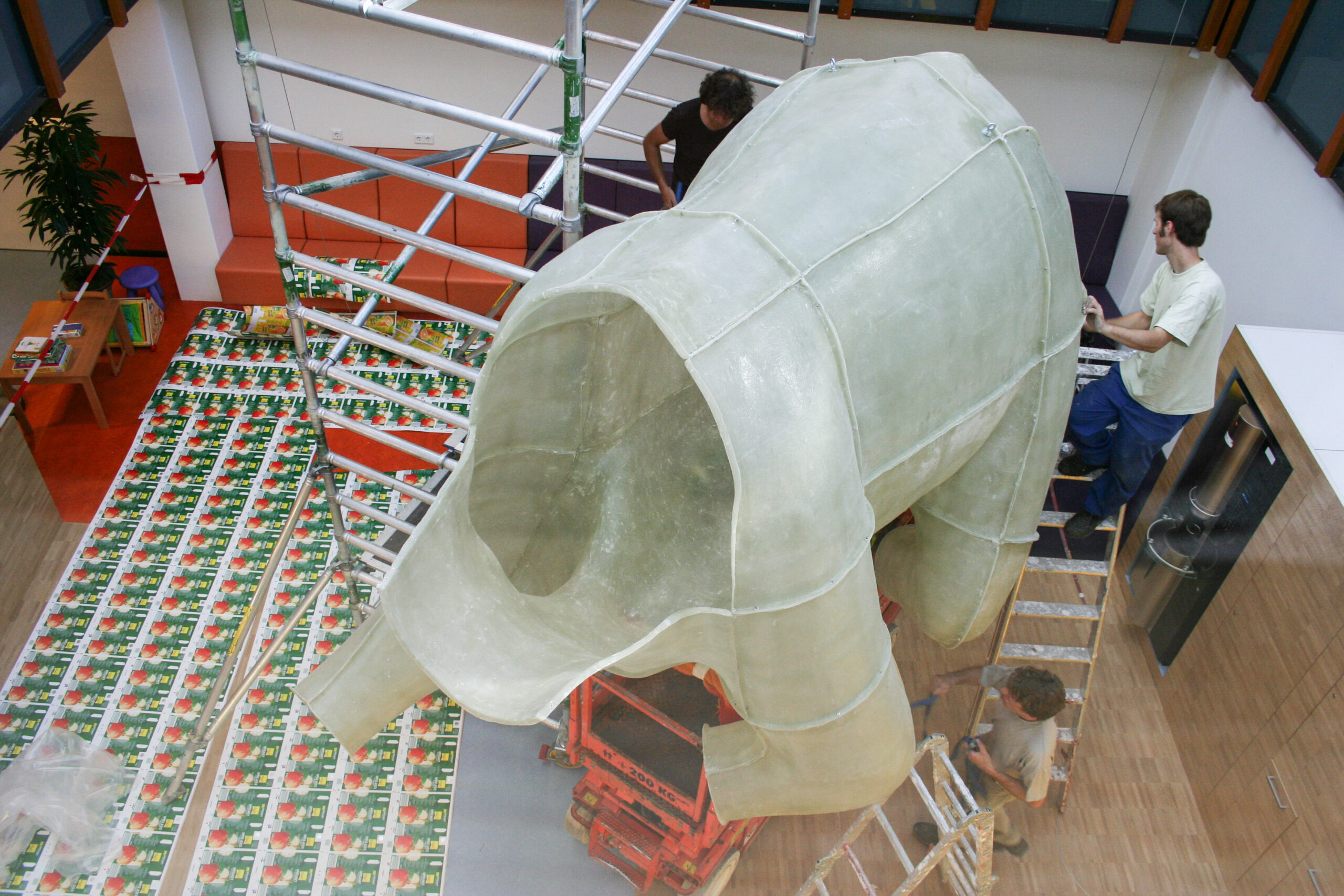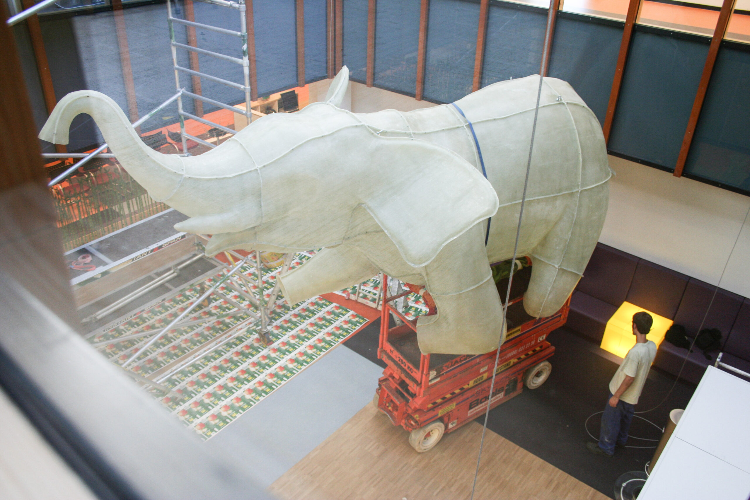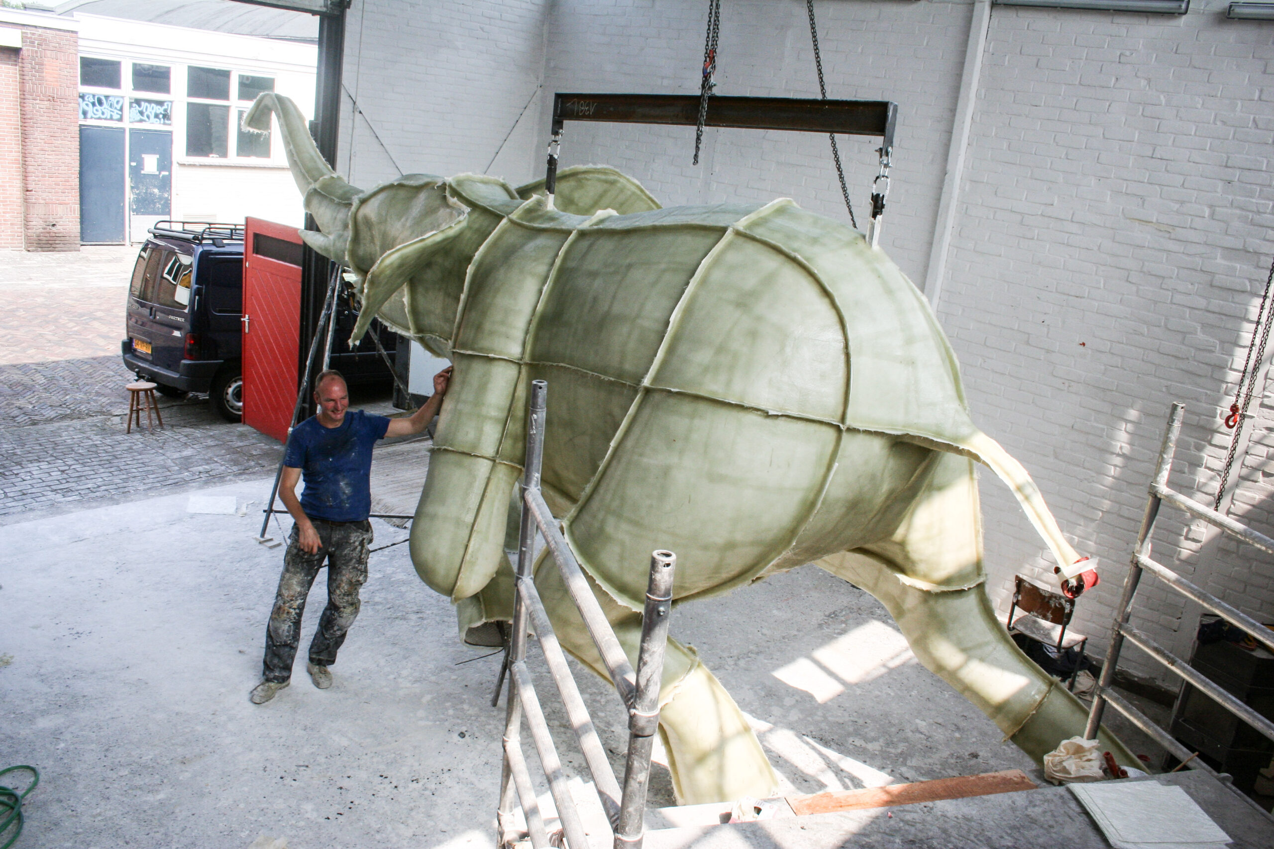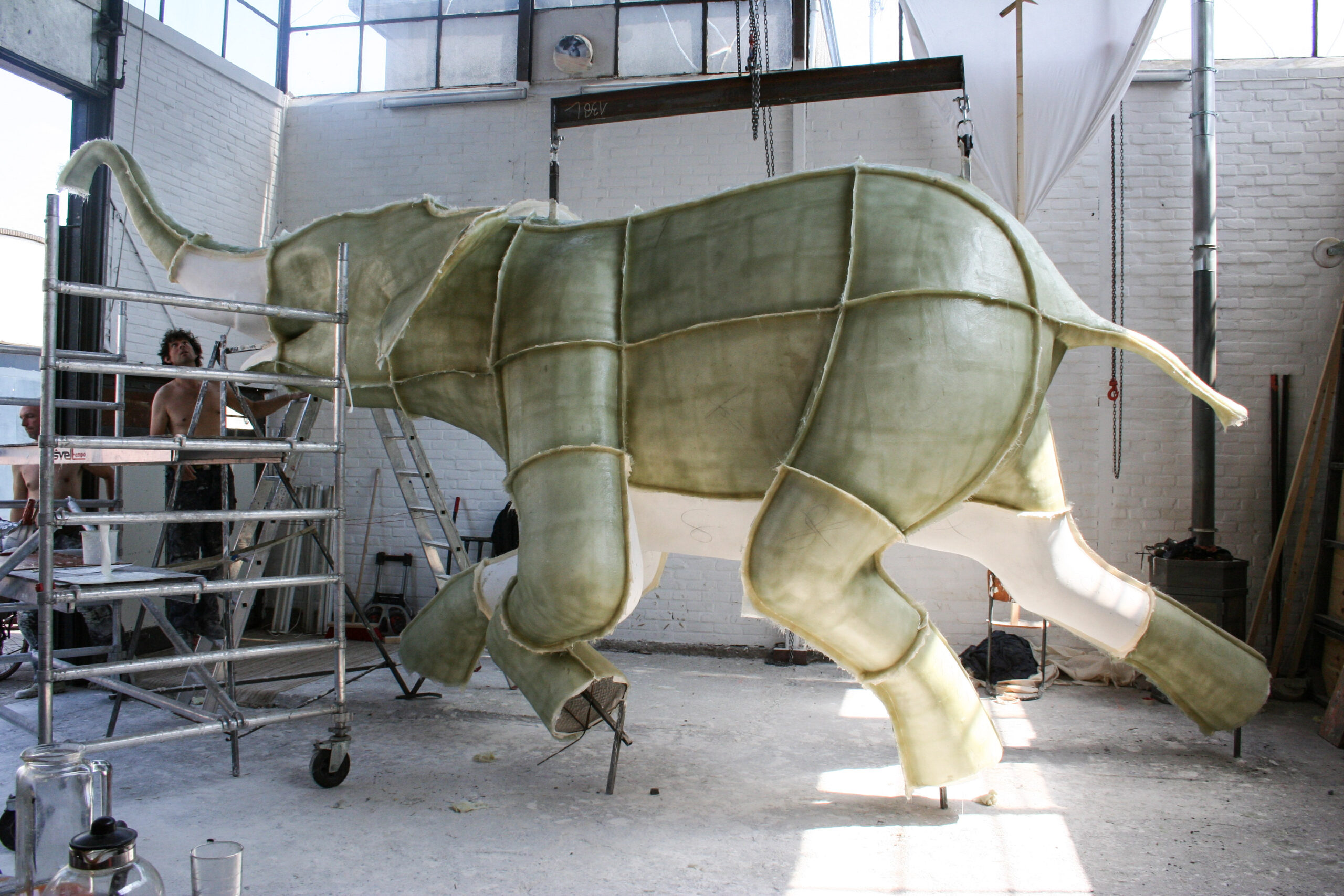 De olifant is een sculptuur van reële proporties. Het heeft zeker volume, maar nagenoeg geen massa. We laten in feite alleen de huid zien. En die huid is gemaakt van glasvezel versterkt polyester. Dit is een licht en sterk materiaal met een zekere transparantie. Hoe dunner de huid, des te groter het lichtdoorlatende vermogen is. Zoals wij het hier gebruiken heeft het een lichtgroenige naturelle tint. Bij direct zonlicht lijkt dit materiaal, vermoedelijk door de glasvezel, als het ware op te lichten. De sculptuur is niet uit één stuk, maar opgedeeld in verschillende schaaldelen. De verschillende delen zijn op flensnaden met elkaar verbonden door middel van blindklinknagels. Met elkaar vormt dit een sterk en solide geheel. Omdat de flensnaden iets dikker zijn, zal daar de transparantie van het materiaal geringer zijn. De flensnaden zijn daardoor als een belijning goed zichtbaar en werken dan ook mee in het beeld. De opdeling van het beeld is niet alleen praktisch, maar ook visueel noodzakelijk. Het geeft het beeld een inzichtelijke structuur. De belijning van de flensnaden loopt met de vorm van de sculptuur mee, ronde vormen en golvingen in het beeld worden daardoor juist versterkt en zichtbaar. Een organische vormtaal die contrasteert met het architectonische kader van de ruimte zelf.