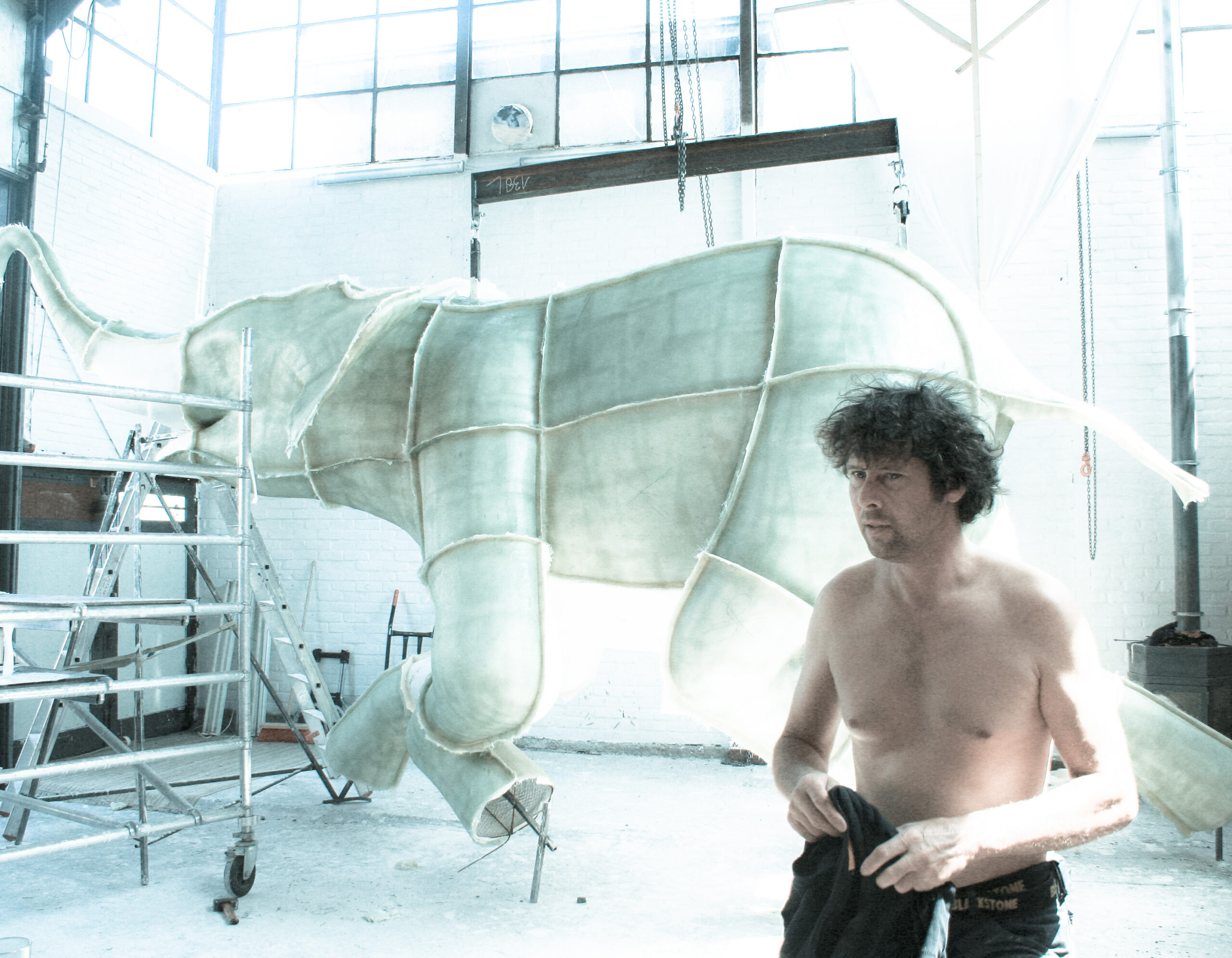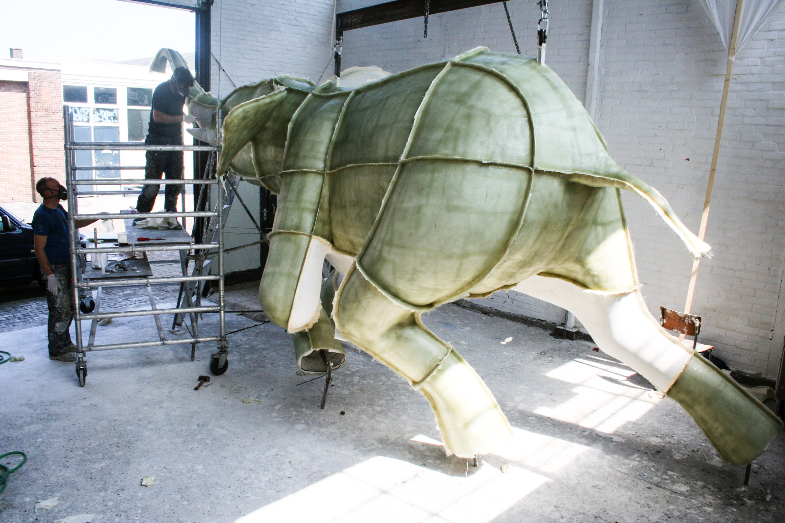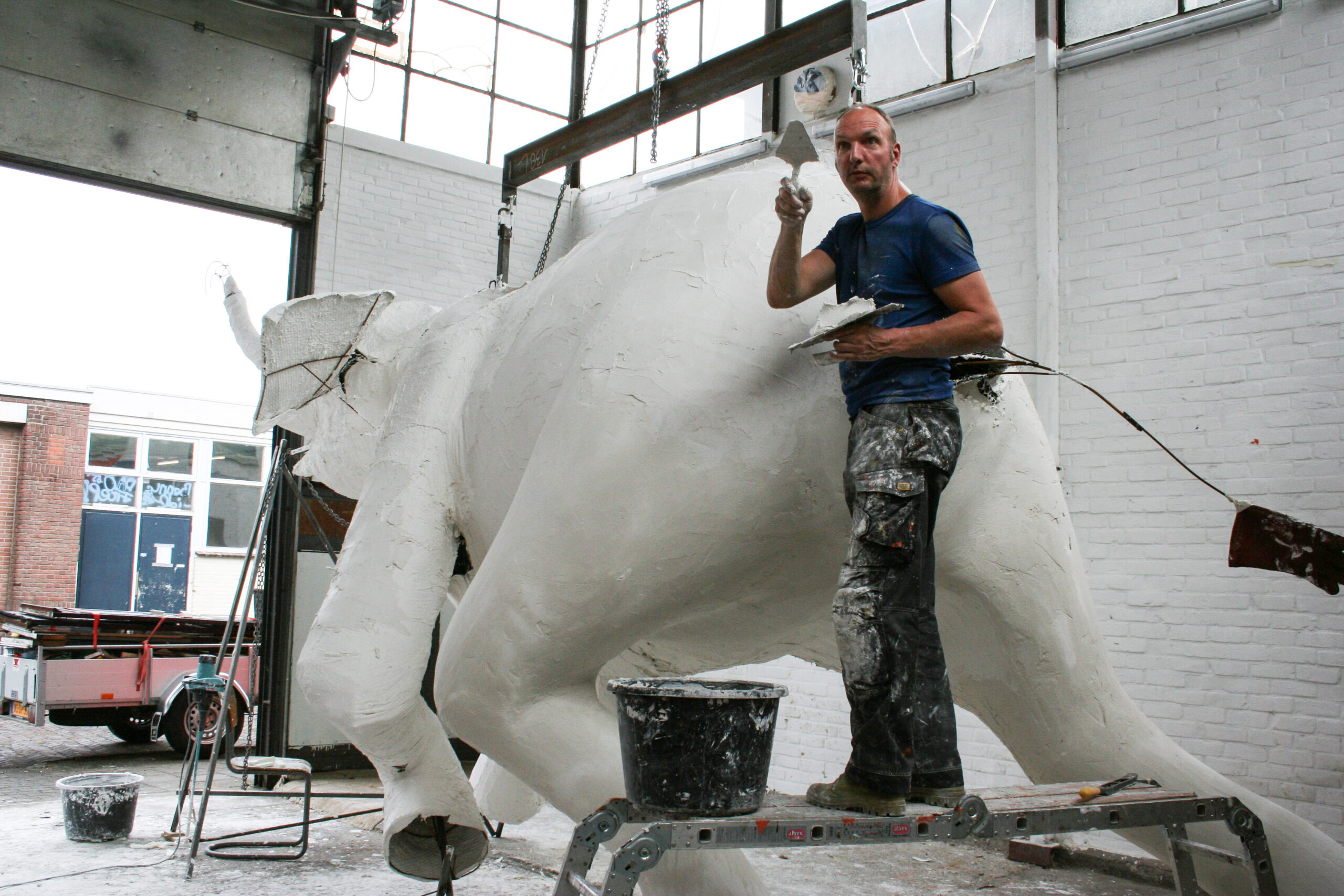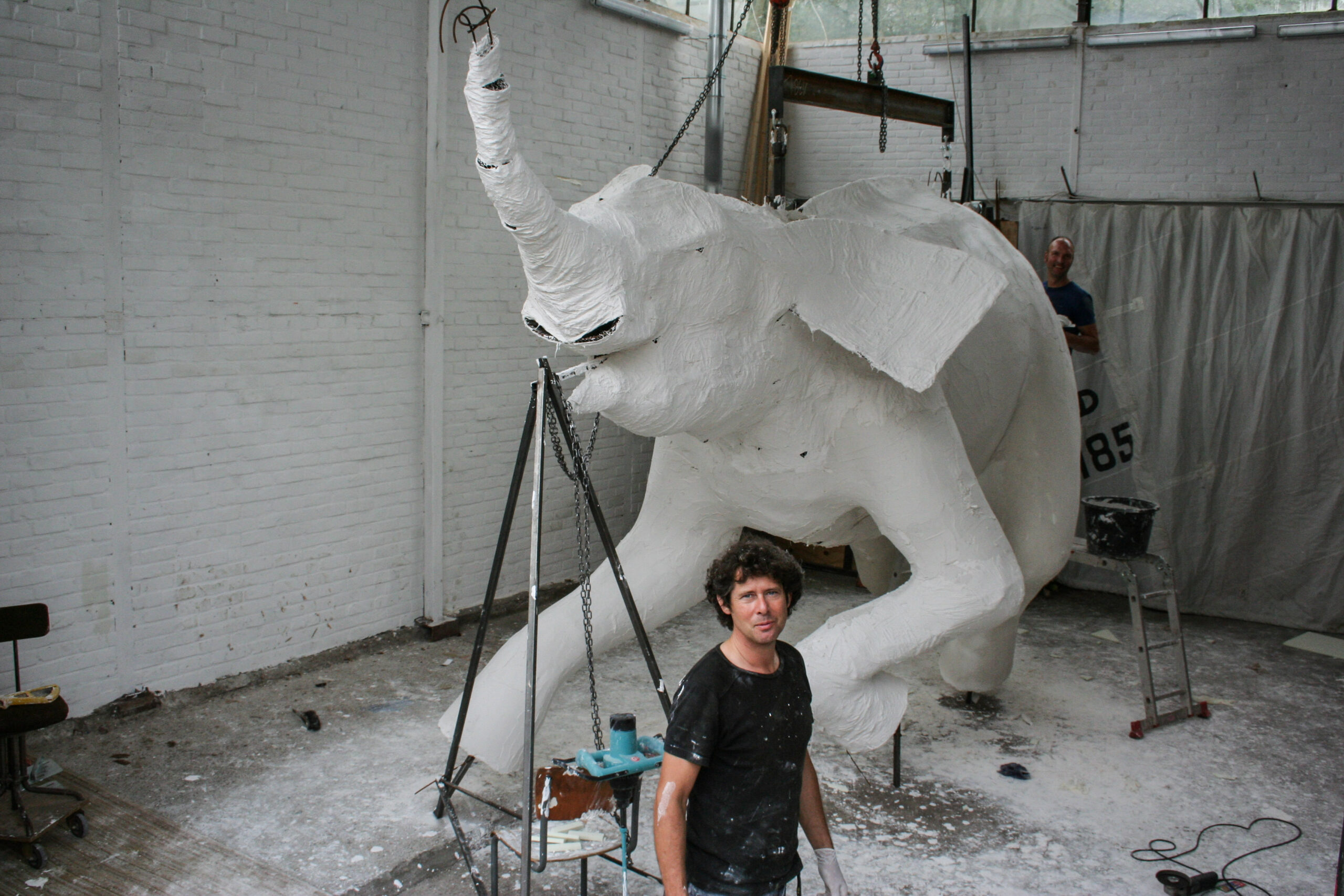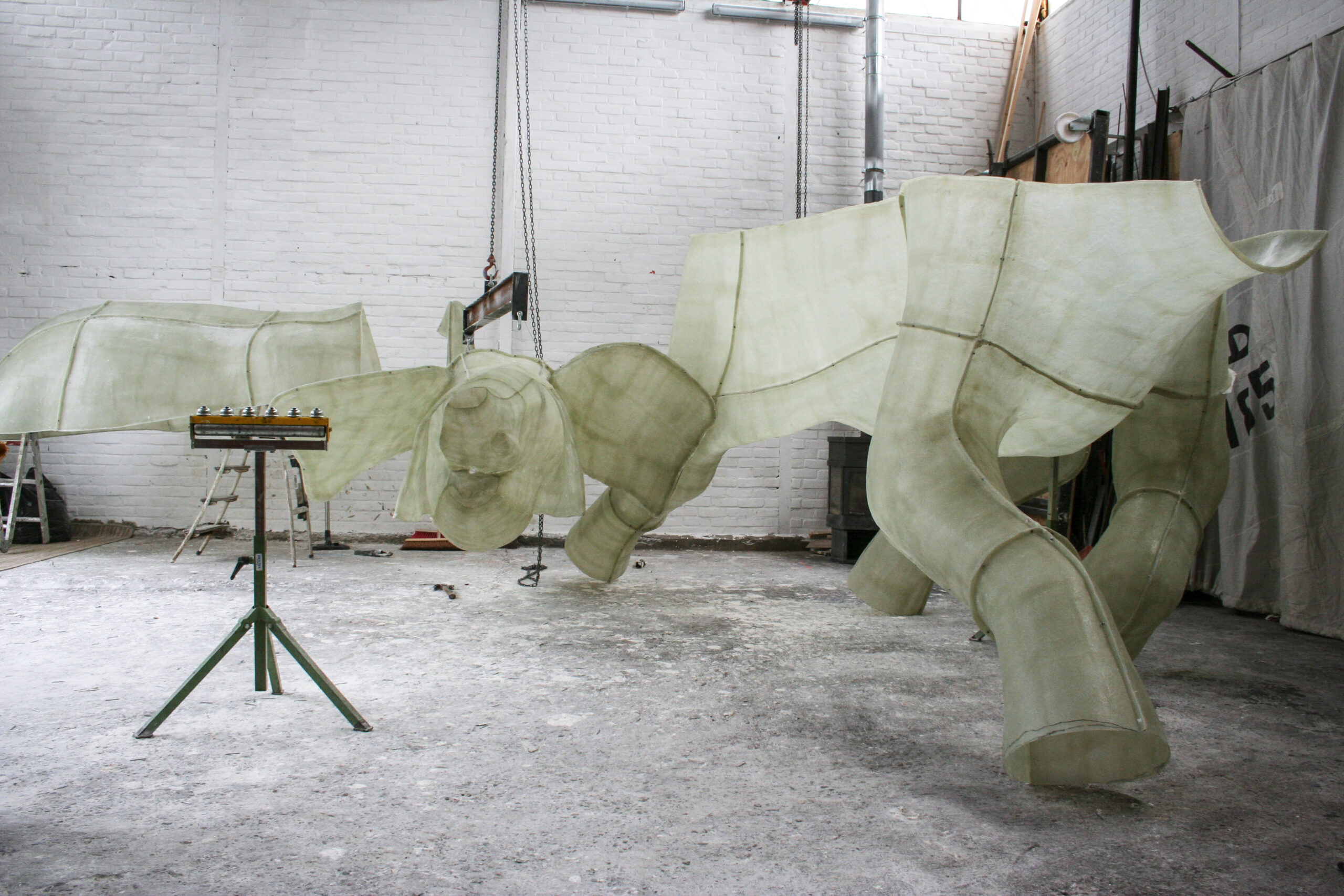 De olifant is een sculptuur van reële proporties. Het heeft zeker volume, maar nagenoeg geen massa. We laten in feite alleen de huid zien. En die huid is gemaakt van glasvezel versterkt polyester. Dit is een licht en sterk materiaal met een zekere transparantie. Hoe dunner de huid, des te groter het lichtdoorlatende vermogen is. Zoals wij het hier gebruiken heeft het een lichtgroenige naturelle tint. Bij direct zonlicht lijkt dit materiaal, vermoedelijk door de glasvezel, als het ware op te lichten. De sculptuur is niet uit één stuk, maar opgedeeld in verschillende schaaldelen. De verschillende delen zijn op flensnaden met elkaar verbonden door middel van blindklinknagels. Met elkaar vormt dit een sterk en solide geheel. Omdat de flensnaden iets dikker zijn, zal daar de transparantie van het materiaal geringer zijn. De flensnaden zijn daardoor als een belijning goed zichtbaar en werken dan ook mee in het beeld. De opdeling van het beeld is niet alleen praktisch, maar ook visueel noodzakelijk. Het geeft het beeld een inzichtelijke structuur. De belijning van de flensnaden loopt met de vorm van de sculptuur mee, ronde vormen en golvingen in het beeld worden daardoor juist versterkt en zichtbaar. Een organische vormtaal die contrasteert met het architectonische kader van de ruimte zelf.