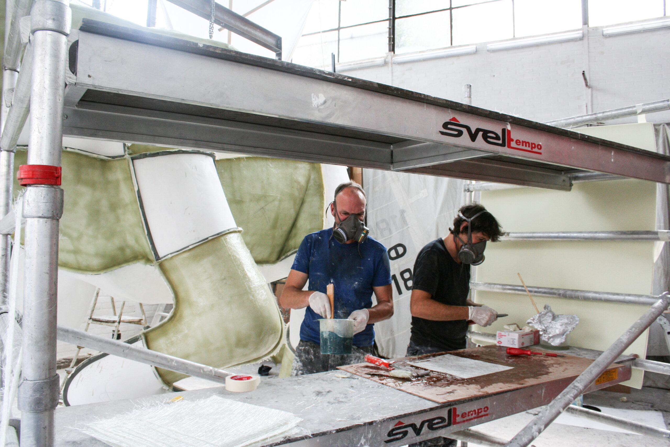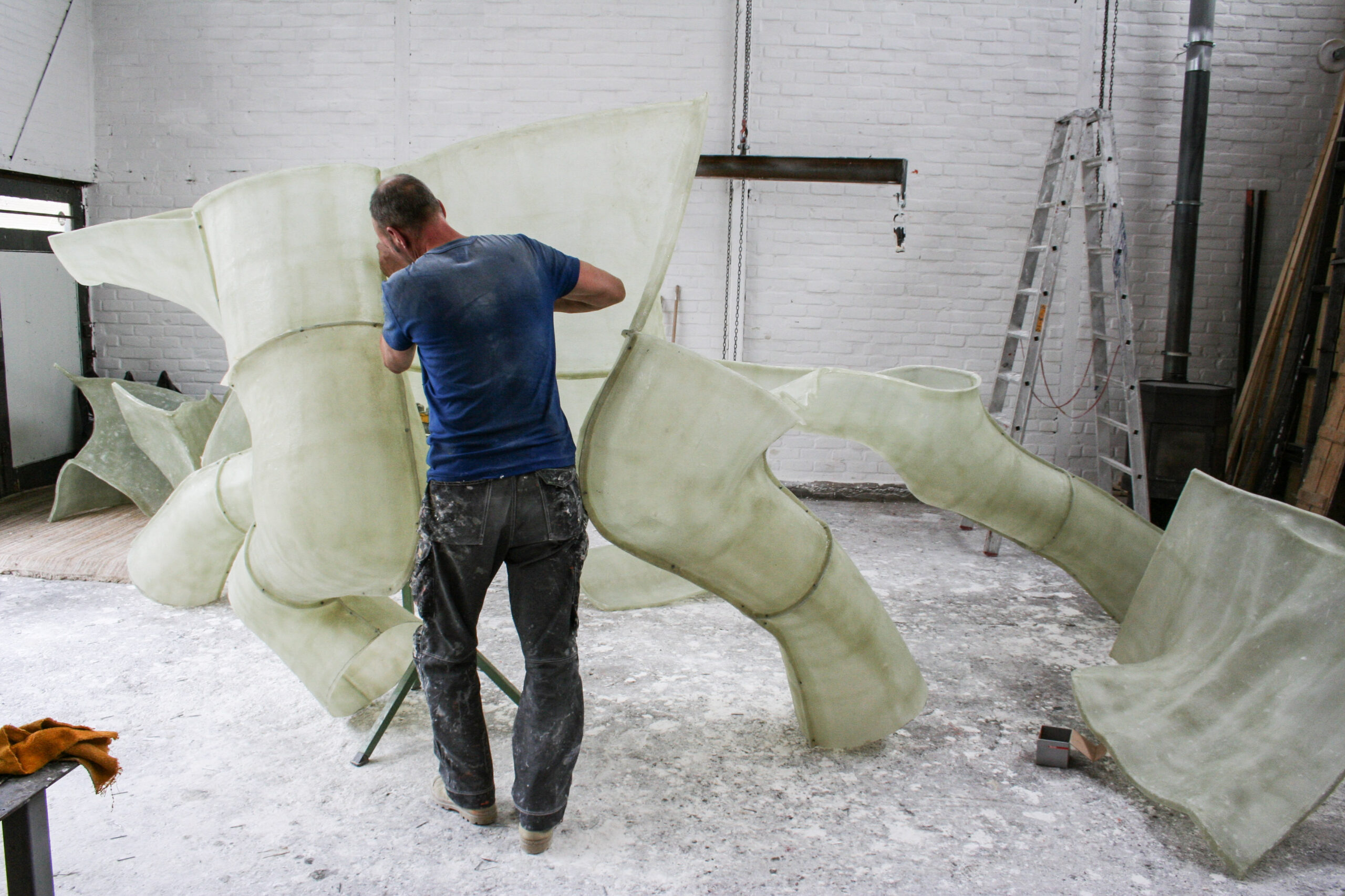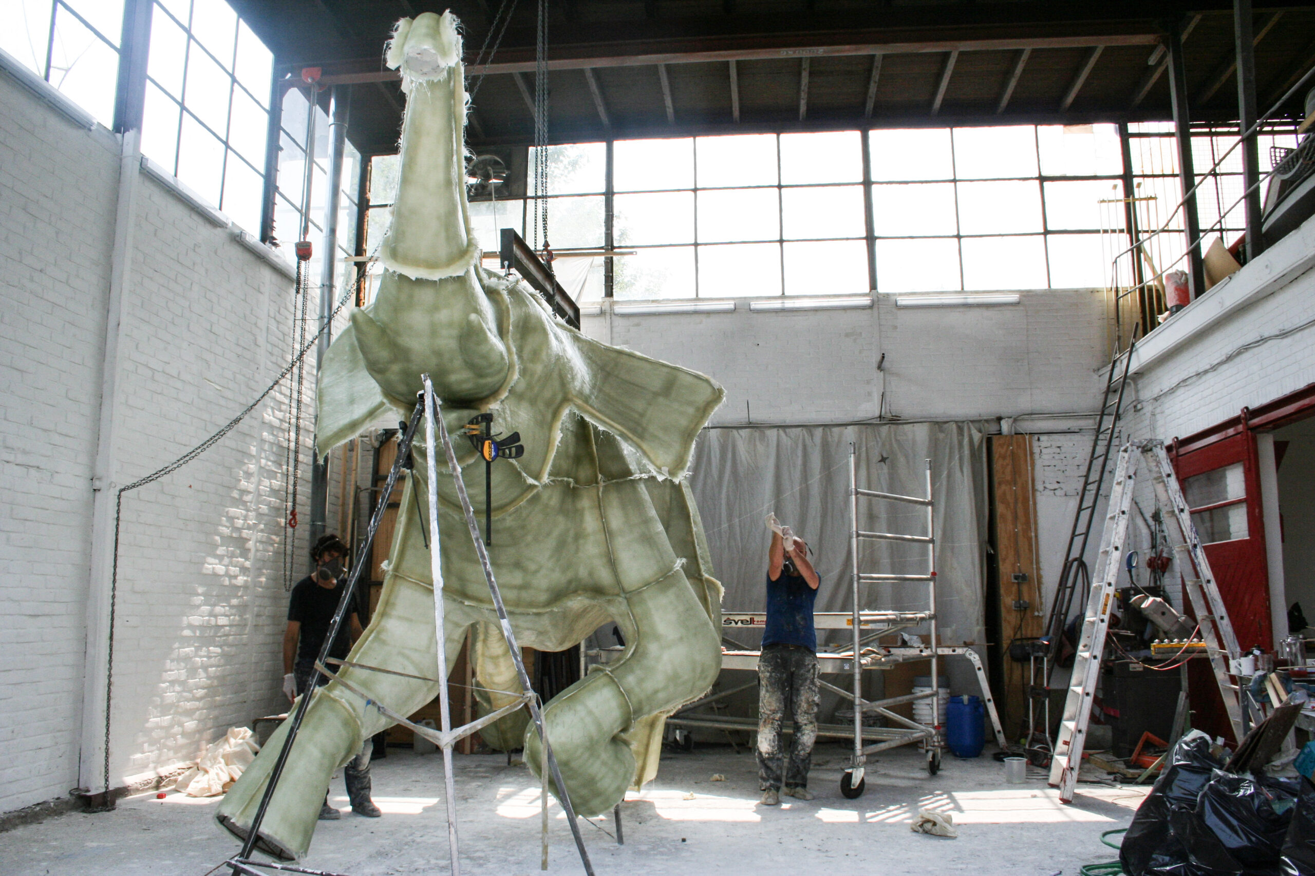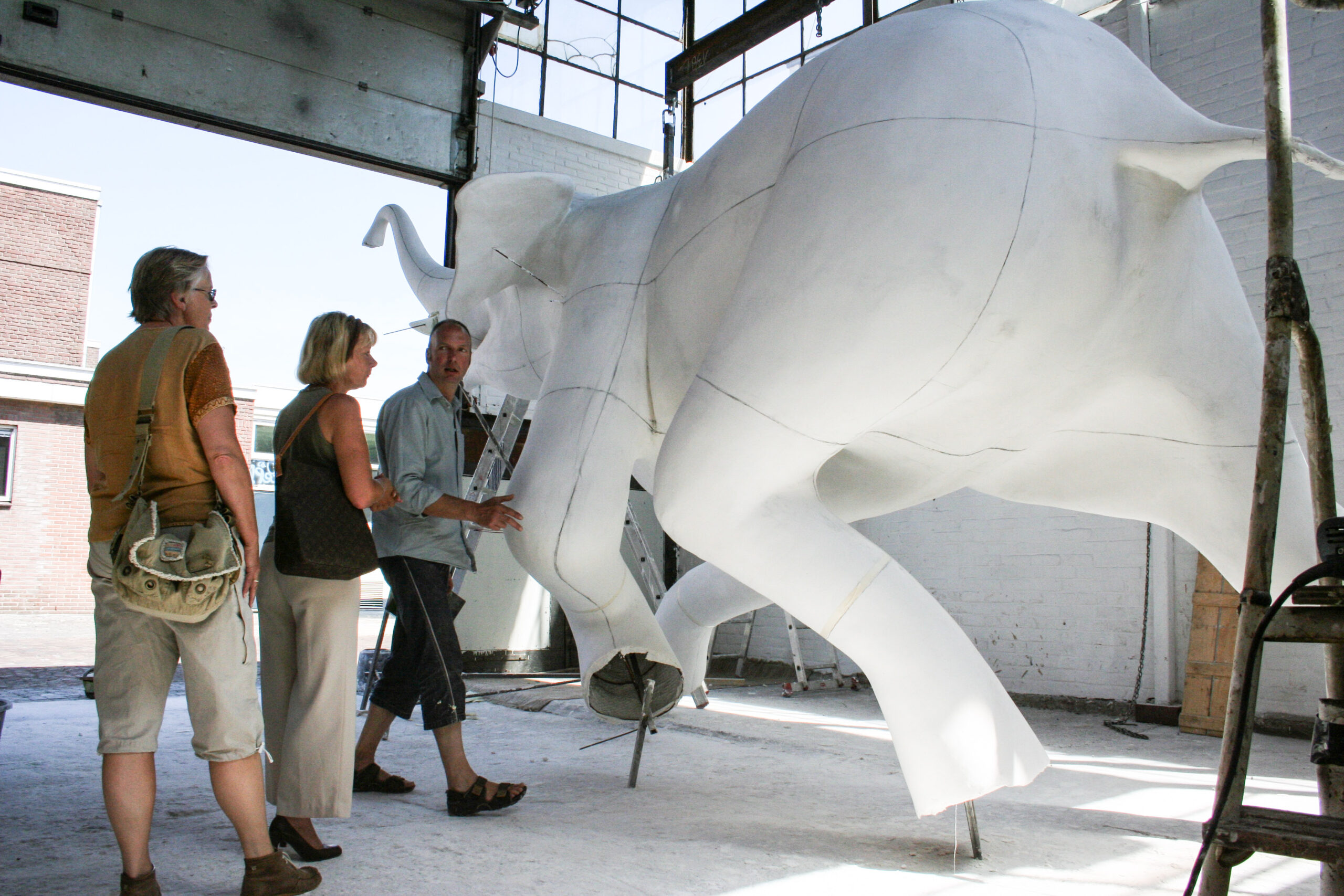 De olifant is een sculptuur van reële proporties. Het heeft zeker volume, maar nagenoeg geen massa. We laten in feite alleen de huid zien. En die huid is gemaakt van glasvezel versterkt polyester. Dit is een licht en sterk materiaal met een zekere transparantie. Hoe dunner de huid, des te groter het lichtdoorlatende vermogen is. Zoals wij het hier gebruiken heeft het een lichtgroenige naturelle tint. Bij direct zonlicht lijkt dit materiaal, vermoedelijk door de glasvezel, als het ware op te lichten. De sculptuur is niet uit één stuk, maar opgedeeld in verschillende schaaldelen. De verschillende delen zijn op flensnaden met elkaar verbonden door middel van blindklinknagels. Met elkaar vormt dit een sterk en solide geheel. Omdat de flensnaden iets dikker zijn, zal daar de transparantie van het materiaal geringer zijn. De flensnaden zijn daardoor als een belijning goed zichtbaar en werken dan ook mee in het beeld. De opdeling van het beeld is niet alleen praktisch, maar ook visueel noodzakelijk. Het geeft het beeld een inzichtelijke structuur. De belijning van de flensnaden loopt met de vorm van de sculptuur mee, ronde vormen en golvingen in het beeld worden daardoor juist versterkt en zichtbaar. Een organische vormtaal die contrasteert met het architectonische kader van de ruimte zelf.