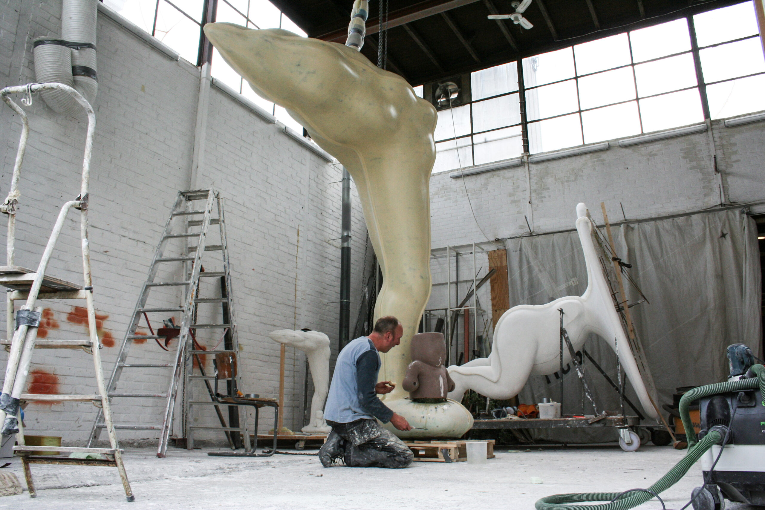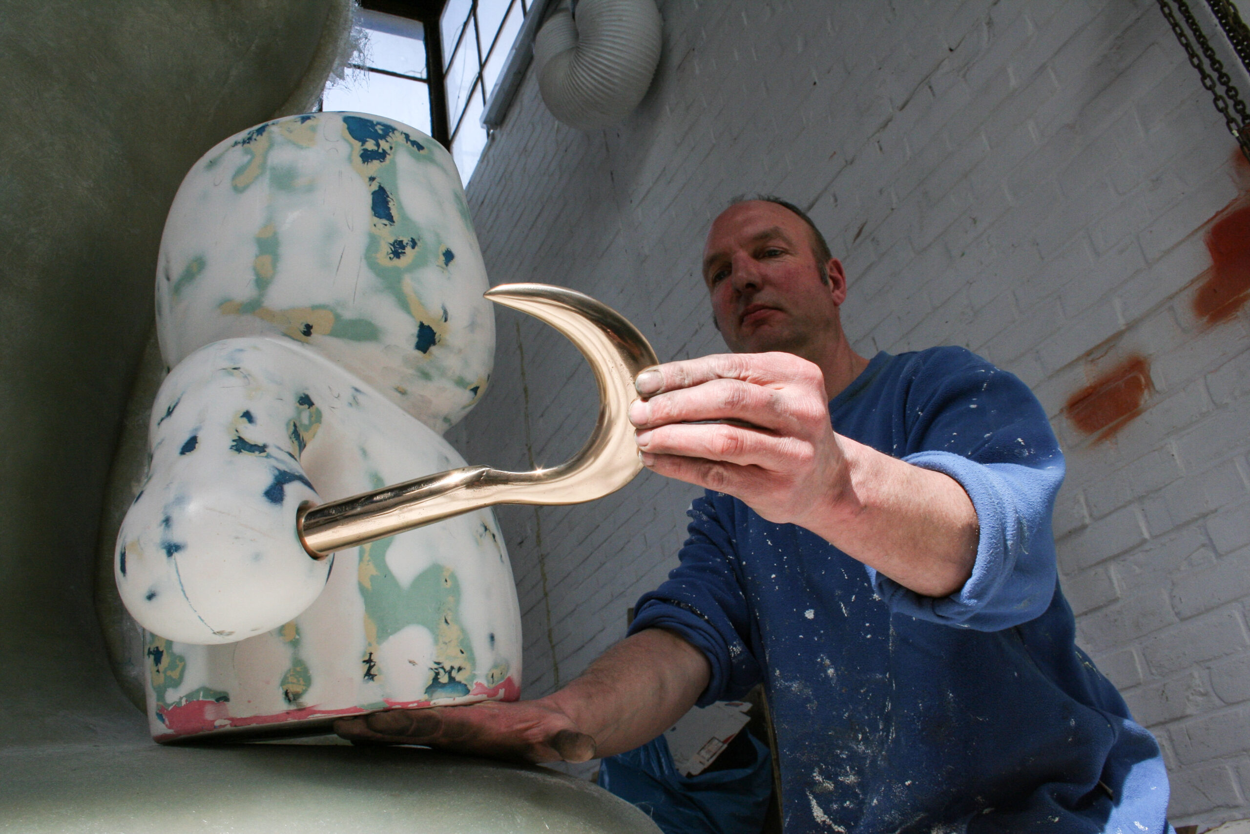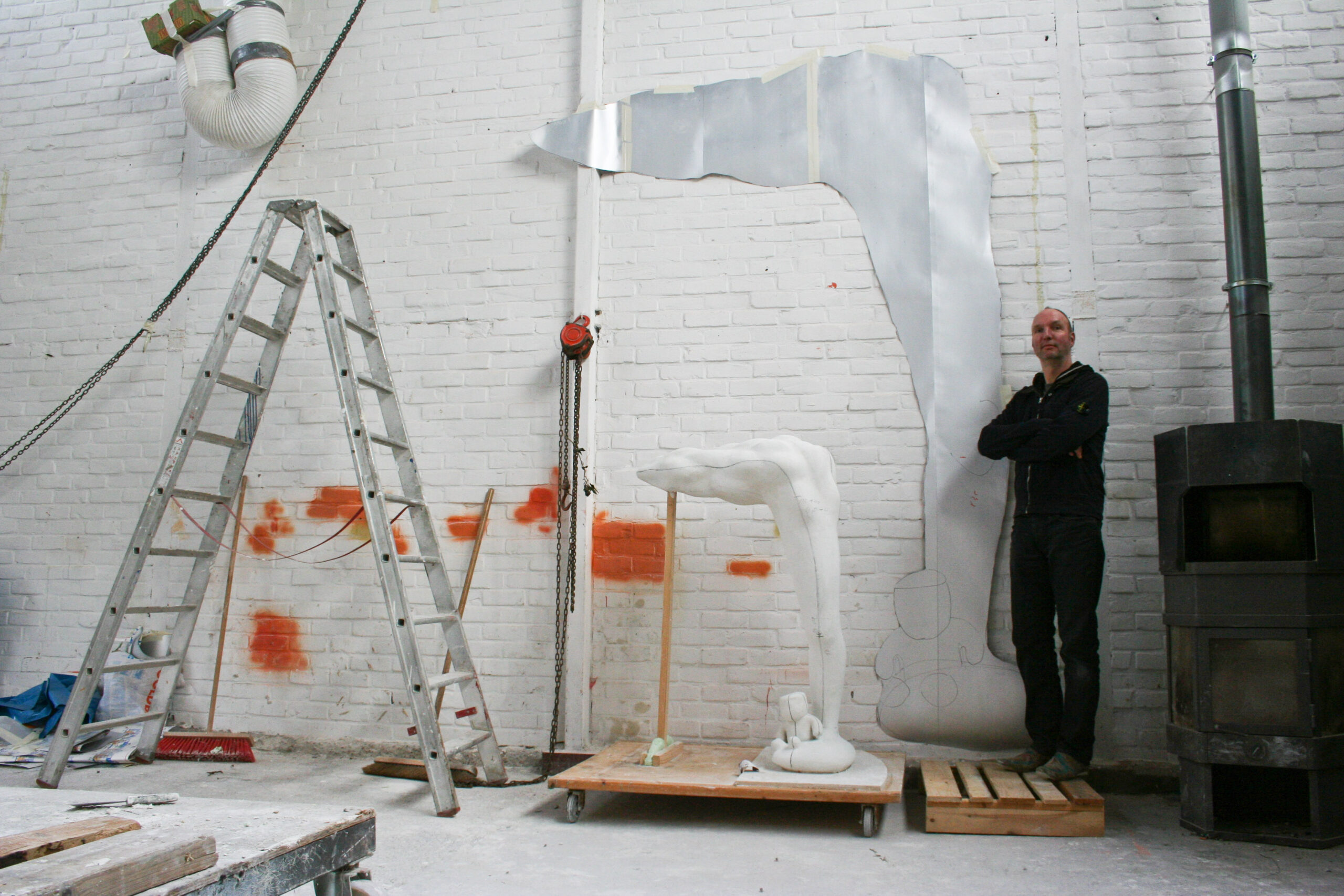 Vanuit het huis gezien willen wij “ BEACH BOY “ rechts op het grasveld, in de diagonaal van het perceel plaatsen. We houden de ruimte van het grasveld en de tuin als geheel in stand, maar we willen ook dat het beeld zich in de positie duidelijk onderscheidt van de achtergrond. Dit zal visueel de diepte in de tuin versterken. De sculptuur wordt uit een stuk polyester opgebouwd, glad afgewerkt en in één kleur sterk hoogglanzende lak gespoten. Een dergelijke afwerking maakt de plasticiteit van de vormen overduidelijk. De zichtbare oppervlakte spanning in huid laat alle vormelementen in elkaar overvloeien.