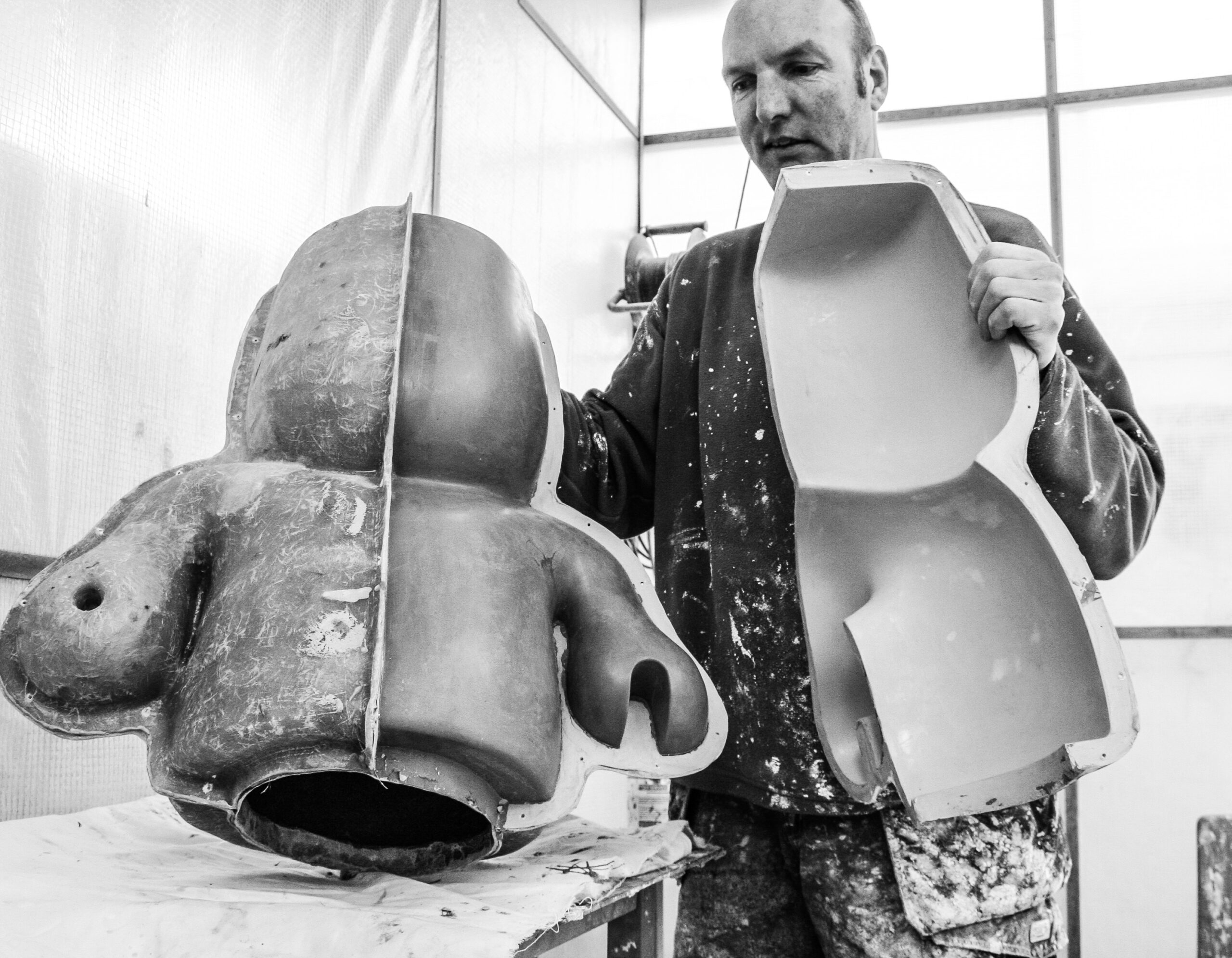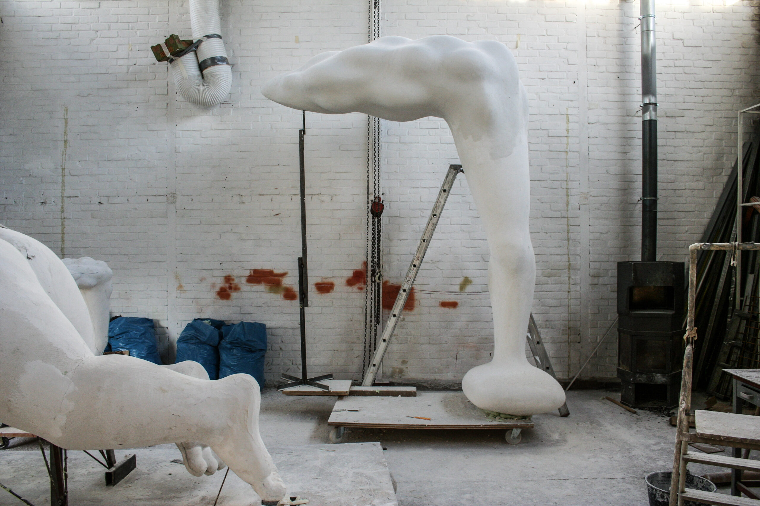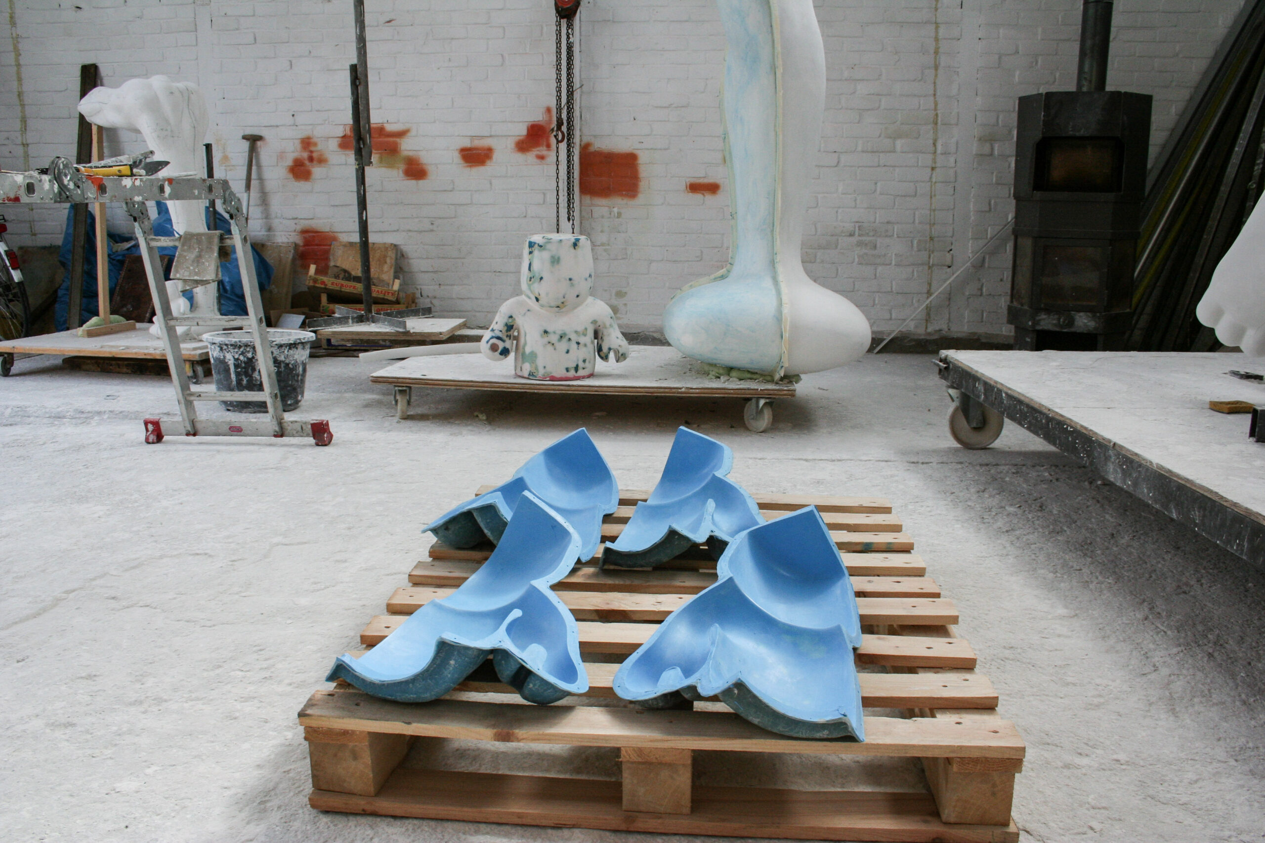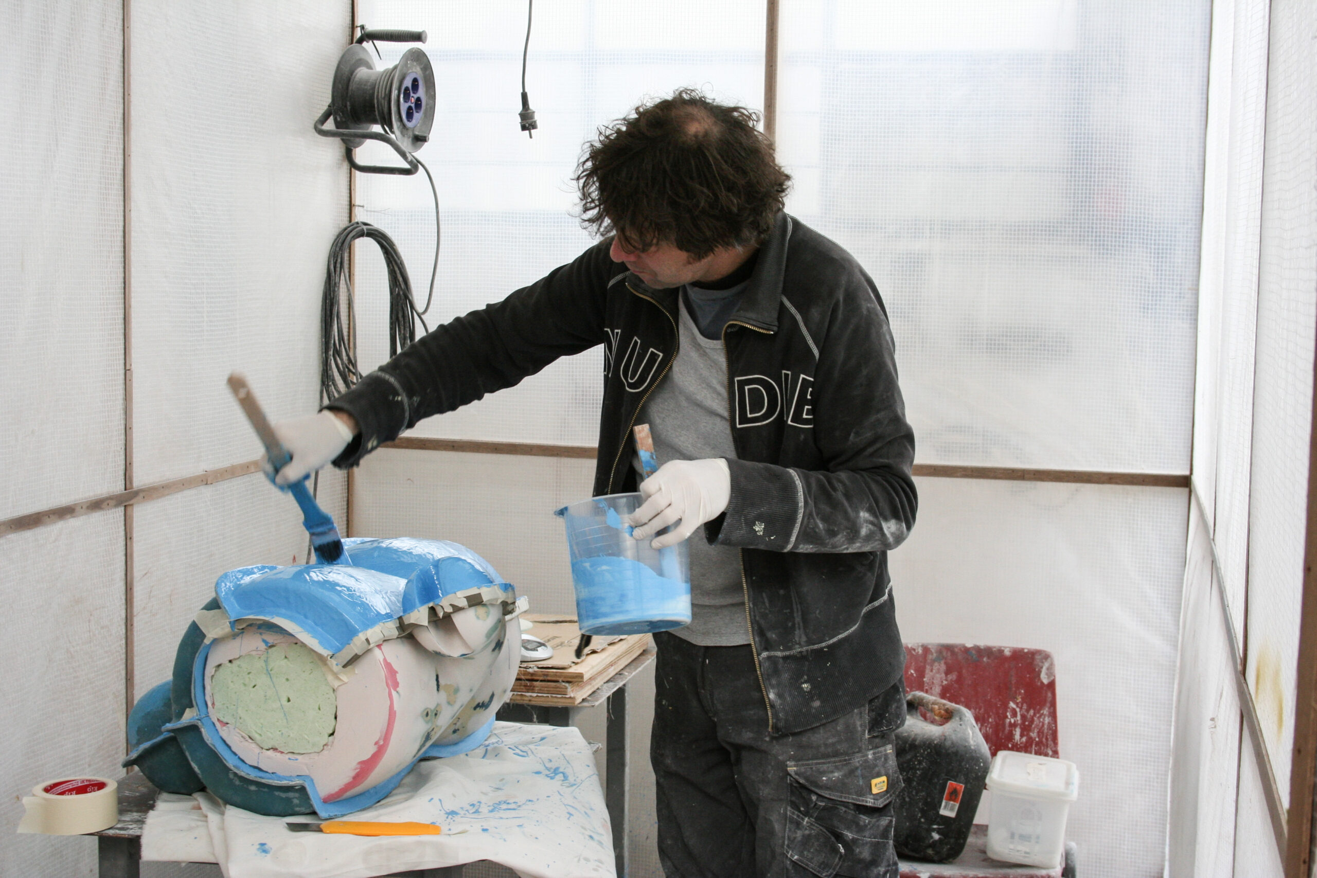Vanuit het huis gezien willen wij “ BEACH BOY “ rechts op het grasveld, in de diagonaal van het perceel plaatsen. We houden de ruimte van het grasveld en de tuin als geheel in stand, maar we willen ook dat het beeld zich in de positie duidelijk onderscheidt van de achtergrond. Dit zal visueel de diepte in de tuin versterken. De sculptuur wordt uit een stuk polyester opgebouwd, glad afgewerkt en in één kleur sterk hoogglanzende lak gespoten. Een dergelijke afwerking maakt de plasticiteit van de vormen overduidelijk. De zichtbare oppervlakte spanning in huid laat alle vormelementen in elkaar overvloeien.