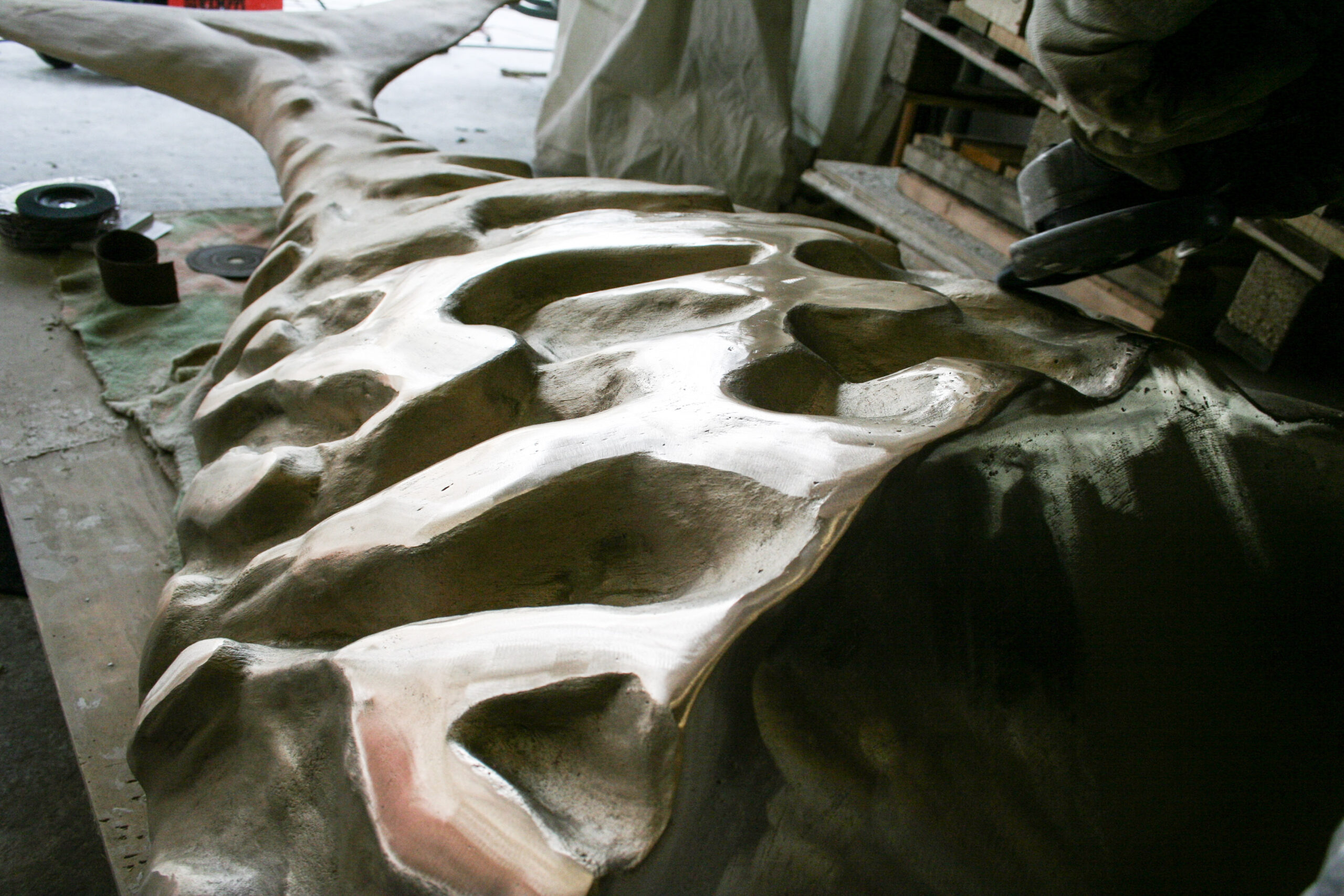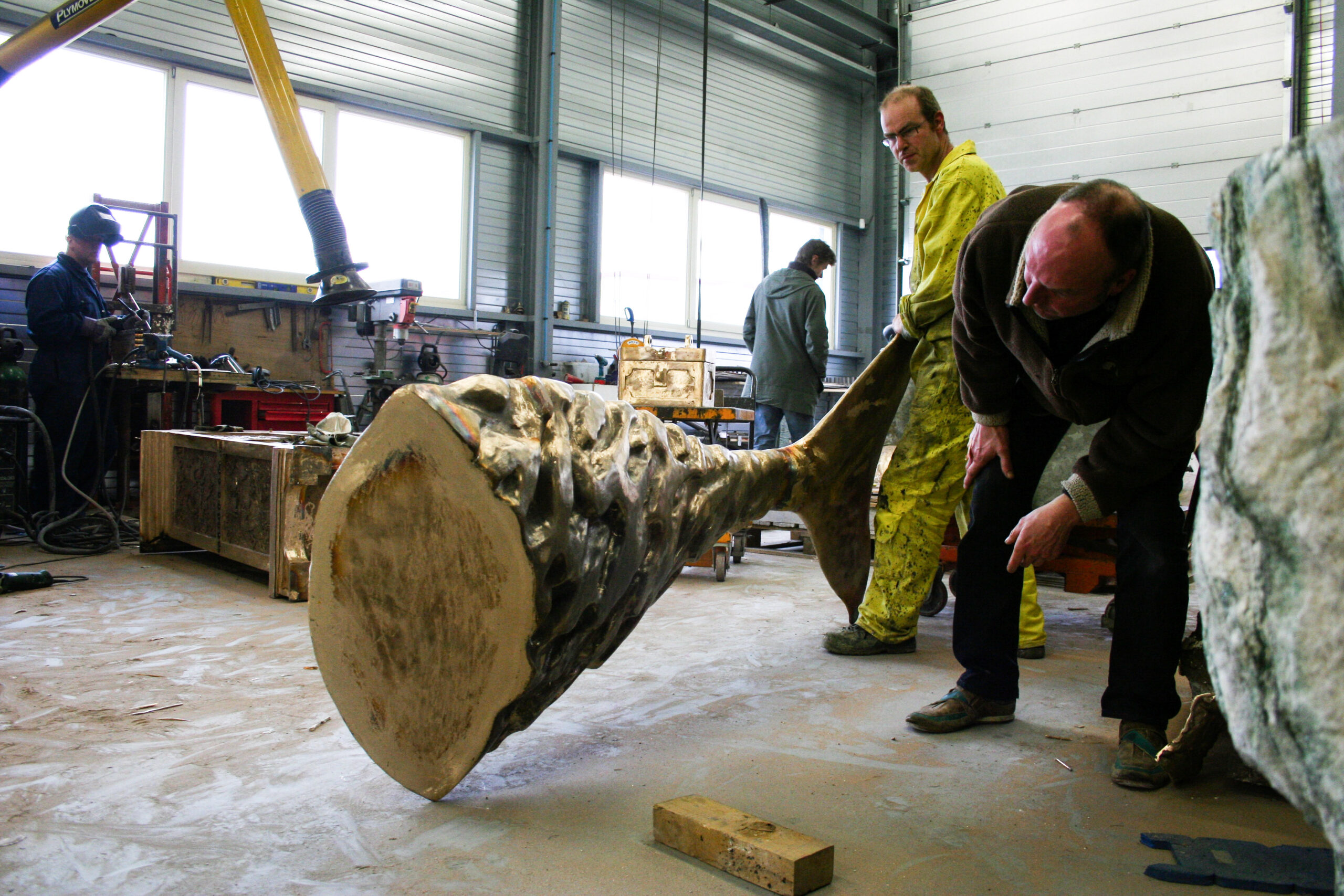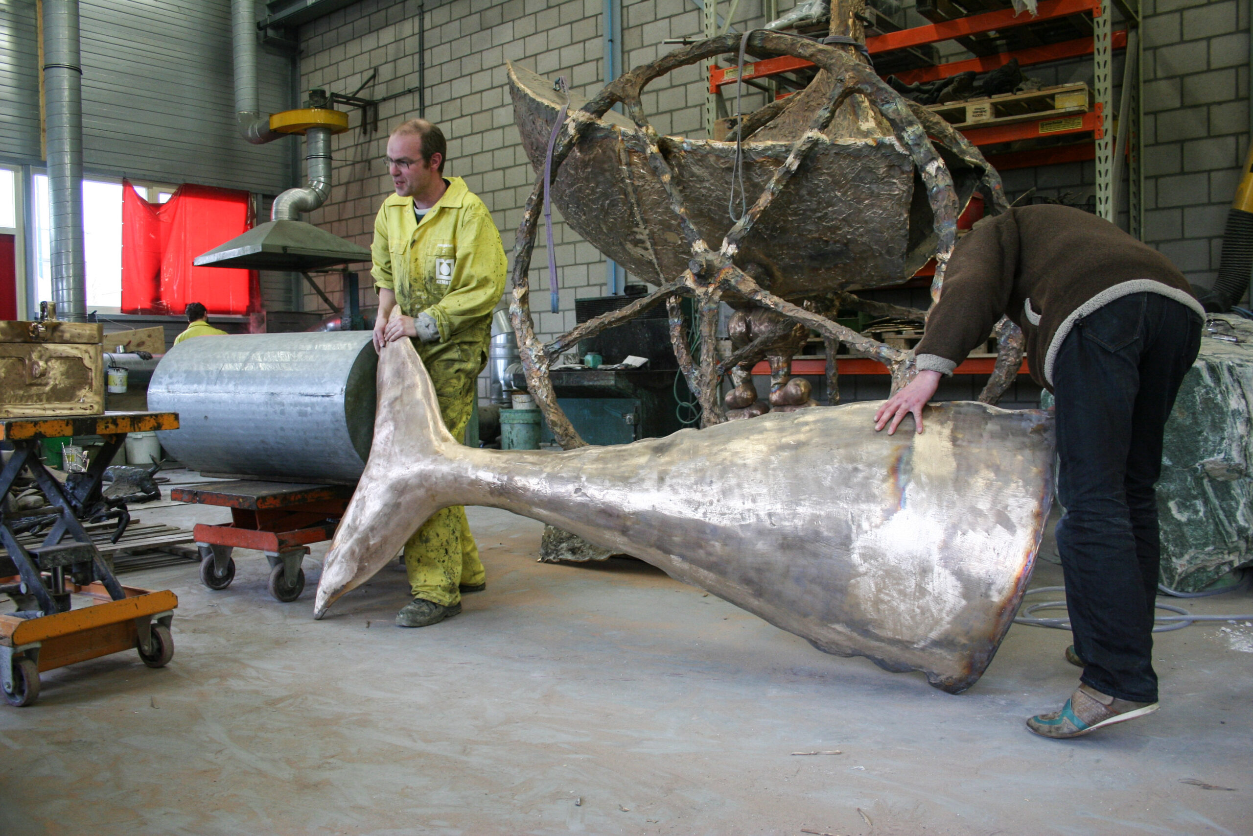 Een uitroep aan de wand. Wat zichtbaar is als een logo voor de plek, hoor je in je hoofd. Een teken waarin de bedrijvigheid van de markt weerklinkt. Ons kunstwerk is dan ook het woord VIS . De V en de S worden daarbij gewoon als letters uitgevoerd, maar de I in het woord is echter vorm gegeven als een daadwerkelijke vis. Een bronzen sculptuur. Niet van zomaar een vis, maar een vis die als op een echte markt al enigszins verwerkt is. De kop is er namelijk al afgesneden, panklaar, een gekaakte vis. Het is een robuuste vis met een sierlijk licht omhoog krullende staart. Waar normaal gesproken bij een vis schubben zitten, is het lijf van deze vis doorsneden met een wisselend diep reliëf. Het lijkt een grillig patroon, maar er zit wel een zekere logica en richting in. De logica van het water, want het is afgeleidt van zandpatronen zoals je die op een strand ziet. Waar het water het zand heeft vormgegeven. Deze vis verwijst daarmee naar zijn oorsprong, de zee. Het geeft de vis weer een beetje de dynamiek van het water. Het brons van deze vis willen we niet patineren, maar juist puur brons laten zijn, met een diep-warme gouden gloed. Daarvoor wordt de vis eerst in zijn geheel gezandstraald en daarna worden die delen die het hoogst liggen gepolijst. De gepolijste delen hebben een intense glans. De dalen in het reliëf blijven daarbij gezandstraald en zijn daarmee wat matter en ruwer. Door dit zo te doen versterken we het contrast tussen de diepere delen en bovenste vlakken in het reliëf. Daarmee verkrijgt de vis een grote mate van expressie. ( om de uitstraling van deze bronsbewerking te behouden wordt het geheel voorzien van een duurzame 2-componenten poly-urethaanlak)