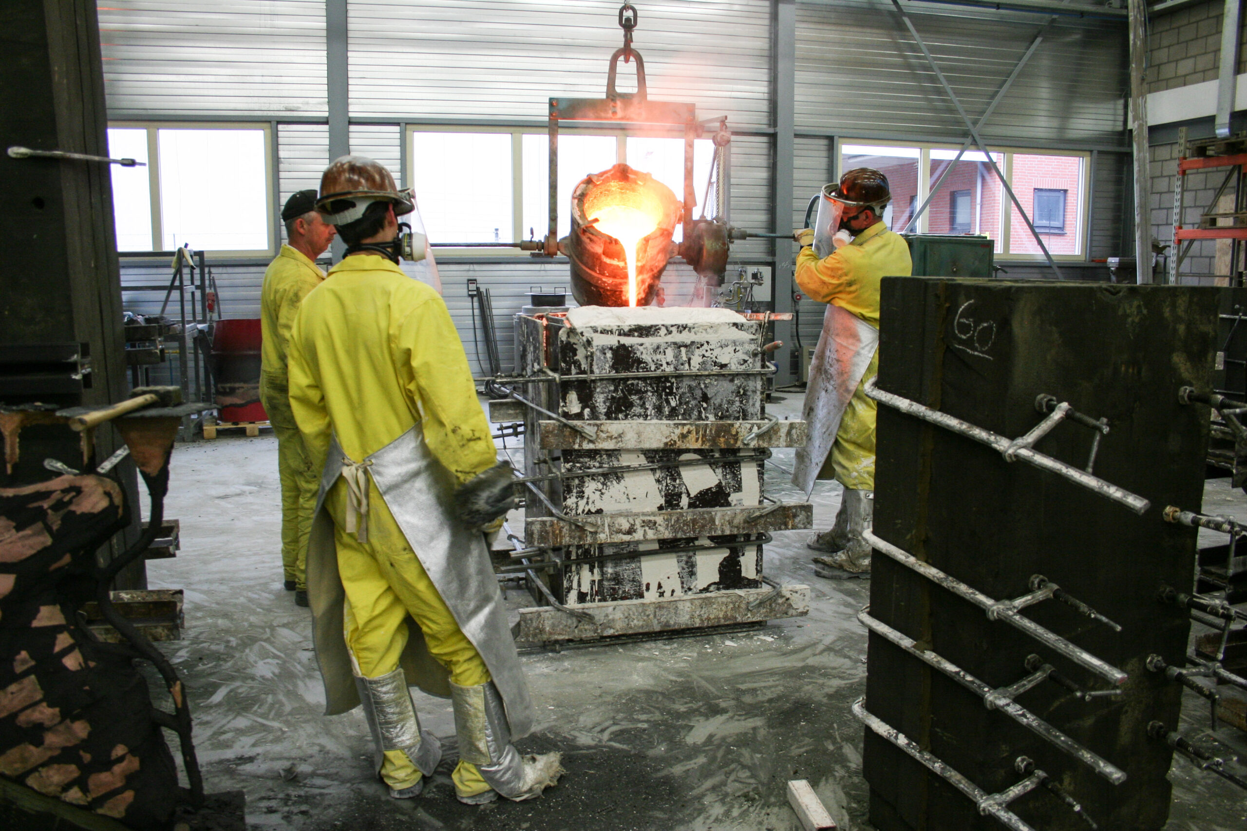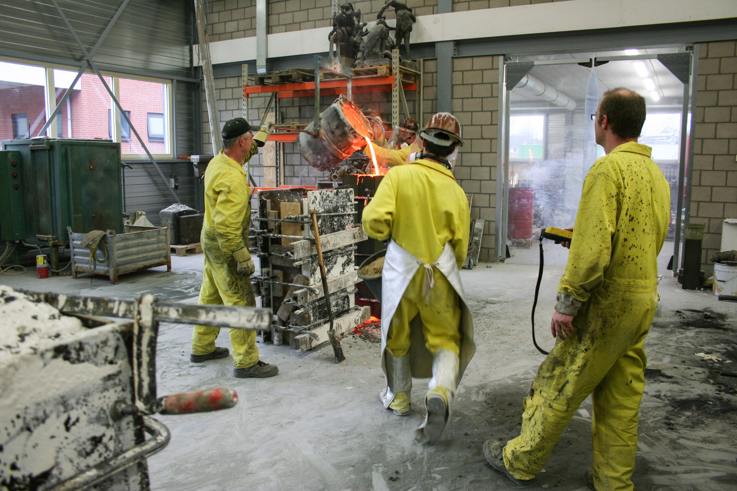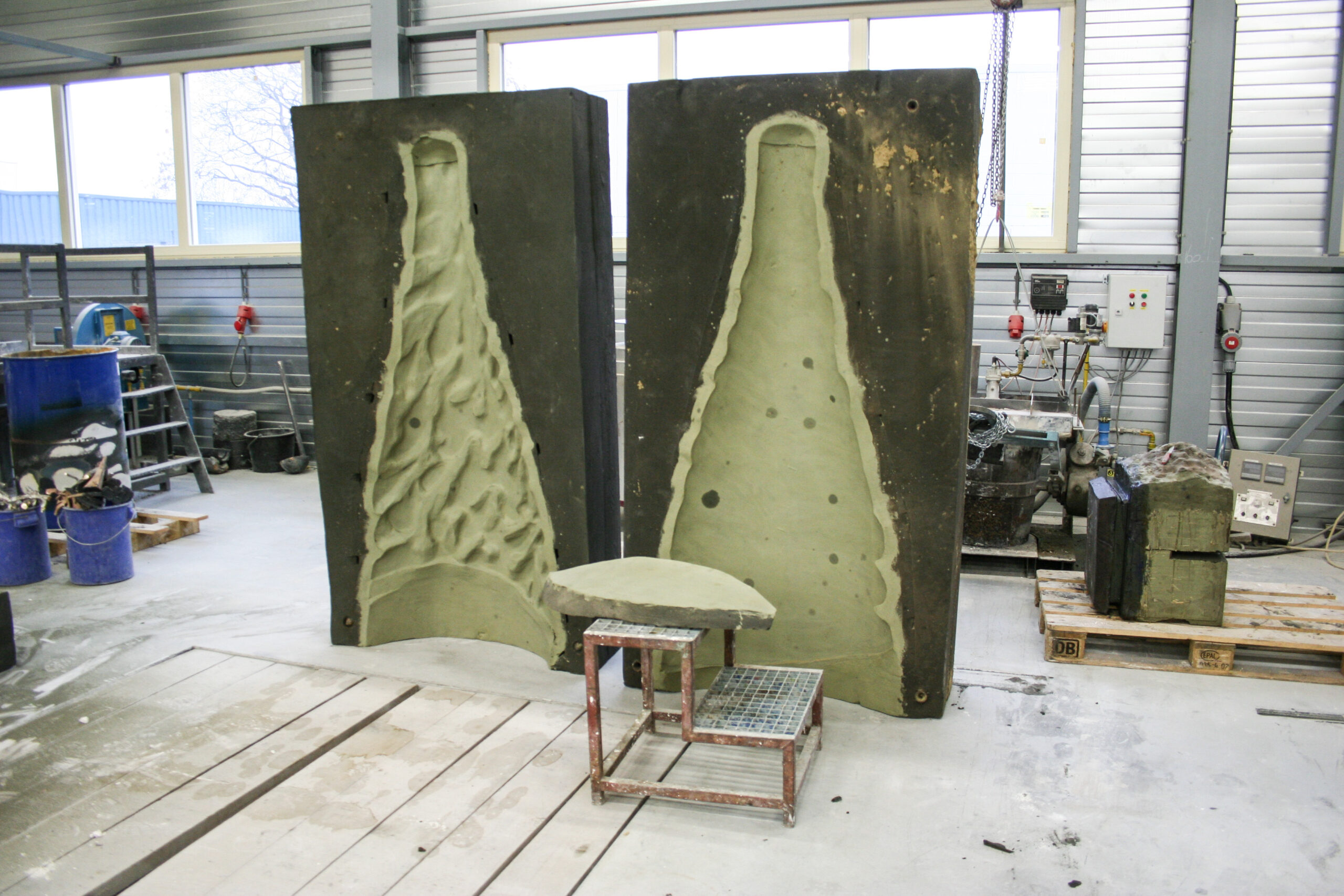 Een uitroep aan de wand. Wat zichtbaar is als een logo voor de plek, hoor je in je hoofd. Een teken waarin de bedrijvigheid van de markt weerklinkt. Ons kunstwerk is dan ook het woord VIS . De V en de S worden daarbij gewoon als letters uitgevoerd, maar de I in het woord is echter vorm gegeven als een daadwerkelijke vis. Een bronzen sculptuur. Niet van zomaar een vis, maar een vis die als op een echte markt al enigszins verwerkt is. De kop is er namelijk al afgesneden, panklaar, een gekaakte vis. Het is een robuuste vis met een sierlijk licht omhoog krullende staart. Waar normaal gesproken bij een vis schubben zitten, is het lijf van deze vis doorsneden met een wisselend diep reliëf. Het lijkt een grillig patroon, maar er zit wel een zekere logica en richting in. De logica van het water, want het is afgeleidt van zandpatronen zoals je die op een strand ziet. Waar het water het zand heeft vormgegeven. Deze vis verwijst daarmee naar zijn oorsprong, de zee. Het geeft de vis weer een beetje de dynamiek van het water. Het brons van deze vis willen we niet patineren, maar juist puur brons laten zijn, met een diep-warme gouden gloed. Daarvoor wordt de vis eerst in zijn geheel gezandstraald en daarna worden die delen die het hoogst liggen gepolijst. De gepolijste delen hebben een intense glans. De dalen in het reliëf blijven daarbij gezandstraald en zijn daarmee wat matter en ruwer. Door dit zo te doen versterken we het contrast tussen de diepere delen en bovenste vlakken in het reliëf. Daarmee verkrijgt de vis een grote mate van expressie. ( om de uitstraling van deze bronsbewerking te behouden wordt het geheel voorzien van een duurzame 2-componenten poly-urethaanlak)