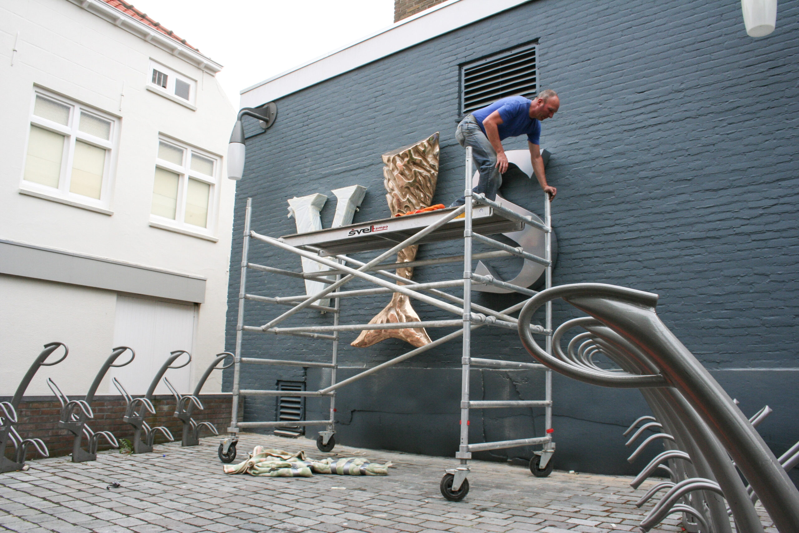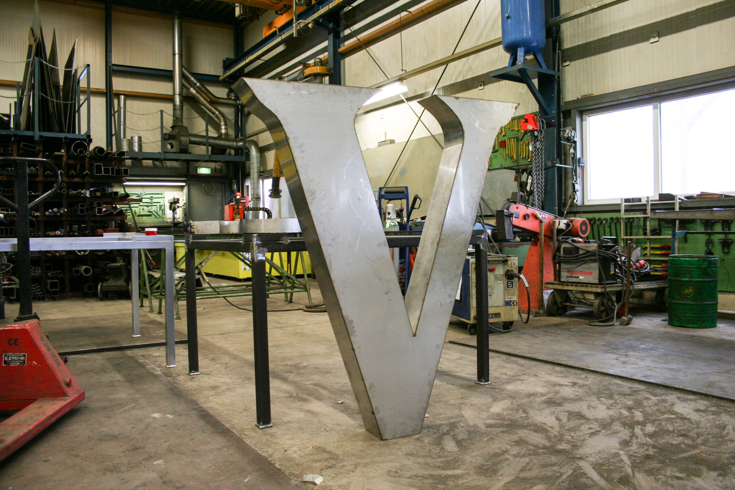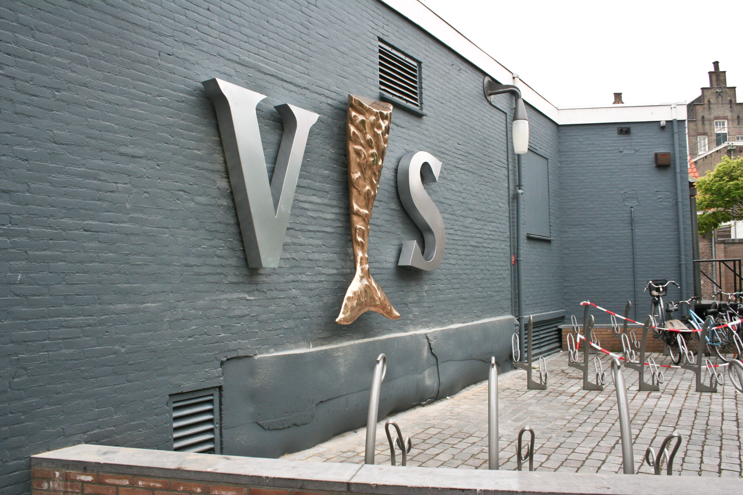 De letters V en S worden uitgevoerd in RVS plaatmateriaal en doosvormig opgebouwd. Het volume, de dikte van de letter, is daarbij in evenwicht met het volume van de bronzen sculptuur. Wij gebruiken een enigszins klassiek lettertype ( ………), maar is door ons in de vormgeving van een aantal details aangepast. Het karakter van de letter sluit daardoor nog beter aan bij de vorm van de sculptuur en de essentie van de vis. De letters worden vanuit een plaat doormiddel van snij en laswerk door ons geconstrueerd. Als eindbewerking worden zij als geheel gepareld. Hierdoor verdwijnen alle mogelijk zichtbare constructie handelingen en ontstaat er een zilvergrijze matte structuur op de letters. Hoewel het beeld zich duidelijk laat lezen als een woord, VIS, is er ook sprake van een teken. Als een Romeinse inscriptie in een zuil, het beeld van een uitroep. Zowel de letters als de vissculptuur hebben volume en maat en vullen de wand voor een aanzienlijk deel. (maten aangeven?) Het gehele beeld wordt met afstandhouders in de muur bevestigd. De vereiste bevestiging is voor een deel afhankelijk van de staat van het metselwerk waaruit de wand bestaat. In samenwerking met ingenieursbureau Van de Vlekkert uit Deventer zal de benodigde bevestigingsconstructie worden uitgerekend. Dat neemt niet weg dat voor de helderheid van het beeld als geheel, de achterwand moet worden aangepakt. Ons voorstel hiervoor zal zijn om door pleisterwerk, bijvoorbeeld een in kleur gebrachte raaplaag, alle bouwlittekens uit het verleden weg te werken.