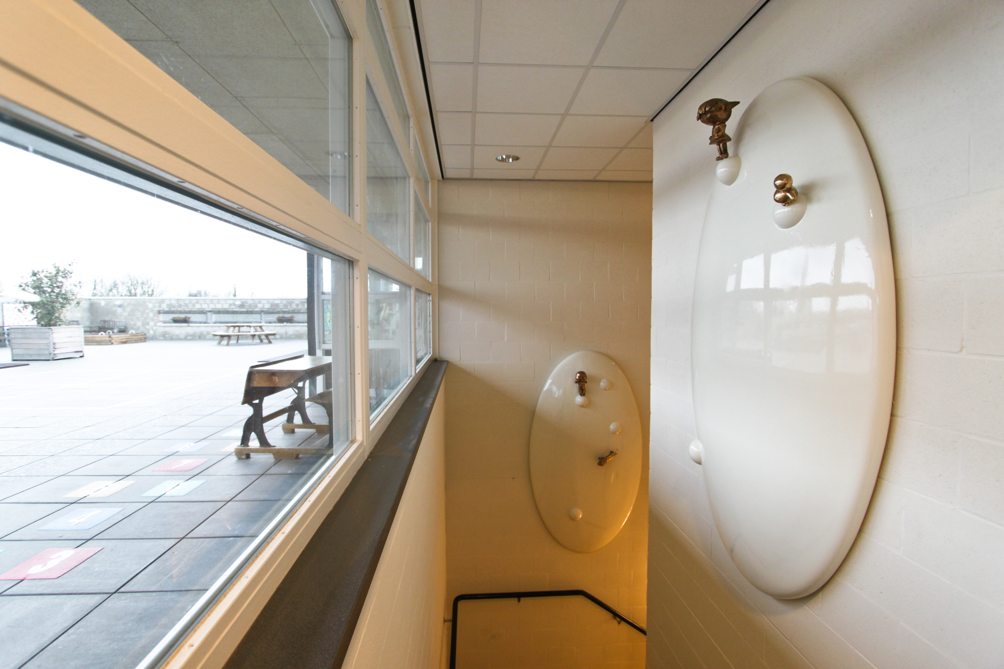 Door de omgekeerde maatverhouding ontstaat er een haast landschappelijke uitstraling, als eilandjes op de wand. De wandsculpturen worden daarmee kleine vertellingen die verhalen van een sprookjesachtige wereld. De figuurtjes de ontdekkers en scheppers van hun eigen wereld. Dit maakt dat de tweeledige opdracht van de entree buiten en het trappenhuis binnen goed in elkaar overgaan. Het weerspiegelt op een bijzondere manier het grote avontuur dat kinderen beleven op hun weg van een kleine naar een grote wereld.