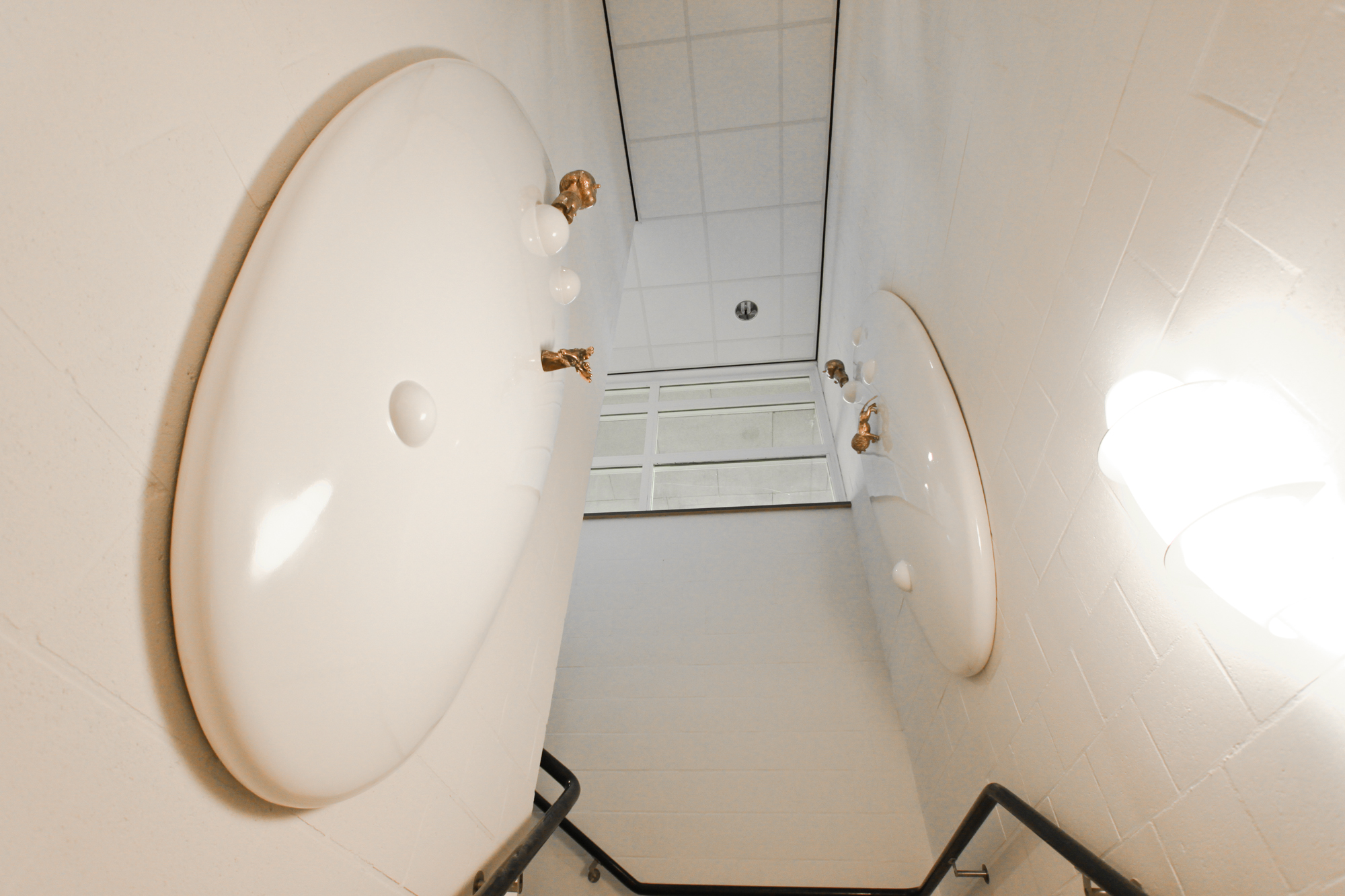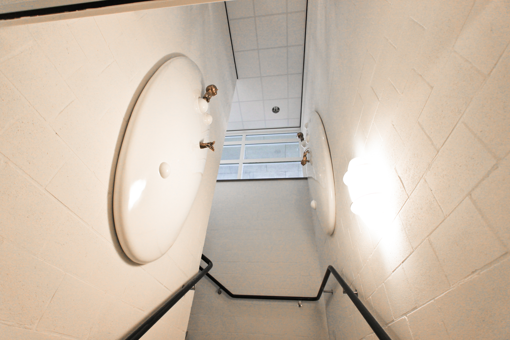 Op strategische zichtplekken bij de trappen in het trappenhuis, plaatsen we op de wand een aantal (6) van de kiezelachtige bolvormen die we ook op de buitengevel zien. De vorm is enigszins aangepast, ze zijn met name afgeplat vanwege de beperkte ruimte in het trappenhuis. Kleur en materiaalgebruik (polyester) is hier dezelfde als op de gevel. Wat we nog op deze cirkels toevoegen is een haast iconisch gebruik van de verschillende elementen die ook in de buitensculptuur te zien zijn. Opnieuw in brons en op eenzelfde manier glanzend gepolijst, maar nu in een miniatuur versie. In deze verkleinde versie zien we de pumps, de bel, de hoed en de beide figuurtjes terug komen. Ook de verzameling kiezelsteentjes zijn hier in een bronzen uitvoering als het ware als een knikkerspel zichtbaar. Op elk van de afgeplatte bolvormen is een andere combinatie van elementen zichtbaar en ook verschillend van de buitensculptuur.