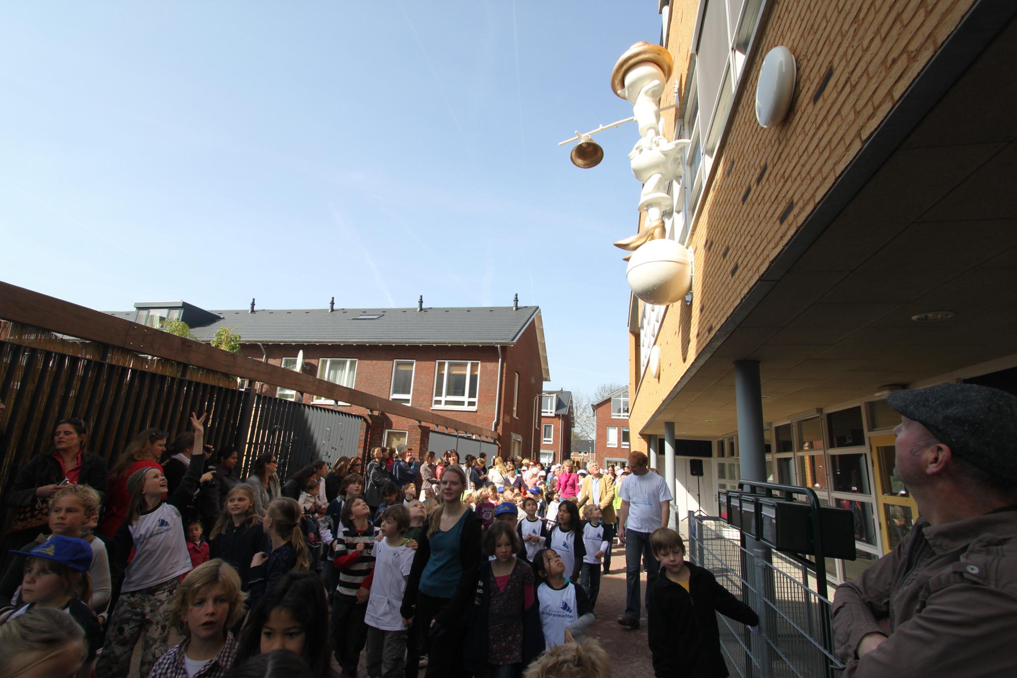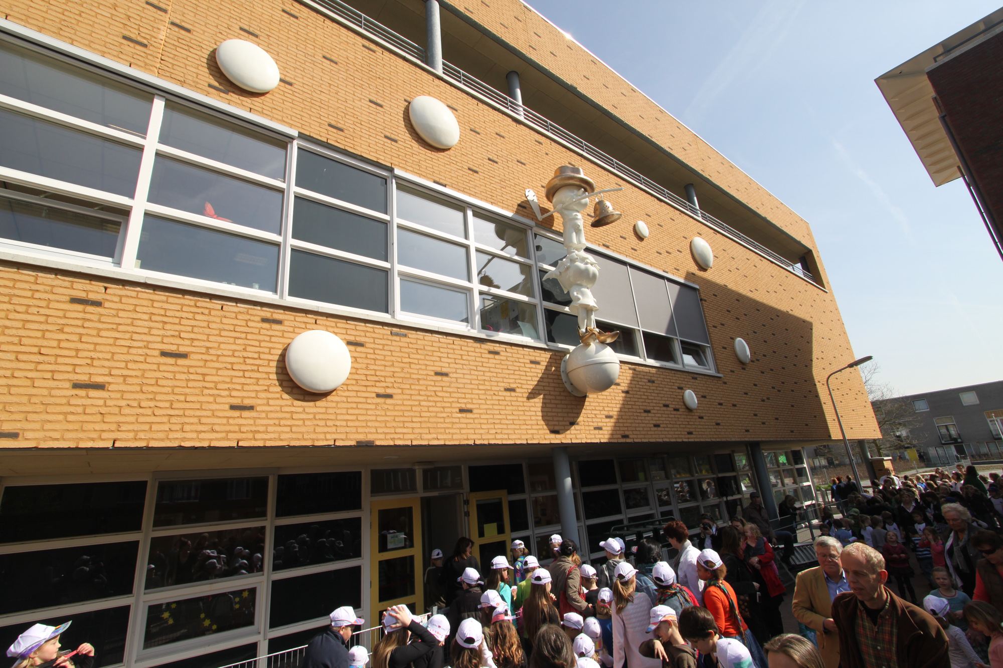 Op het hoofd van het meisje balanceert, als in een circusact, een jongensfiguur in een eigentijdse skatebroek. Op zijn hoofd een iets te grote mannenhoed. Ook de hoed, een klassiek borsalino model, is net als de pumps van goudglanzend gepolijst brons. Van zijn papa en misschien stiekem van de kapstok geplukt. Van onder de hoed steekt zijn neusje fier naar voren. Hij is zo geconcentreerd dat zijn neus er door wat langer lijkt te zijn gegroeid. Zijn korte armpjes zijwaarts gestrekt, met zijn linker arm zoekt hij een evenwicht richting de gevel, in de rechter heeft hij een lange stok. Aan het einde van de stok hangt een bronzen bel, een ouderwetse vertrouwde schoolbel. Als hij zijn best zou doen, en dat doet ie, zou hij zo telkens weer de nieuwe schooldag in kunnen luiden.