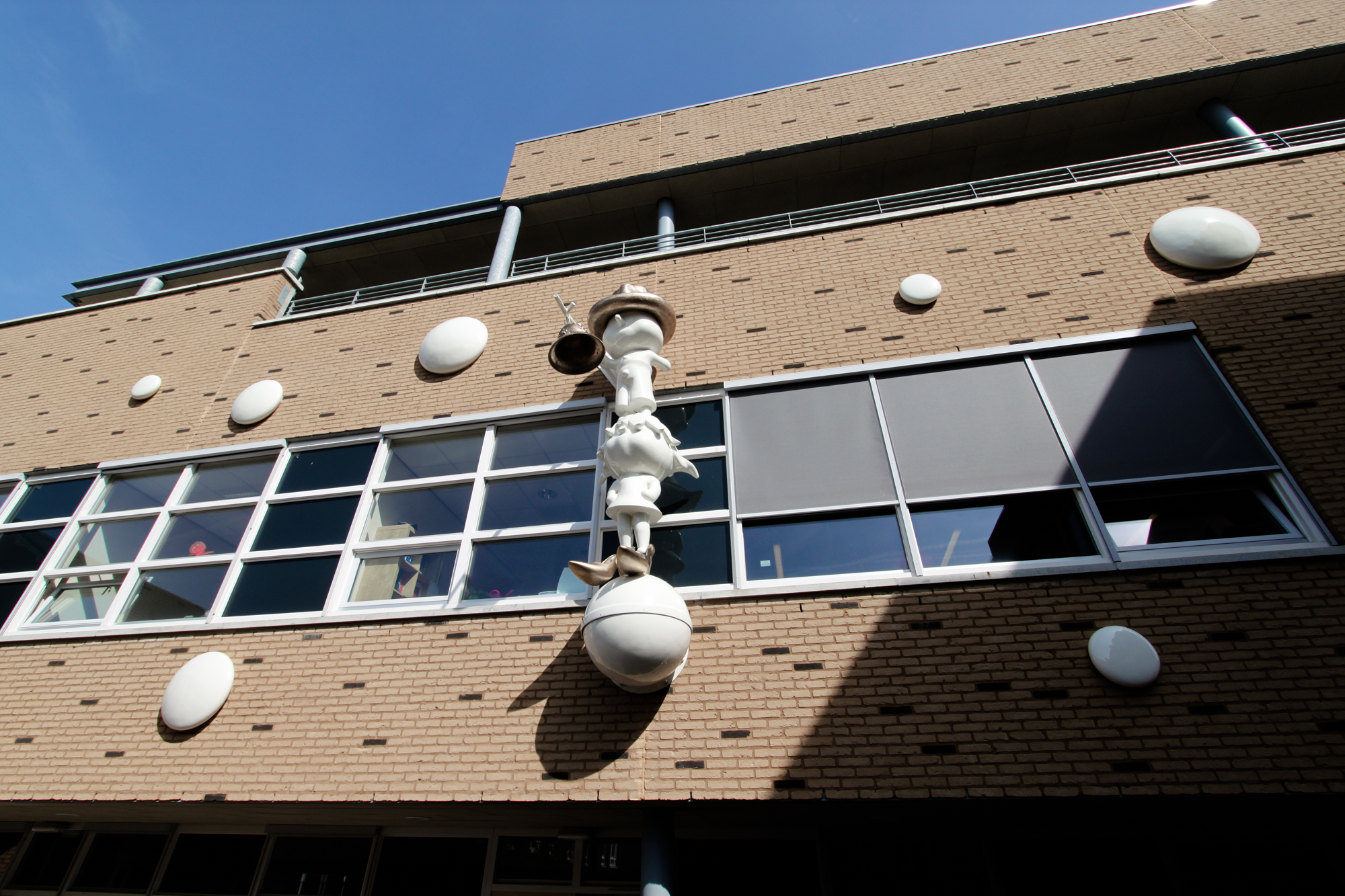 Verdeeld over de gevel, als een knikkerspel dat even is blijven liggen, zijn kiezelachtige bolvormen aangebracht. Zij doorbreken door hun vorm en plaatsing de formaliteit en de strengheid van de gevel. Maar vooral creëren zij een speelveld, bijna als een toneelsetting, waar een groter avontuur zich afspeelt.
