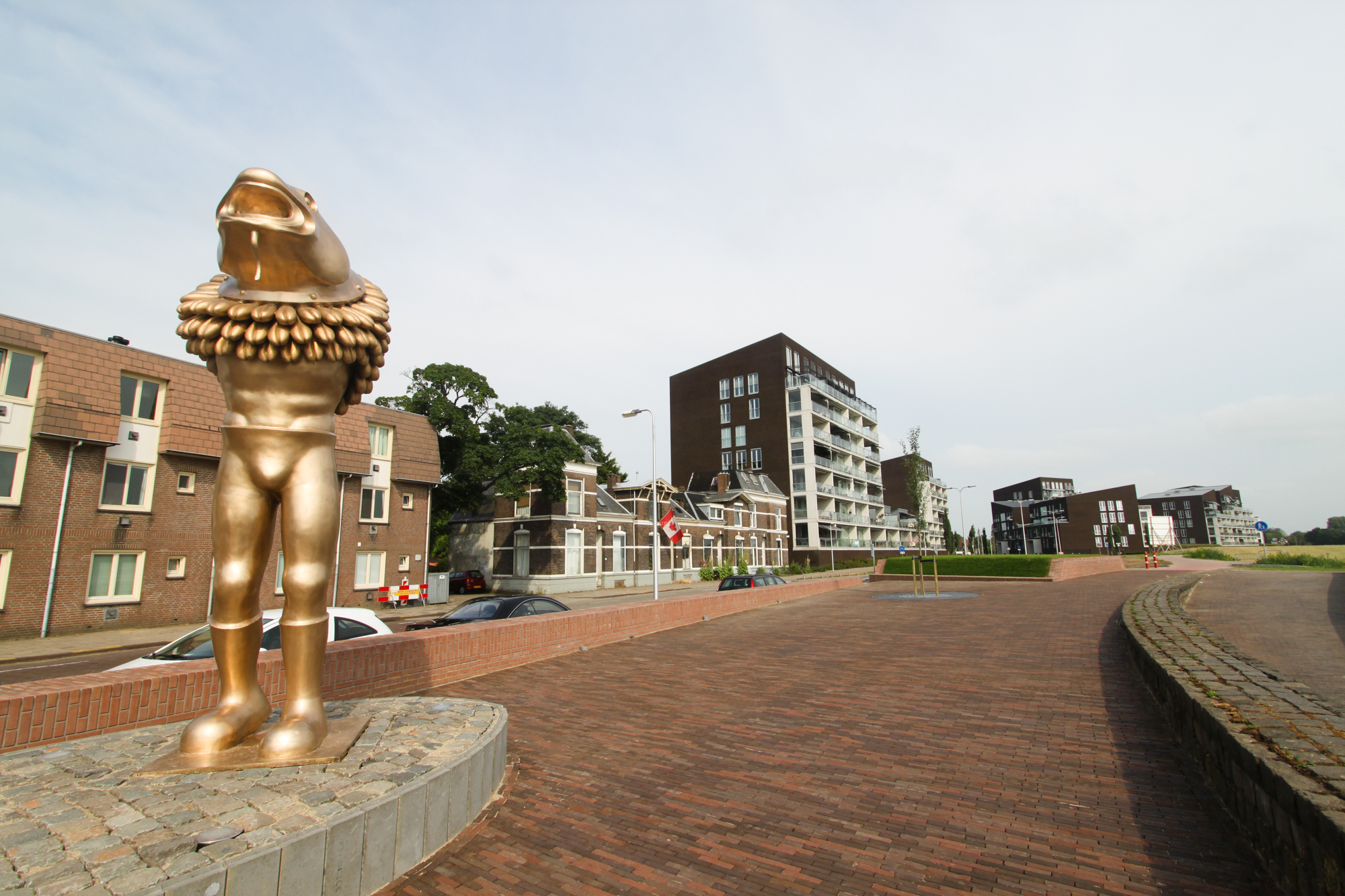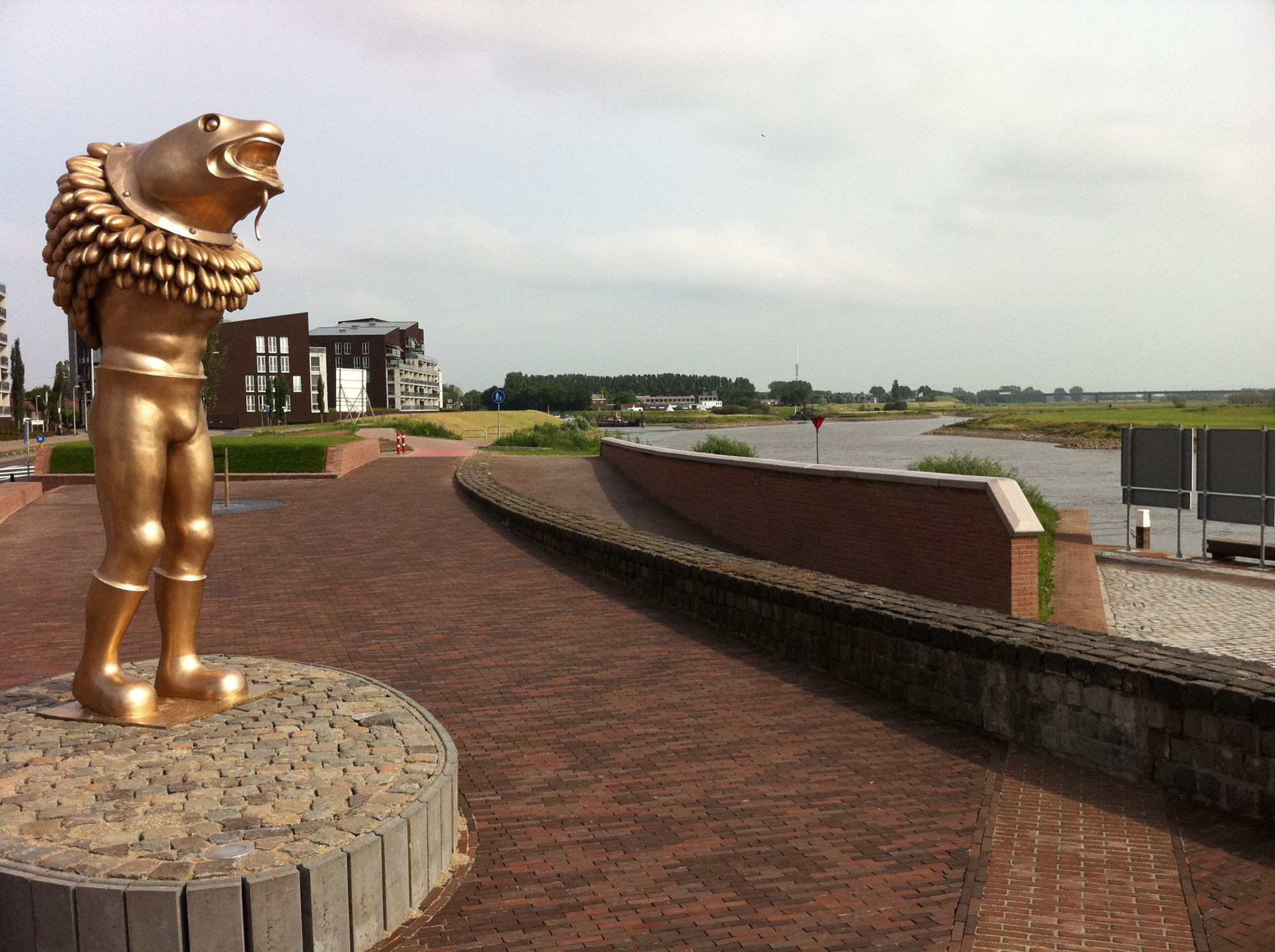 En dan is er in dit beeldende epos natuurlijk de vissenkop. De kop richt zich naar buiten en kijkt als het ware over de stadsgrenzen, tot ver voorbij de horizon. Ook Deventer heeft als stad altijd de blik op de wereld gericht gehouden. De rivier de IJssel is daarin cruciaal. Lange tijd was de rivier voor Deventer de belangrijkste verbinding met de rest van de wereld. De vissenkop refereert aan de rivier en de verbinding die gemaakt kon worden. Bovendien is het de kop van een kabeljauw. In de tijd van de Hanze werd gedroogde kabeljauw uit Noorwegen veelvuldig hier in Deventer verhandeld. Het is deze stokvis uit Bergen die maakte dat Deventenaren in de wijde omtrek de bijnaam ‘stokvissen’ kregen. En nog steeds is voor veel inwoners van Deventer de stokvis een levend begrip.