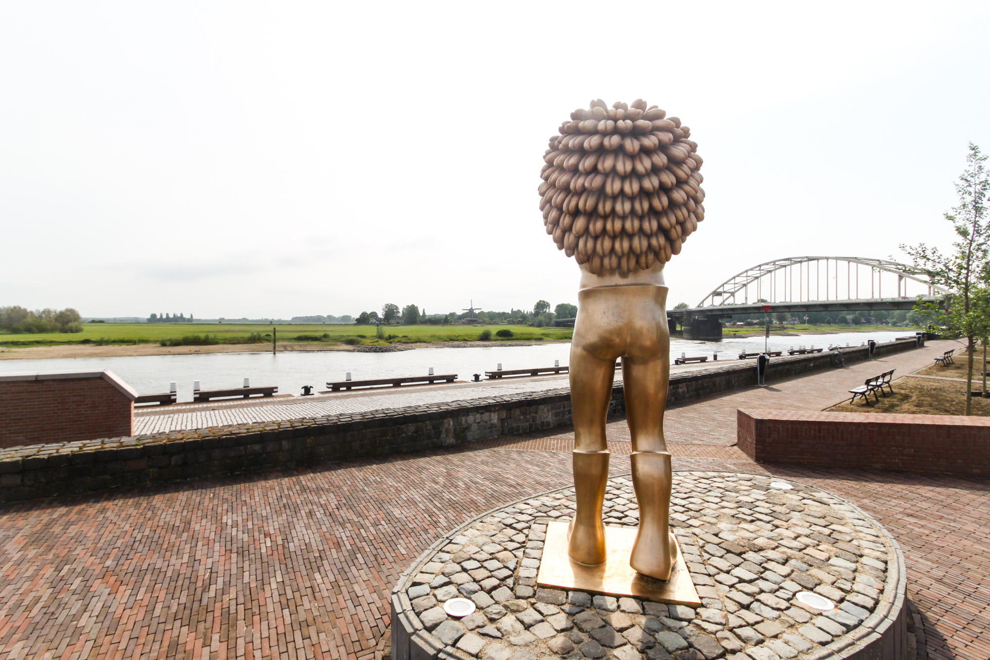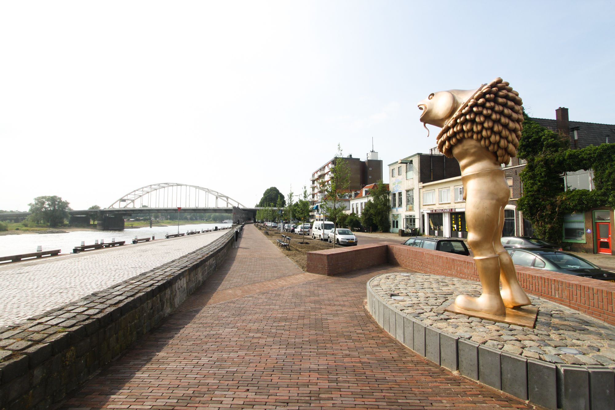 Op deze plek worden goed beschouwd twee momenten in de geschiedenis van Deventer met elkaar verenigd: het verdedigingswerk en de overslagkade. Zo’n versmelting van geschiedenis streven wij in ons voorstel na. De locatie heeft een open karakter, maar wordt tegelijk gedomineerd door grote bouwvolumes rondom. In ons voorstel zoeken wij niet de confrontatie met die bouwvolumes, zoals de Wilhelminabrug of de Pothoofdflats van Jo Crepain. Wij streven juist naar een grote mate van eigenheid. En in die eigenheid willen we dat het beeld zich onderscheidt van de omgeving, zonder dat er sprake is van concurrentie. Wij willen dat het beeld onlosmakelijk verbonden is met deze plek en tegelijk als een zelfstandig gegeven gezien kan worden. Juist dan behouden alle elementen, kunstwerk en bouwwerken, hun eigen waarde. De IJssel stroomt hier uitbundig tegen de kade en door de nabijheid van de rivier krijgt de locatie een landschappelijk element. Ook de landelijke open ruimte van de tegenover liggende oever beïnvloedt de locatie. Beide elementen, rivier en open ruimte, maken de plek bijna tot een podium. Het idee dat de stad zich hier laat zien wordt er door versterkt. Dit stuk IJsselfront nodigt uit een nieuw visitekaartje van de stad te worden. Wij willen realiseren dat de stad zich hier niet alleen in gebouwen, maar ook met een beeld toont.