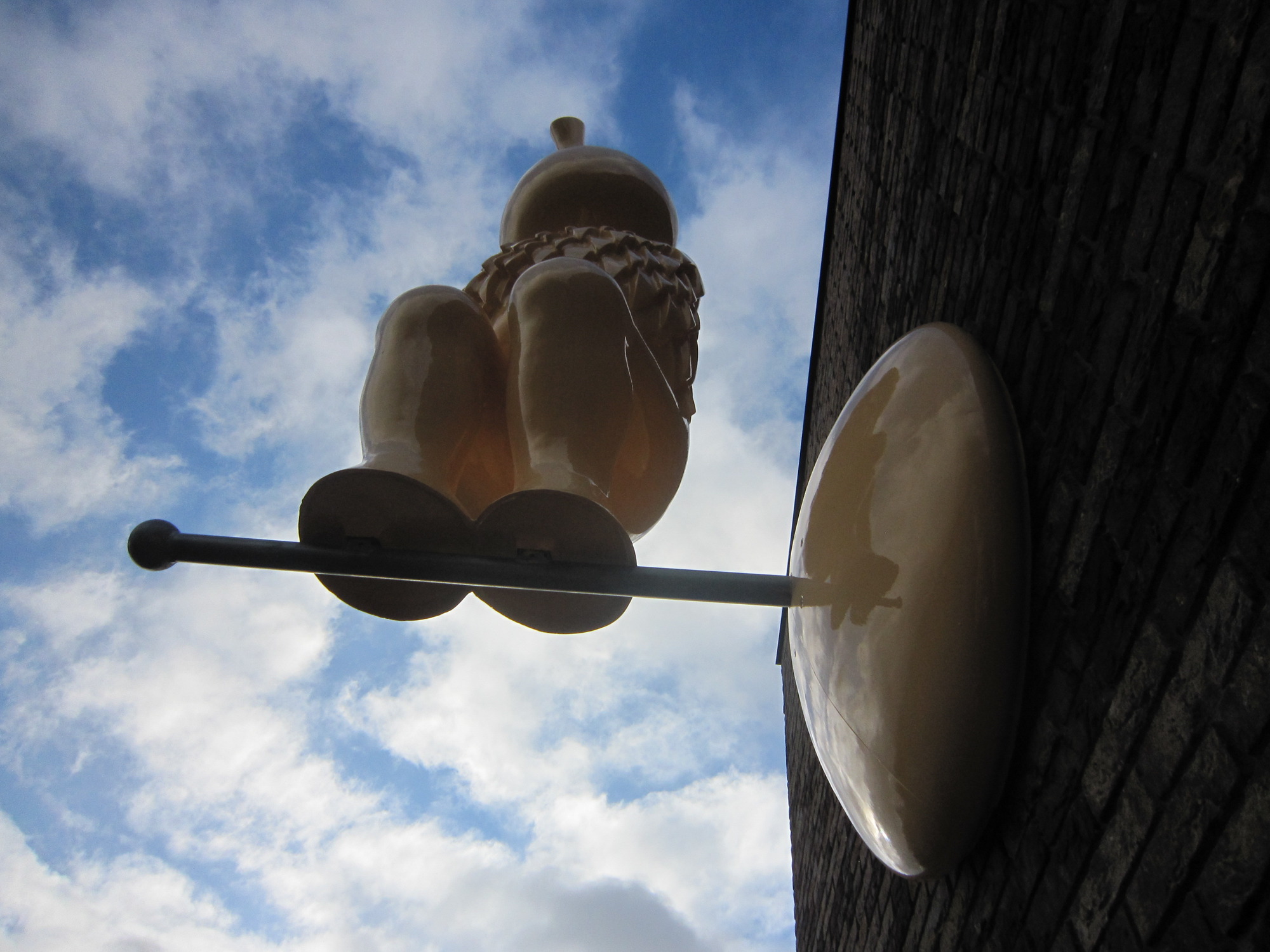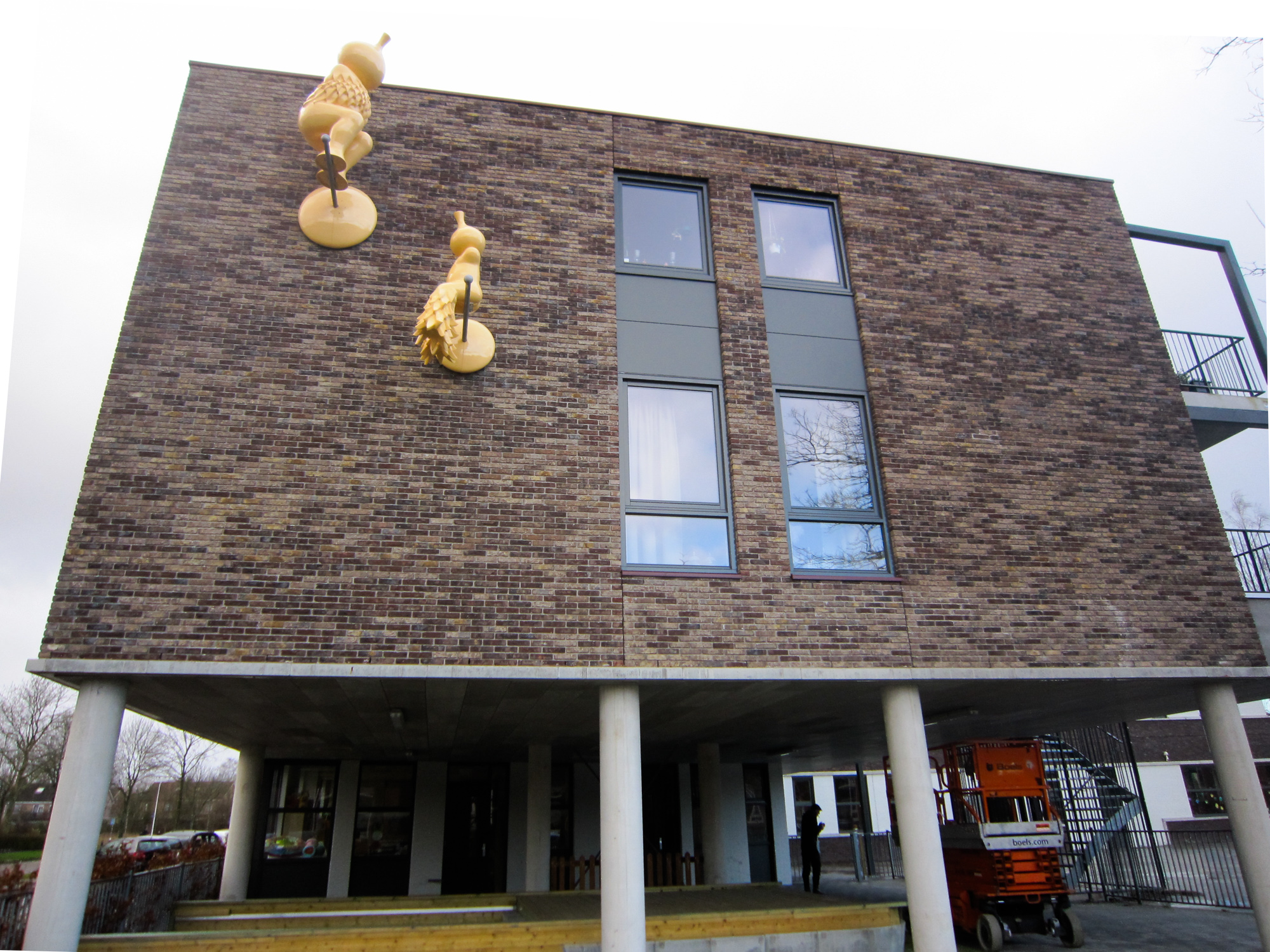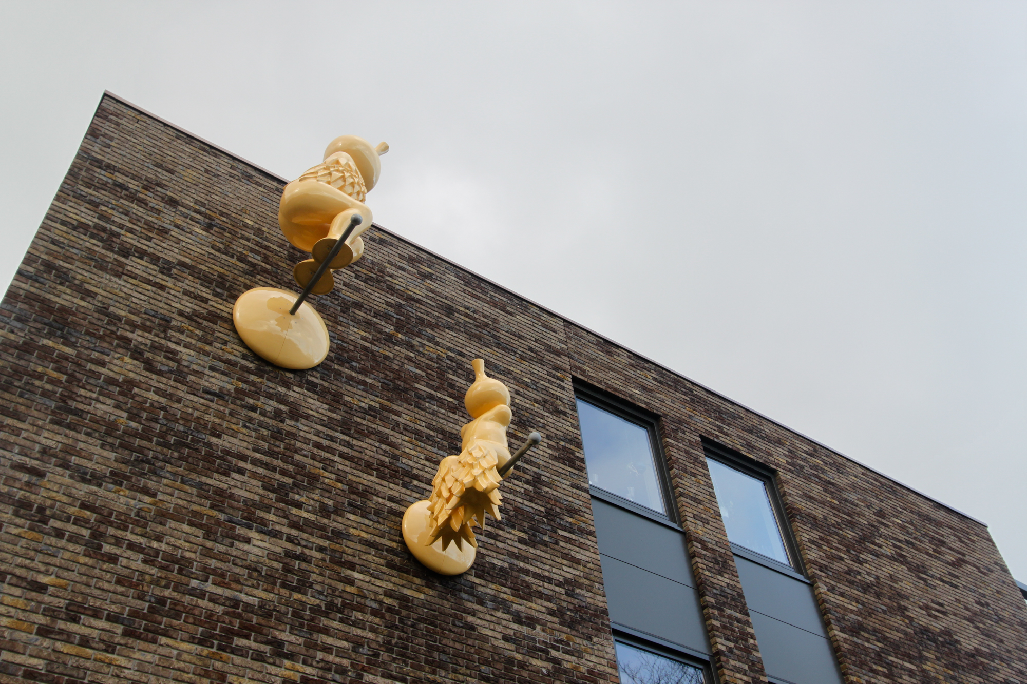 Sculptuur. Voor het beeld hebben wij gekozen voor twee vogelachtige figuren. De figuren zijn gemodelleerd naar een menselijk lichaam, maar hebben onmiskenbaar vogelkarakteristieken in zich. Het menselijk aspect is nog wel herkenbaar, maar sterk gereduceerd. Ze zijn een beetje dikkig en wat onbeholpen, zoals Takkelingen dat kunnen zijn. De figuren zijn helder en eenvoudig van vorm, waardoor de aandacht vooral uitgaat naar lichaamshouding, het kleine tuitje bij de kop, de navel op de buik en vooral het meer gedetailleerde verendek. De vogelkenmerken overvleugelen daardoor het menselijke in de vorm. De figuren komen duidelijk uit hetzelfde nest, maar de vogelkenmerken hebben zich bij elk op een verschillende manier ontwikkeld. De een is echter ook wel wat volgroeider dan de ander. De grootste van de vogelfiguurtjes is hoog op de gevel geplaatst en staat op een soort van neststok die uit de muur steekt. Bij deze figuur heeft zich rond zijn torso, vanaf de schouders een verendek ontwikkelt. Een korte verenmantel die nog net de navel op de buik vrij laat. Het zou een aanzet tot de vleugels kunnen zijn, die nog wat verborgen liggen op de huid. De grootste heeft dan wel de maat van een volwassen man, de lichaamsverhoudingen van beide figuren maakt echt duidelijk dat het hier om vogelkuikens gaat. De grootste staat wat gespannen op zijn stok, alsof hij op het punt staat zich te strekken naar het hoogste punt, de dakrand. Al lijkt hij nog wat onzeker, zijn kleine tuitje staat vastberaden gericht op de daklijst. Er is misschien sprake van een kleine aarzeling, wachtend op het goede moment om met een grote stap zijn horizon indrukwekkend te verbreden.