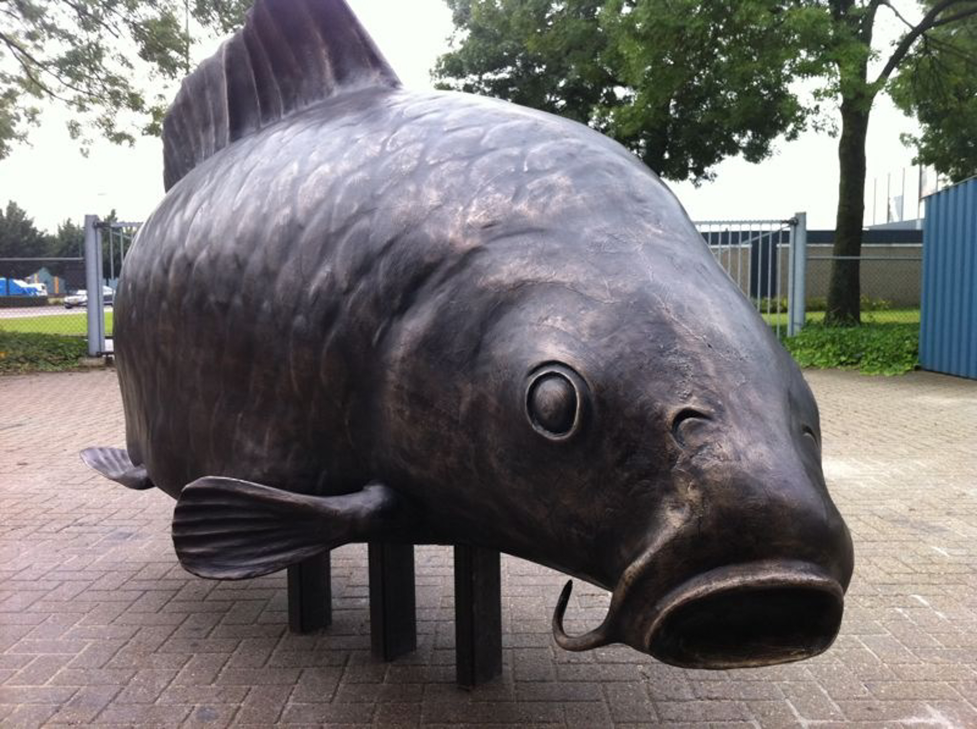 Elke stad heeft eigen verhalen. Kampen heeft zo al zijn eigen ‘ kamper steur ‘, maar in deze kleine fabel speelt de karper een hoofdrol. Een karper die de stilte van de onderwaterwereld verruild heeft voor het vrolijke rumoer van spelende kinderen in de buurt. Alsof hij ook wel eens wil voelen hoe het is om op een luchtmatras een keer boven het water te zijn. Of is het gewoon een treetje eieren waarop hij lijkt te broeden. Hoe dan ook, met zijn gouden gloed ligt hij hier in stilte te mijmeren. Pronkend op zijn bed, zijn eigen gecapitonneerde divan, als een prijsvis op een kussen. Deze karper, de burgemeester van de kreek, een beetje dikkig kunnen ze zijn, maar steeds statig en majestueus. Niet voor niets geliefd bij menig sportvisser. Die altijd hun vangst liefkozend in de armen nemen, op de foto zetten en dan voorzichtig als een pasgeboren baby weer in het water laten glijden, daar waar hij hoort. En al ligt deze vis op het droge, dit beeld ademt van rust en eigenheid. Dit is een vis die ten alle tijden zichzelf blijft.