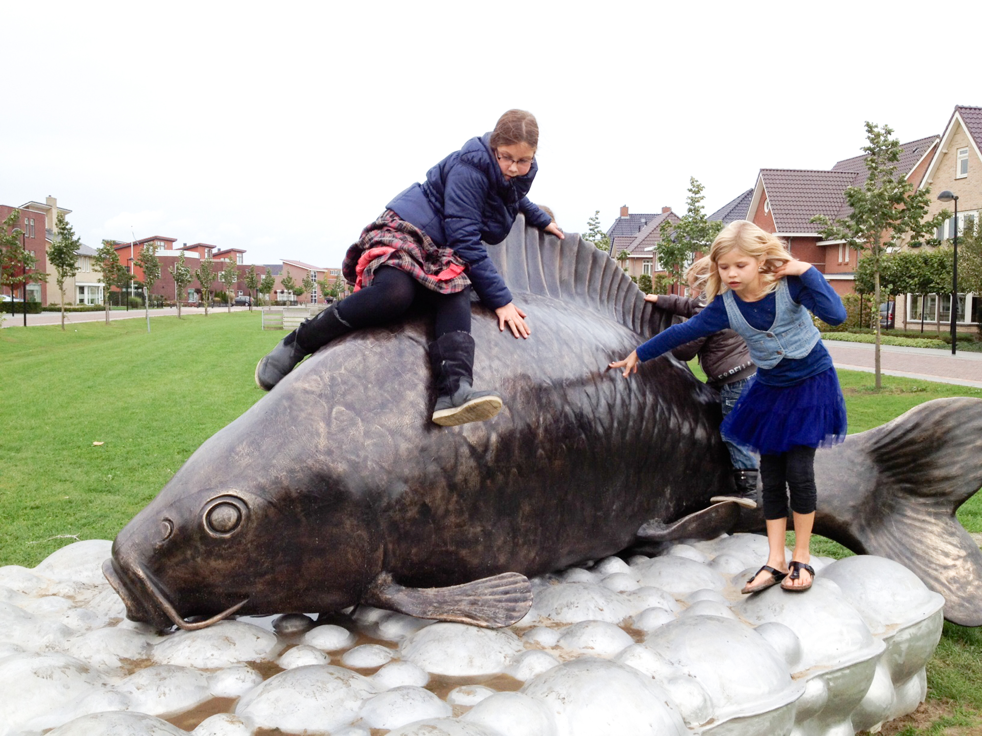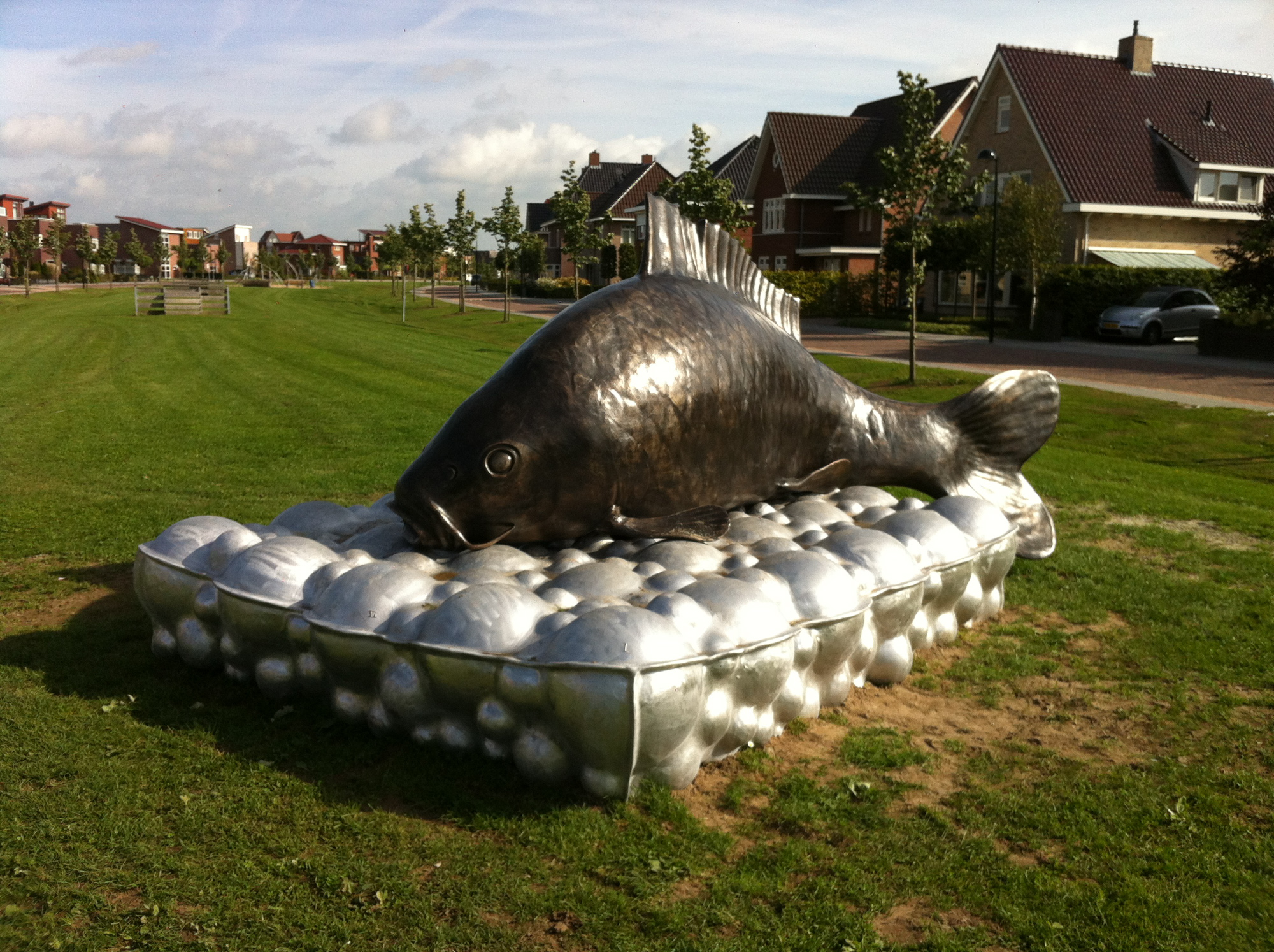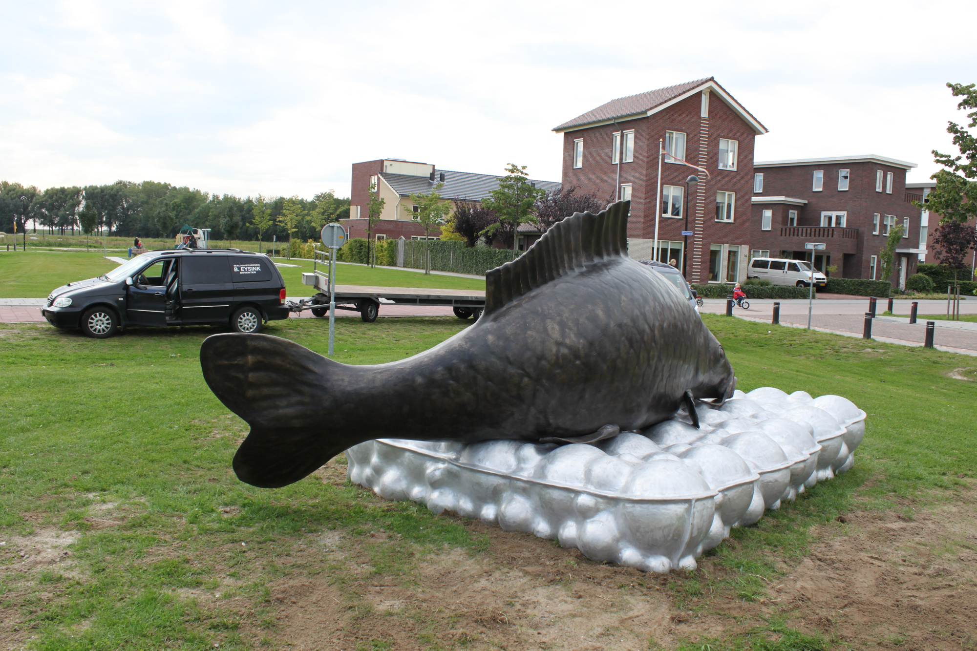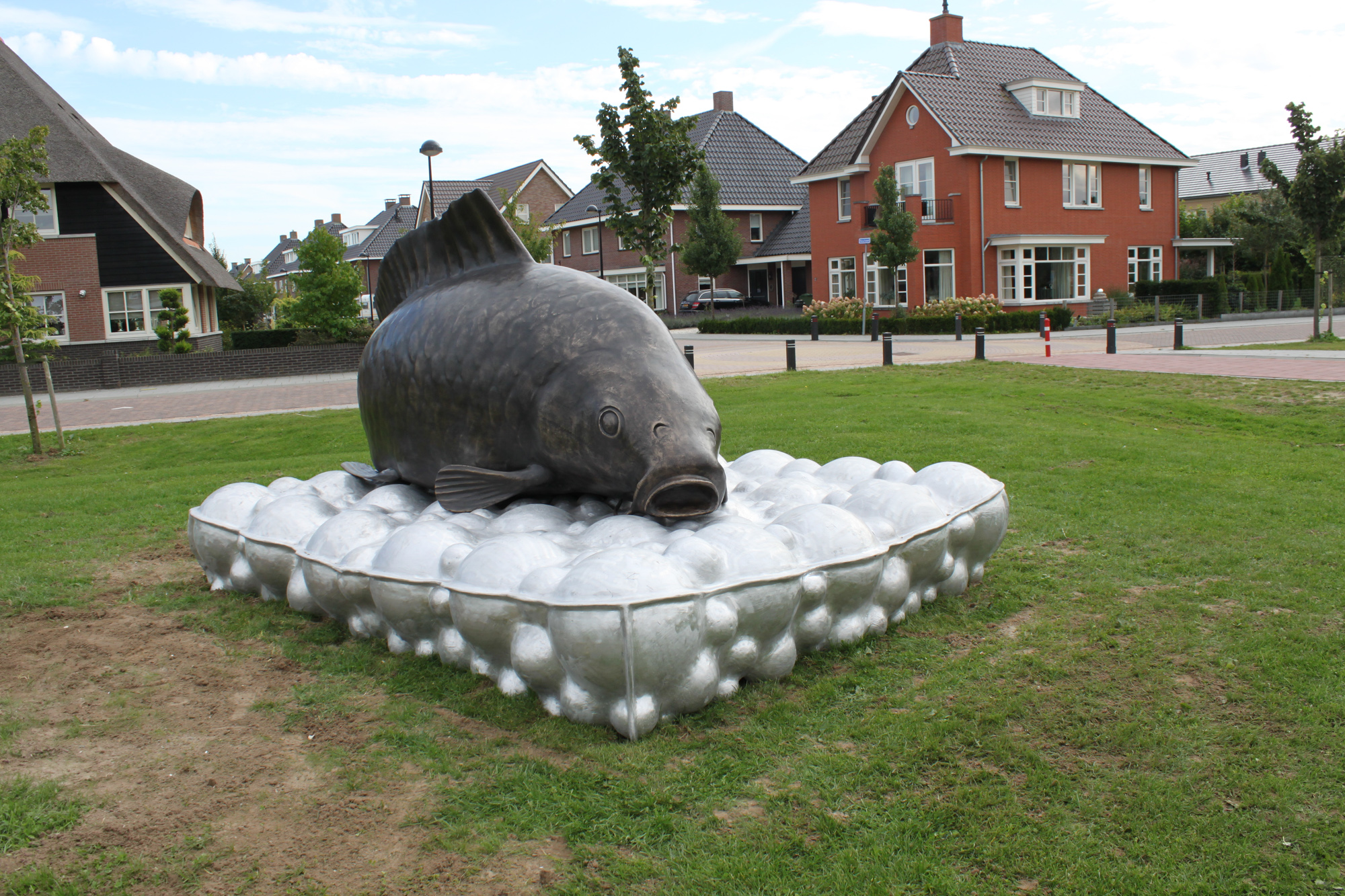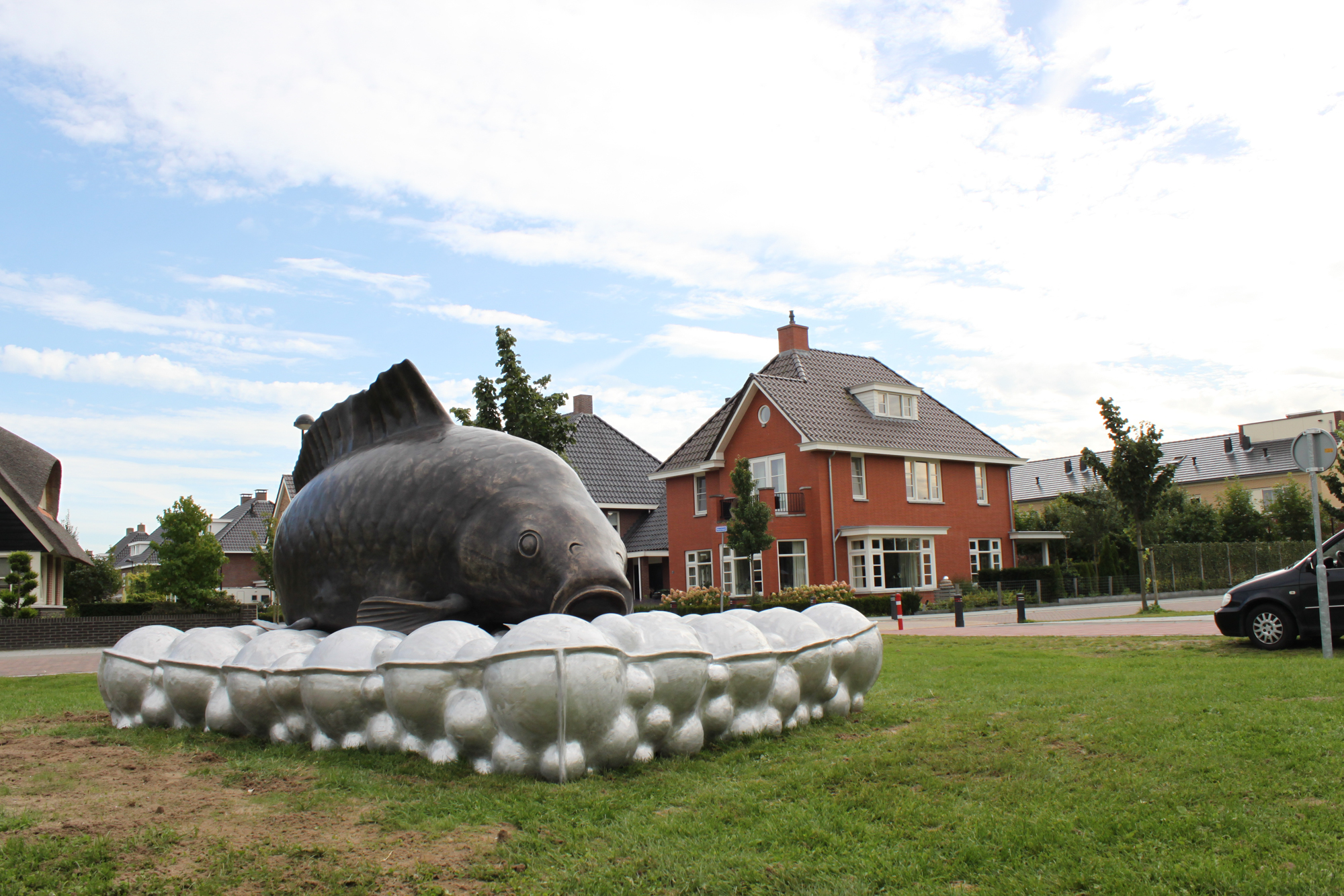 Naast de eerste brug, vanuit De Hoogte bezien, staat in De Bongerd ons 3e beeld. In het verlengde van de daar aanwezige hof, met zicht op het water. Daar ligt, als in een modern stilleven met vis, op een bed van witte bollen verstild een grote bronzen karper. Het is een karper met een blozend gezonde uitstraling. Goed geproportioneerd en met kenmerkende details gemodelleerd. Het brons is glanzend gepoetst en toont vol trots zijn eigen gouden gloed. Het bed is van aluminium, voorzien van een glanzend roomwitte coating. Het klassiek glanzende brons maakt van het bollenbed bijna porselein. Het bed lijkt voor de karper op maat gemaakt. De bollen reiken tot net onder de knie, zijn strak in het patroon gerangschikt en in de ruimte tussen de bollen vloeien ze aaneen.