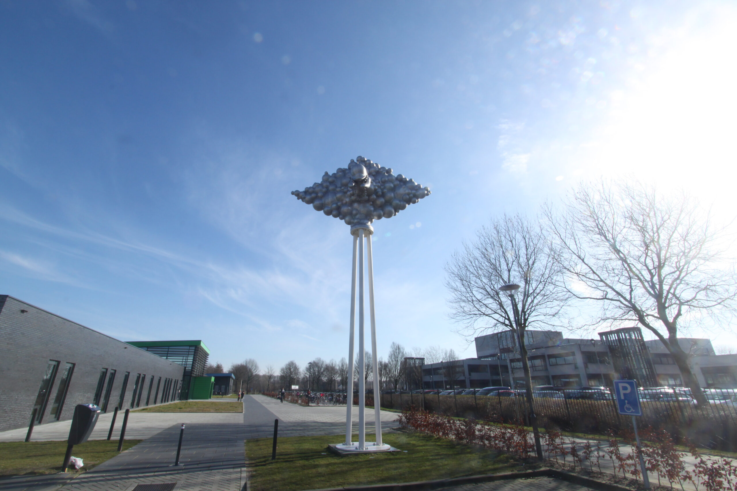 Het billboard dat wij voorstellen staat op de grote parkeerruimte aan de zijde van de Ossenkamp. Het is gesitueerd in de nabijheid van de hoek van het zwembad. Het staat, zoals gebruikelijk bij een billboard, op een hoge zuil die gerelateerd is aan de hoogte van het gebouw. Boven op de zuil staat een horizontaal liggende ruitvorm, als een enigszins uitgerekt wiebertje. De ruitvorm is in zijn geheel opgebouwd uit bollen van verschillende afmetingen. Het grootste volume, dikte, is in het centrum van de ruitvorm en dat volume verjongd zich naar de randen. Daar zijn ook de meeste kleinere bolletjes. Dit maakt het tot een expansief geheel met een enigszins naar buiten toe uitdijende vormbeweging.