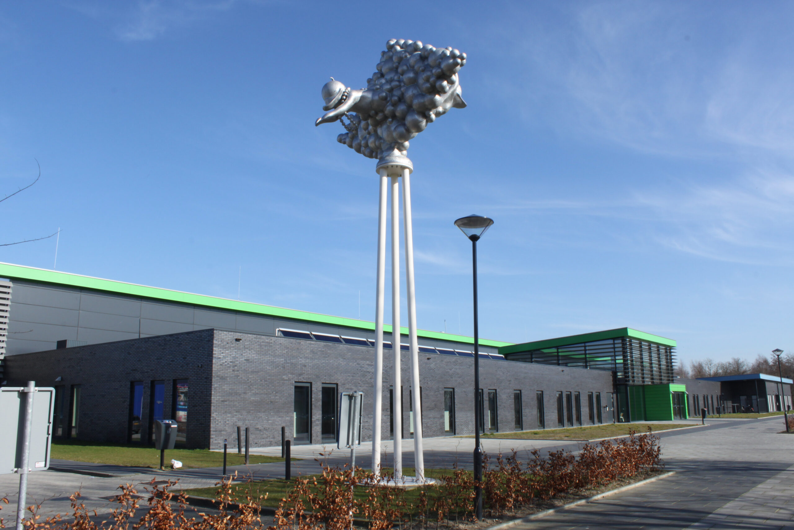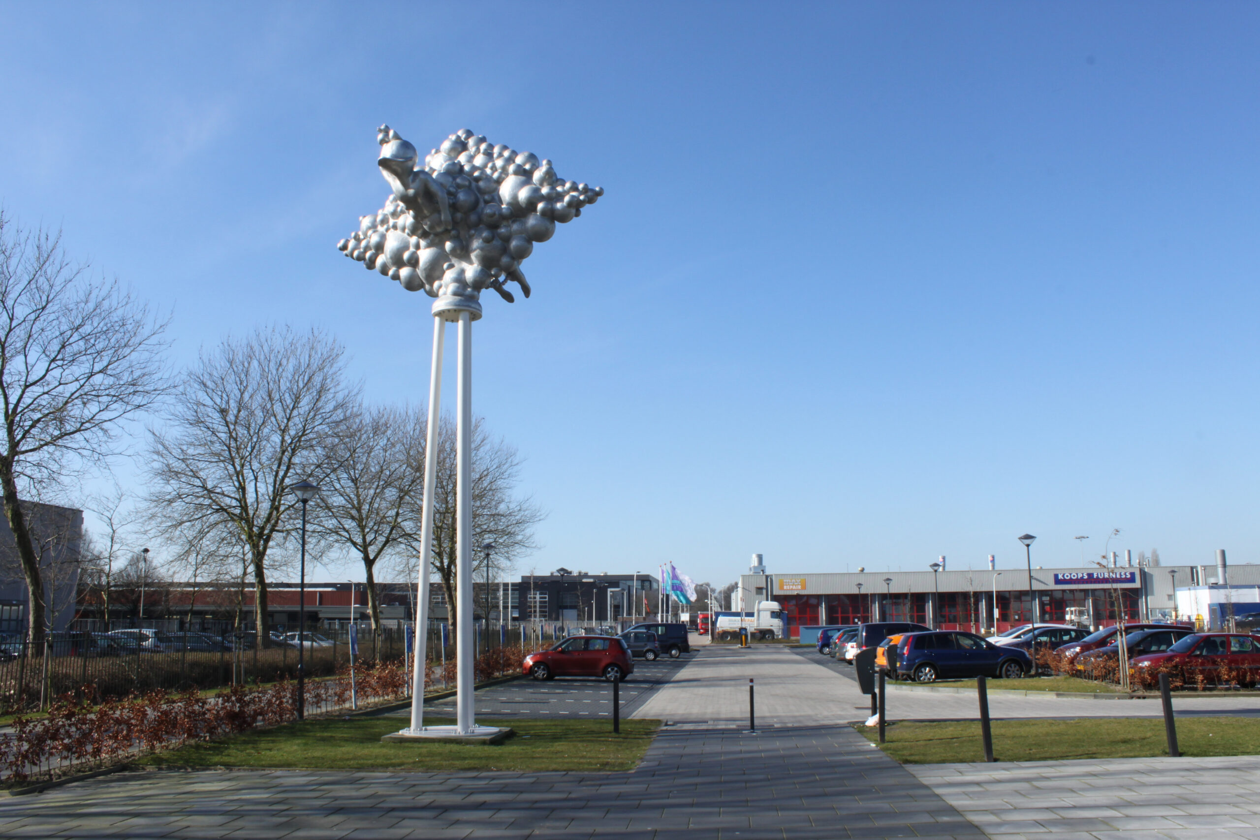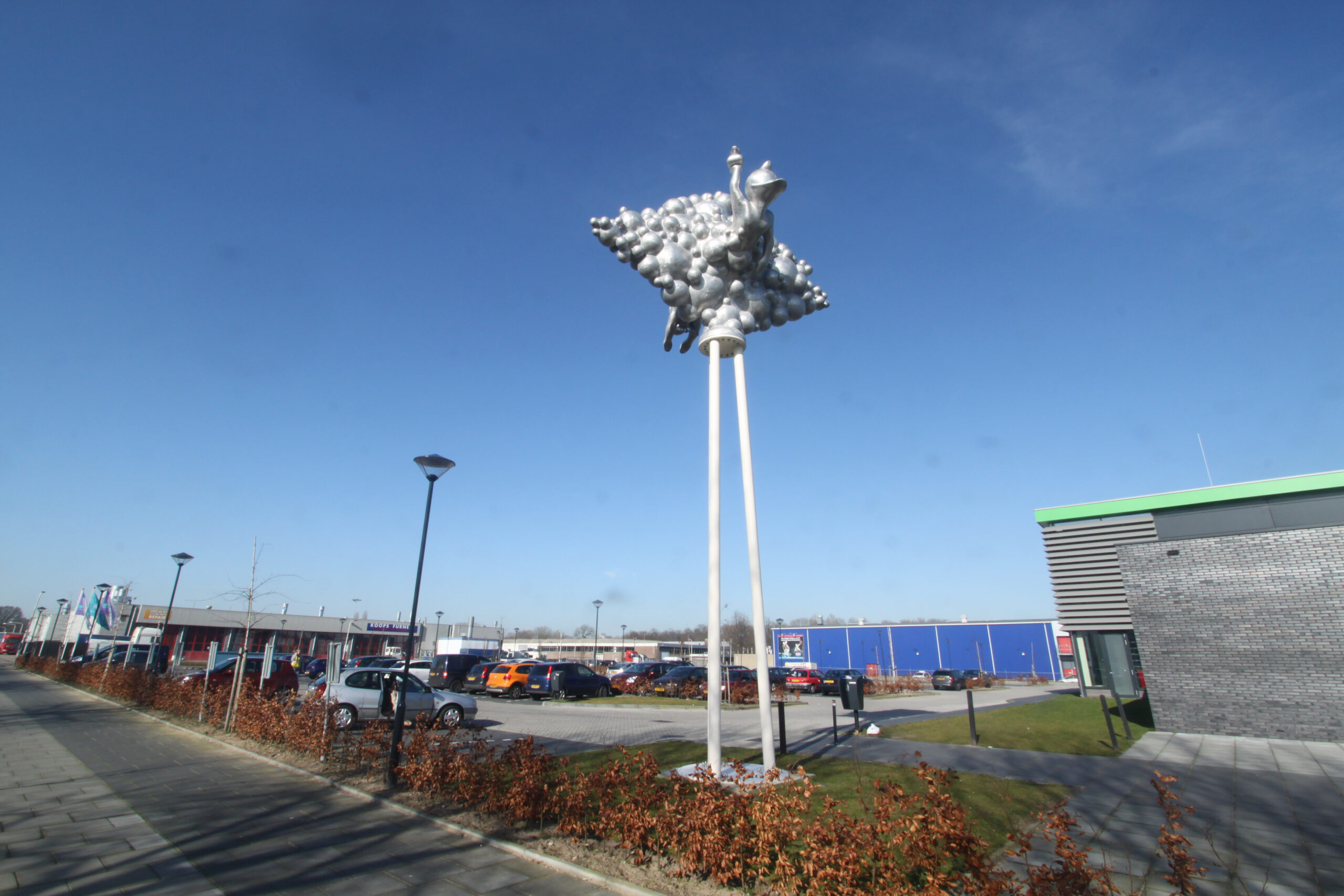Alles in dit beeld, vorm en figuratie, verwijst met een dynamische en levendige energie naar het plezier dat je in het zwembad kunt beleven. Spetterend, borrelend en met bubbels putten wij hier moeiteloos uit eigen ervaring dat alles in en rond het zwembad vooral ook leuk kan zijn! De beste stimulans tot actief bewegen is: ‘ Having Fun ‘. Kun je van een kunstwerk vrolijk worden? Niets liever dan dat, want het is vooral dit gevoel dat wij alle gebruikers en bezoekers van het zwembad, nog voor dat zij het water ook maar zien, mee willen geven. In goed Nederlands: a good mood mind setting! Hoe kan het ook anders op een bedrijventerrein dat De Vrolijkheid heet.