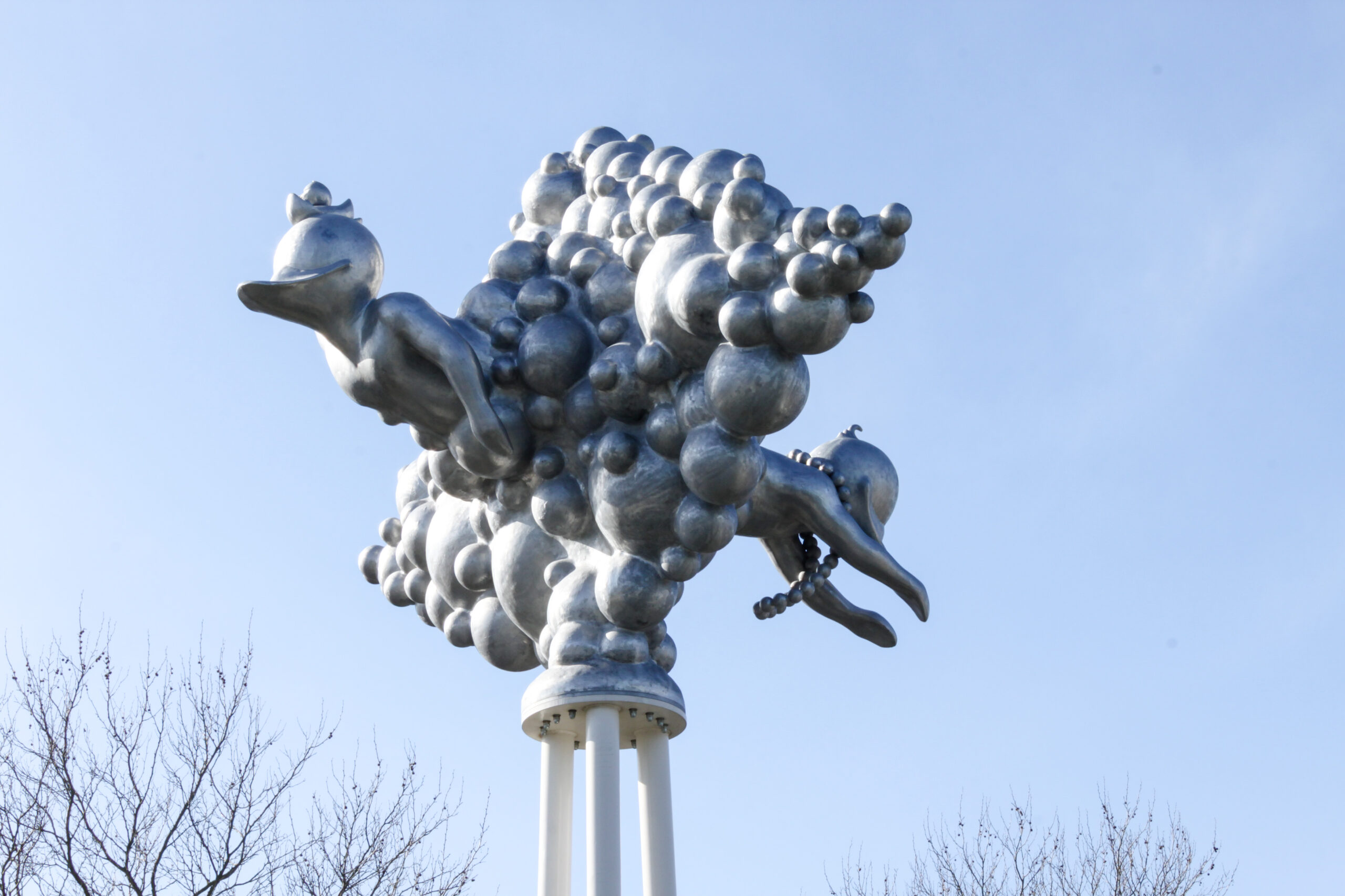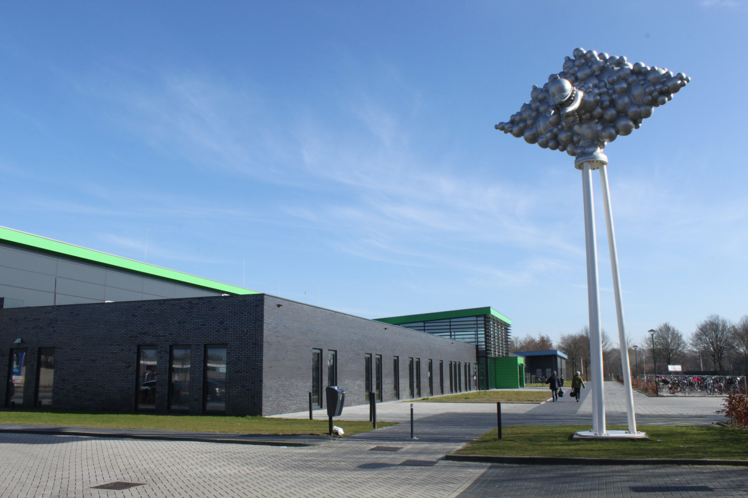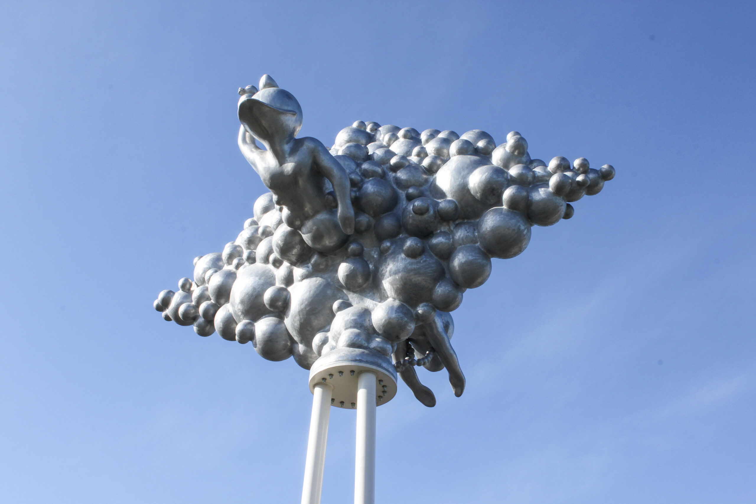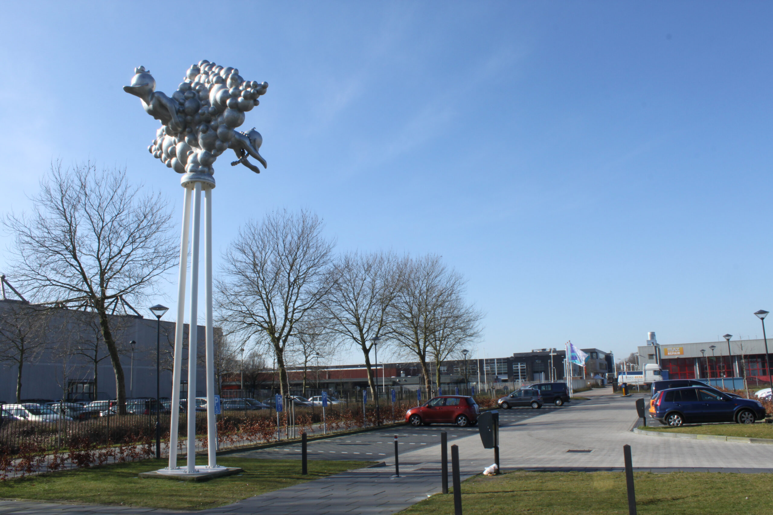 Alles in dit beeld, vorm en figuratie, verwijst met een dynamische en levendige energie naar het plezier dat je in het zwembad kunt beleven. Spetterend, borrelend en met bubbels putten wij hier moeiteloos uit eigen ervaring dat alles in en rond het zwembad vooral ook leuk kan zijn! De beste stimulans tot actief bewegen is: ‘ Having Fun ‘. Kun je van een kunstwerk vrolijk worden? Niets liever dan dat, want het is vooral dit gevoel dat wij alle gebruikers en bezoekers van het zwembad, nog voor dat zij het water ook maar zien, mee willen geven. In goed Nederlands: a good mood mind setting! Hoe kan het ook anders op een bedrijventerrein dat De Vrolijkheid heet.