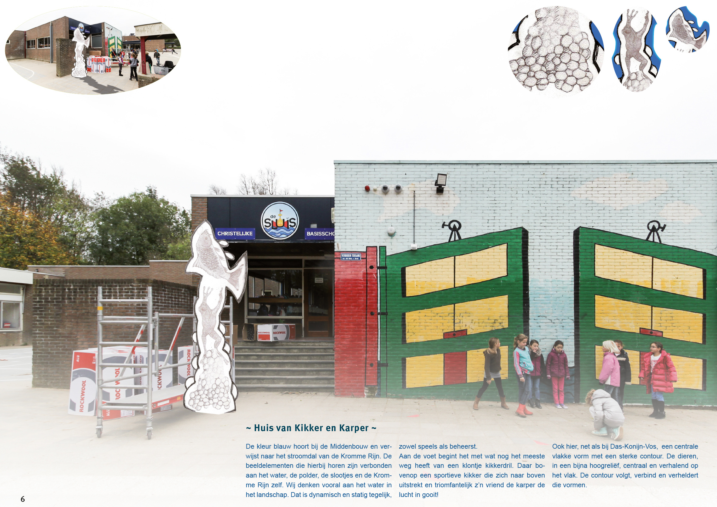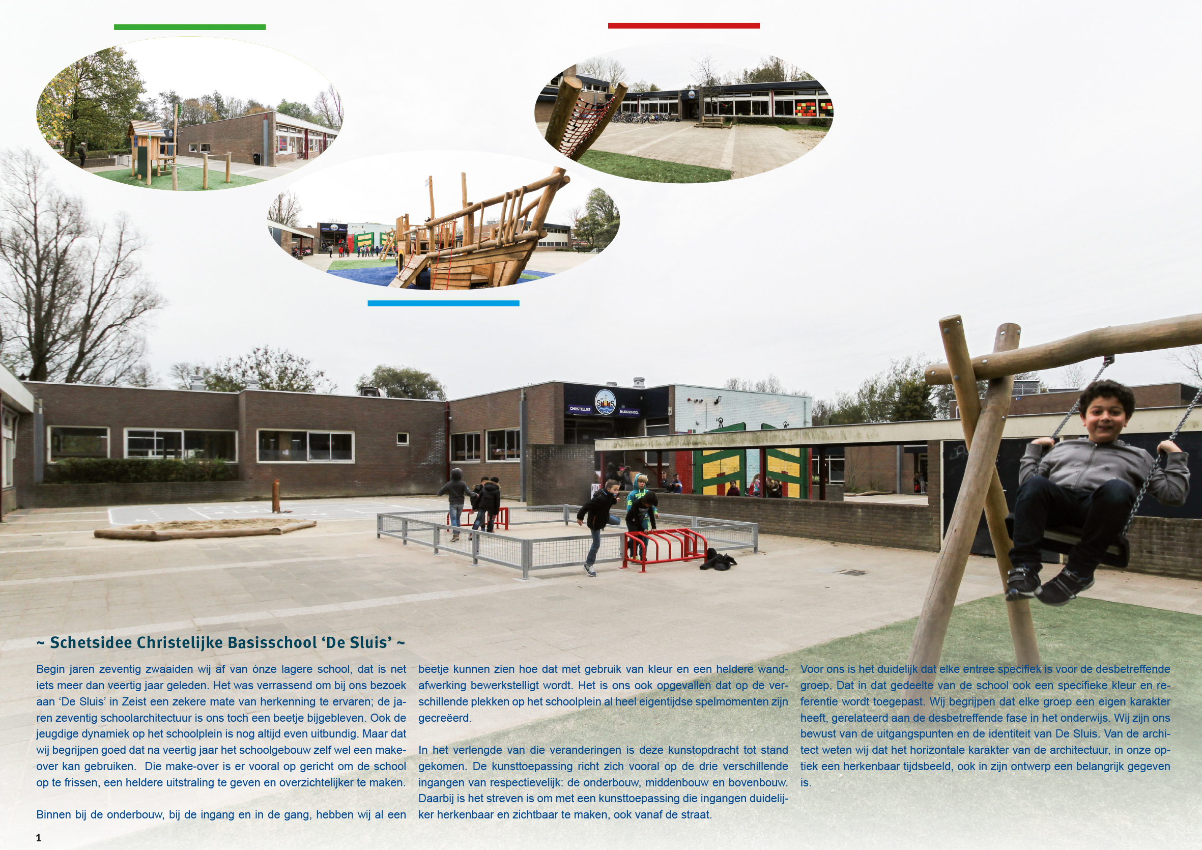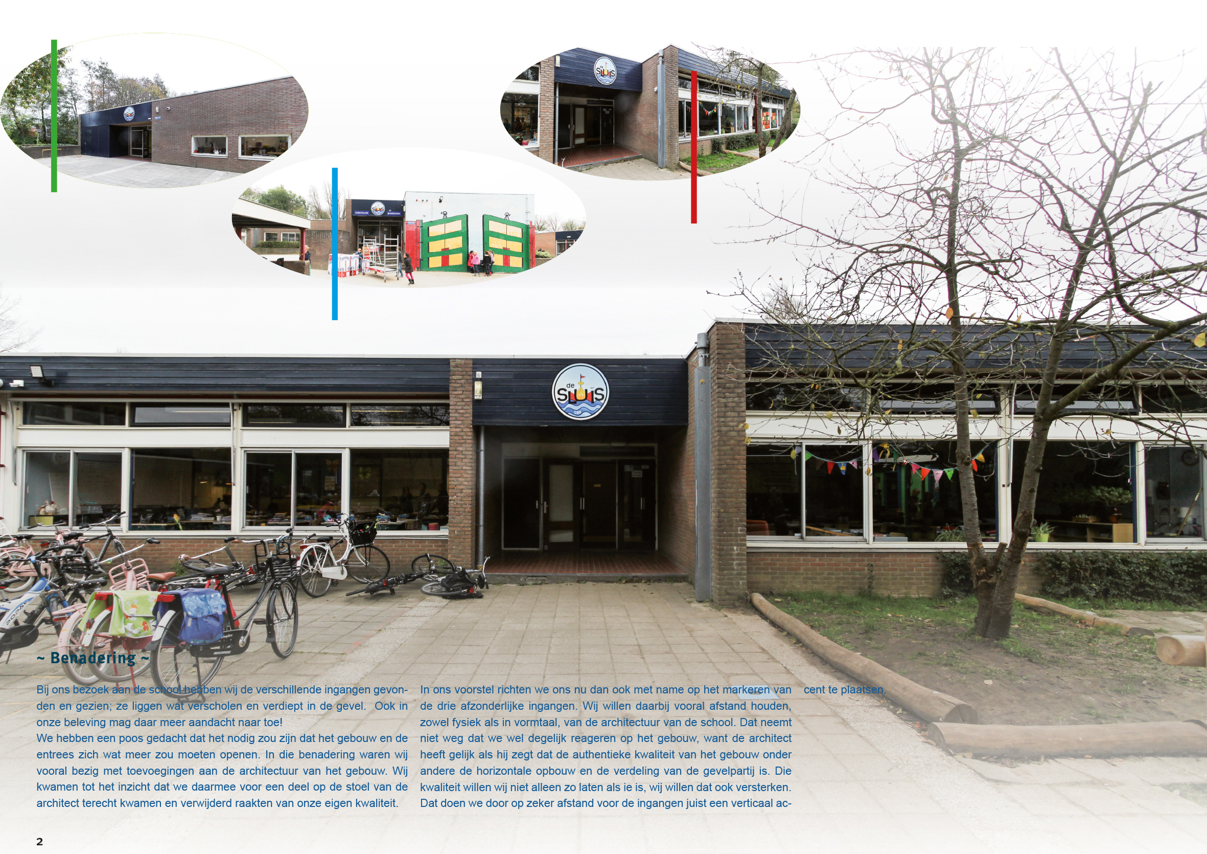 In het verlengde van die veranderingen is deze kunstopdracht tot stand gekomen. De kunsttoepassing richt zich vooral op de drie verschillende ingangen van respectievelijk: de onderbouw, middenbouw en bovenbouw. Daarbij is het streven is om met een kunsttoepassing die ingangen duidelijker herkenbaar en zichtbaar te maken, ook vanaf de straat. Voor ons is het duidelijk dat elke entree specifiek is voor de desbetreffende groep. Dat in dat gedeelte van de school ook een specifieke kleur en referentie wordt toegepast. Wij begrijpen dat elke groep een eigen karakter heeft, gerelateerd aan de desbetreffende fase in het onderwijs. Wij zijn ons bewust van de uitgangspunten en de identiteit van De Sluis. Van de architect weten wij dat het horizontale karakter van de architectuur, in onze optiek een herkenbaar tijdsbeeld, ook in zijn ontwerp een belangrijk gegeven is.