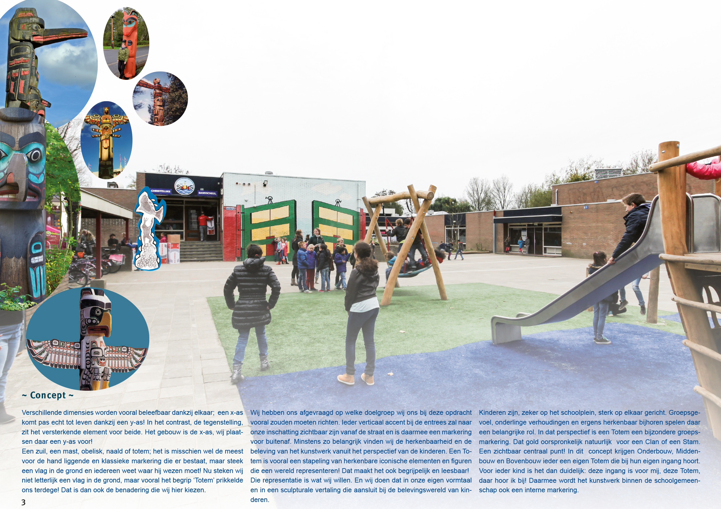 In ons voorstel is de totem, het groepsembleem, een vanzelfsprekend symbool van eenheid; het verhaalt over de onderlinge samenhang, een gedeelde band. Opgebouwd uit afzonderlijke zelfstandige elementen, maar ze horen en passen onlosmakelijk bij elkaar. Dat geldt natuurlijk ook voor de kinderen van deze school; het zijn allemaal individuen, met eigen kenmerken en kwaliteiten, maar ze zijn allemaal verbonden met elkaar.