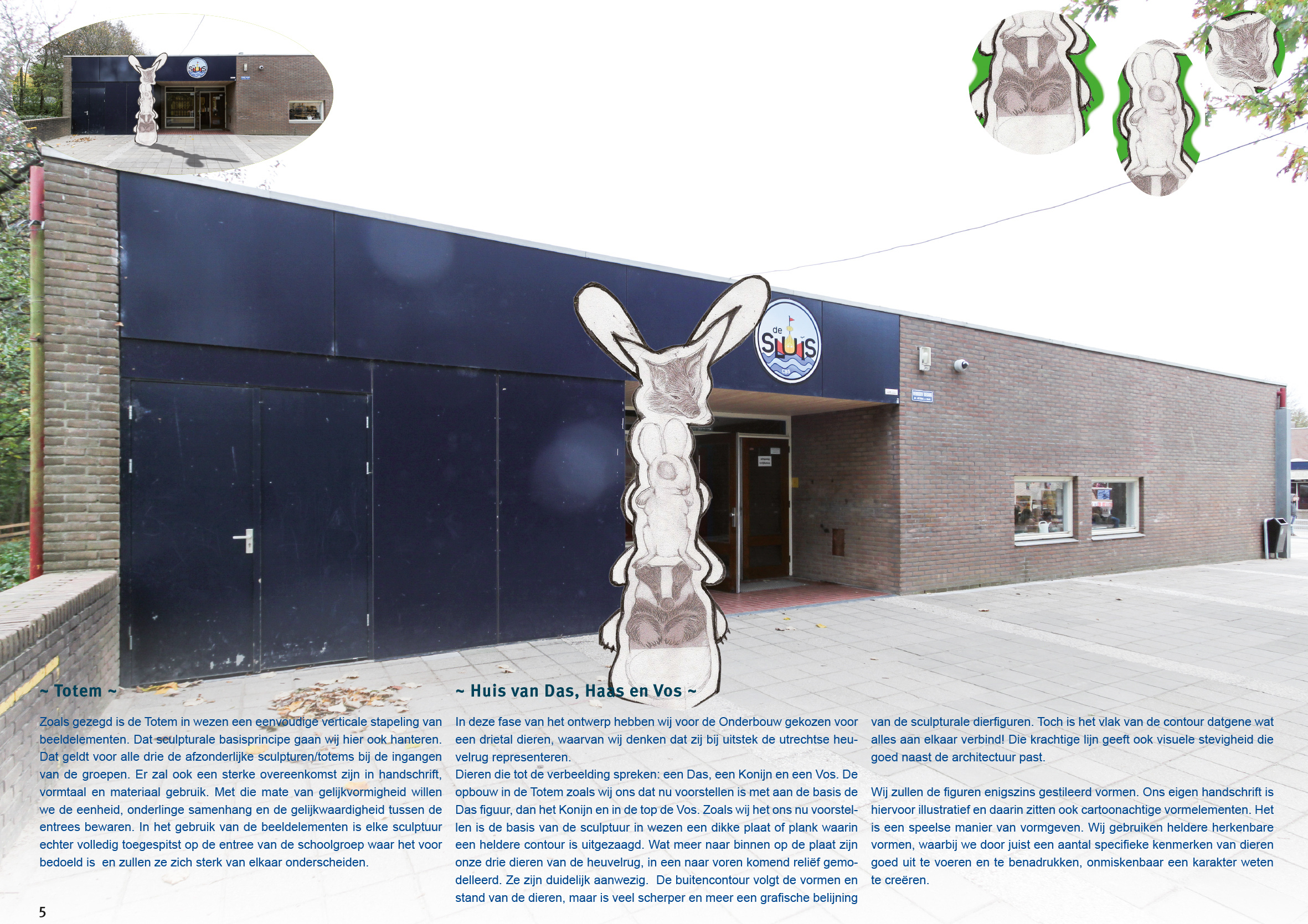 In deze fase van het ontwerp hebben wij voor de Onderbouw gekozen voor een drietal dieren, waarvan wij denken dat zij bij uitstek de utrechtse heuvelrug representeren. Dieren die tot de verbeelding spreken: een Das, een Konijn en een Vos. De opbouw in de Totem zoals wij ons dat nu voorstellen is met aan de basis de Das figuur, dan het Konijn en in de top de Vos. Zoals wij het ons nu voorstellen is de basis van de sculptuur in wezen een dikke plaat of plank waarin een heldere contour is uitgezaagd. Wat meer naar binnen op de plaat zijn onze drie dieren van de heuvelrug, in een naar voren komend reliëf gemodelleerd. Ze zijn duidelijk aanwezig. De buitencontour volgt de vormen en stand van de dieren, maar is veel scherper en meer een grafische belijning van de sculpturale dierfiguren. Toch is het vlak van de contour datgene wat alles aan elkaar verbind! Die krachtige lijn geeft ook visuele stevigheid die goed naast de architectuur past.
