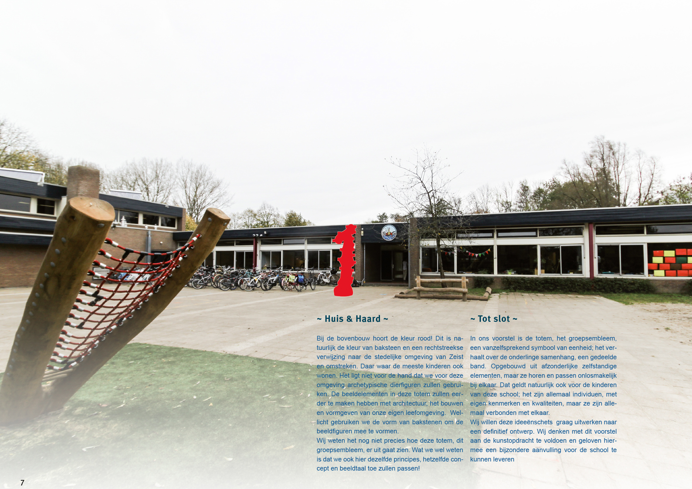 Onderbouw, Middenbouw en Bovenbouw zijn binnen de school duidelijk onderscheiden groepen, zij hebben niet alleen hun eigen ingang, maar er is ook een duidelijk verschil in fase en inhoud binnen het onderwijs! De school zelf heeft om dat onderscheid aan te geven een kleurstelling gekozen. Die kleurstelling is, voor zover wij hebben kunnen zien, vooral binnen het schoolgebouw uitgewerkt. De kleurstelling is groen voor de Onderbouw, blauw voor de Middenbouw en rood voor de Bovenbouw. De kleuren refereren aan de directe omgeving van de school. Het groen refereert aan de bosrijke omgeving van de Utrechtse Heuvelrug, het blauw aan het stroomdal van de Kromme Rijn en het rood aan de stedelijke omgeving van Zeist zelf. De sculpturale vertaling van die Totem en de elementen die we voor het groepsembleem gebruiken, komen rechtstreeks voort uit datgene waar de kleuren naar verwijzen. Dit gaat over de directe omgeving waar deze kinderen opgroeien. Als we iconische elementen uit die omgeving naar het schoolplein halen, dan geven we dat status en waardering. Die kijk op de omgeving krijgt hiermee een visuele verankering in tijd en ruimte.