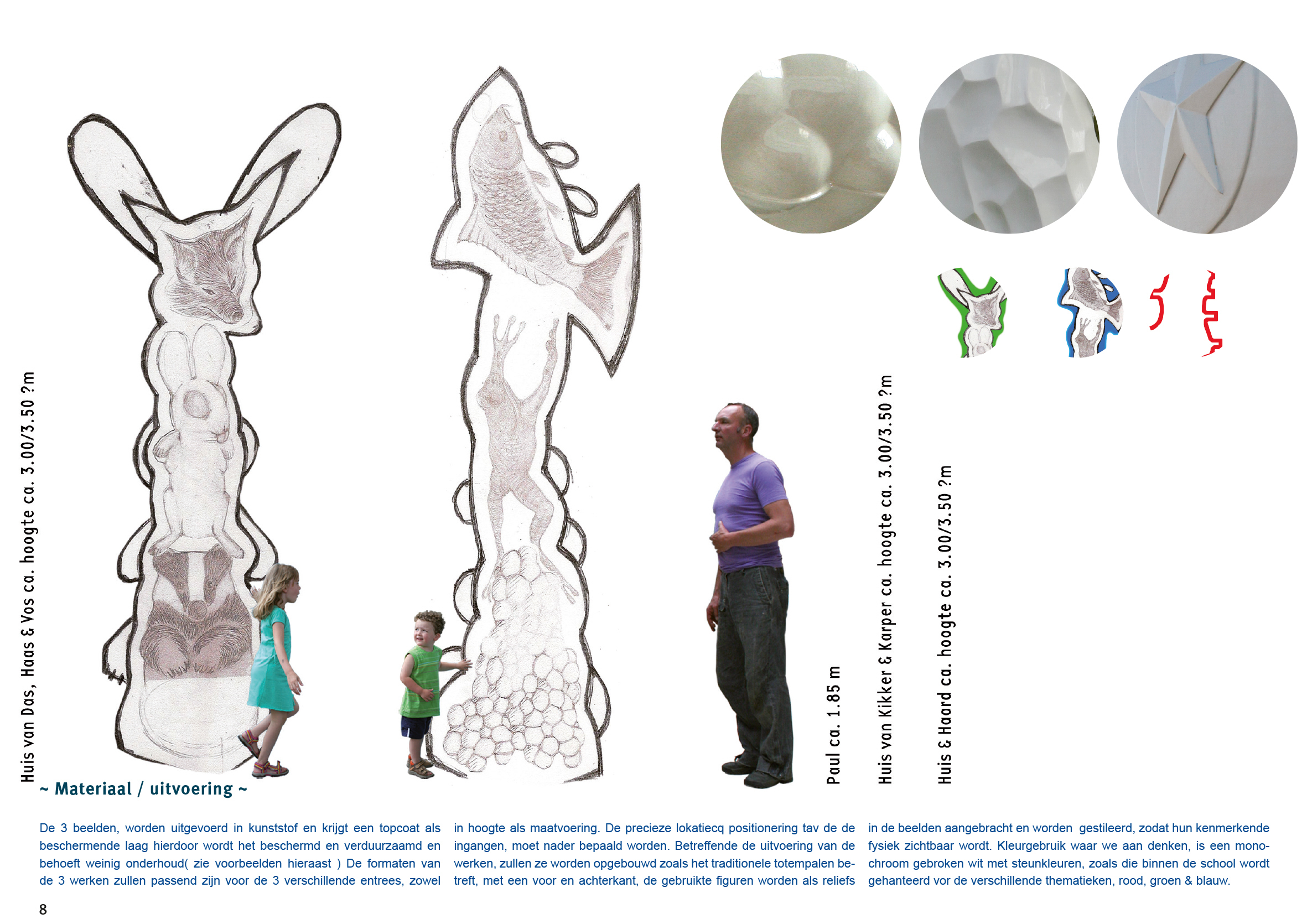 Wij hebben ons afgevraagd op welke doelgroep wij ons bij deze opdracht vooral zouden moeten richten. Ieder verticaal accent bij de entrees zal naar onze inschatting zichtbaar zijn vanaf de straat en is daarmee een markering voor buitenaf. Minstens zo belangrijk vinden wij de herkenbaarheid en de beleving van het kunstwerk vanuit het perspectief van de kinderen. Een Totem is vooral een stapeling van herkenbare iconische elementen en figuren die een wereld representeren! Dat maakt het ook begrijpelijk en leesbaar! Die representatie is wat wij willen. En wij doen dat in onze eigen vormtaal en in een sculpturale vertaling die aansluit bij de belevingswereld van kinderen.