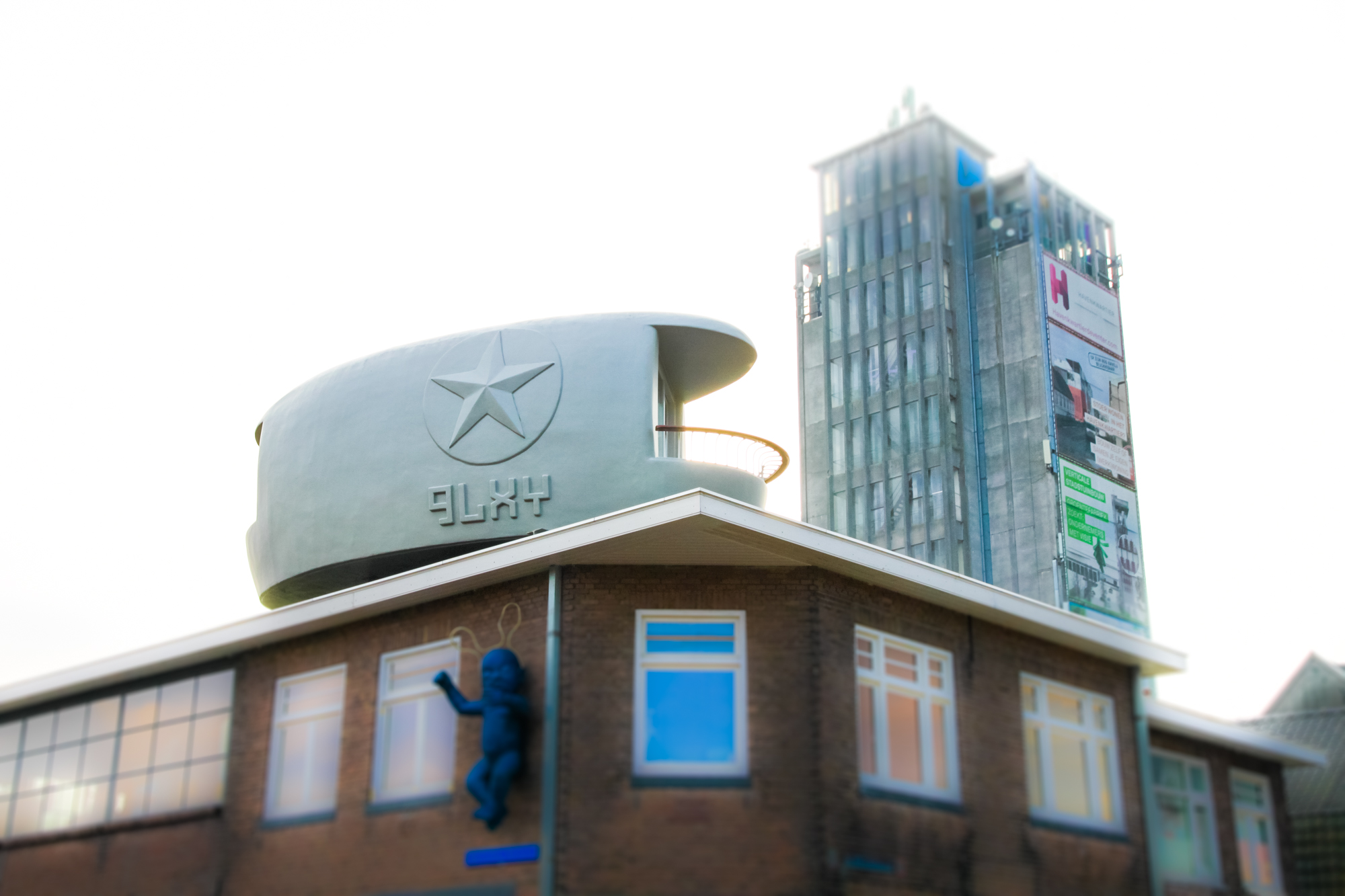 The Noordzeestraat is the main entrance of the harbour district. Here you will find the Lucy GLXY nestling on top of the roof of the former machine construction factory Eysink (now the studio of the Spacecowboys). The outlines of the GLXY refer to Navy ships and the long past Space age of the ’60’s. The glossy, padded skin, made of artificial fabric conceals a luxury residence unit. It’s a spacious venue which is suitable for one-night, but also for longer stays. It has its own entrance at the corner of the building, through which you will enter the heart of the Lucy GLXY, your room for the night. In the GLXY you will find a pantry and a unit combining shower, toilet and washing bowl. The bedroom, with a royal Auping bed facing the east, offers a great view on the harbor and has special view on the rooftop gallery. On the bed is a special Lucy designed bed spread made by artist Annemiek Pruyt. On the western side of the residence, there is a small lounging area from which you can see the sun setting above the magnificent IJssel landscape and standing on the balcony is the place where you are commander of your own Space odity. And there’s just one more thing to mention about this particular Lucy ,the rear view includes your own private rooftop gallery , with a selection of great sculptures . As an extra we will throw in our special Space Kitchen, it is free to use as diningroom, or a place to cook up up your own dinner, lunch or snacks. You’r welcome to enjoy your breakfast there. A night’s stay at the Lucy GLXY includes