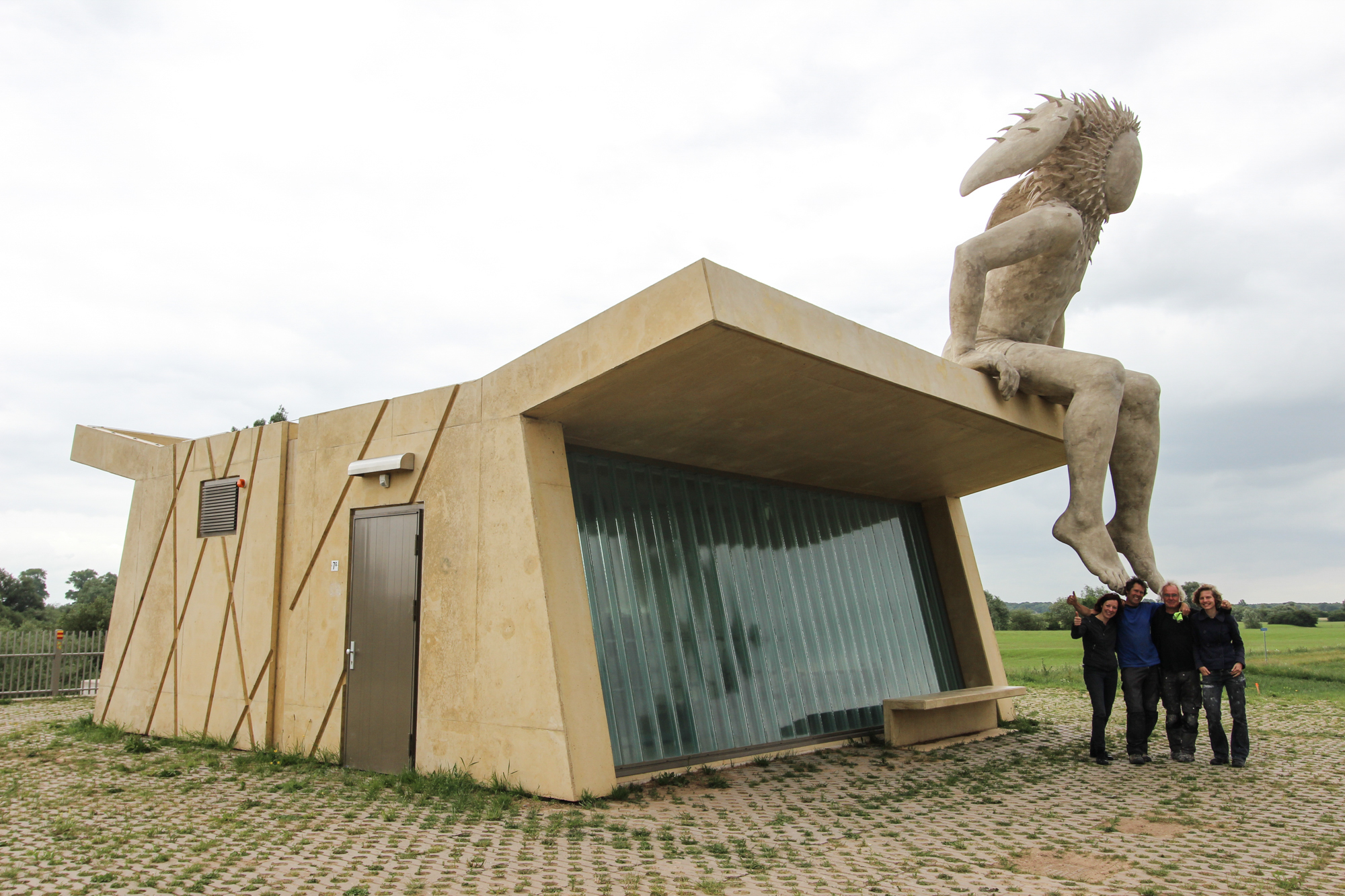 Jongetje, jong, jeugd. Dit refereert natuurlijk aan de toekomst, maar brengt tegelijk ook onze eigen jeugd in herinnering. De tijd dat we aan de rand van een weiland op een hekje konden zitten staren in de verte, in de zon met een grasspriet in de mond een beetje weg zitten dromen. We willen ‘onze PAN’ dan ook boven op het nieuwe gemaalhuisje plaatsen. Zittend op de rand en uitkijkend over het landschap. Hij zit daar heel ontspannen en vanzelfsprekend. De uitdrukking in lichaamstaal is afwachtend, beschouwend en wellicht een beetje weemoedig. Maar vooral zit hij daar te wachten op de kans dat ie z’n gang kan gaan; als een zaadje dat bij een eerste regenbui ontspruit, als een roofdier in verwachtingsvolle spanning vlak voor het z’n prooi bespringt.