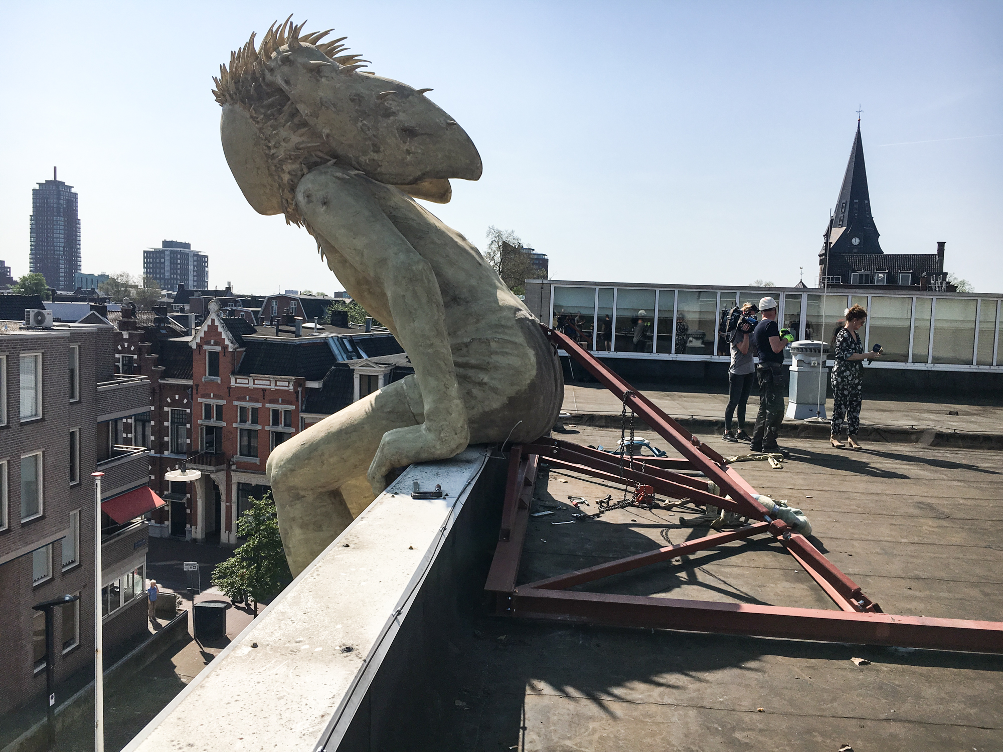 We laten echter wel het lichaam zoveel mogelijk intact. Juist het contrast tussen de detaillering van een jongenslijf in het formaat van een reus, geeft de spanning tussen kwetsbaarheid en kracht. In een kinderlichaam, hoe groot het ook is, blijft altijd een zekere onschuld schuilen; dat maakt het voor de beschouwer invoelbaar. Houding , lichaamstaal is hierin een belangrijk aspect om expressie in het beeld te krijgen.