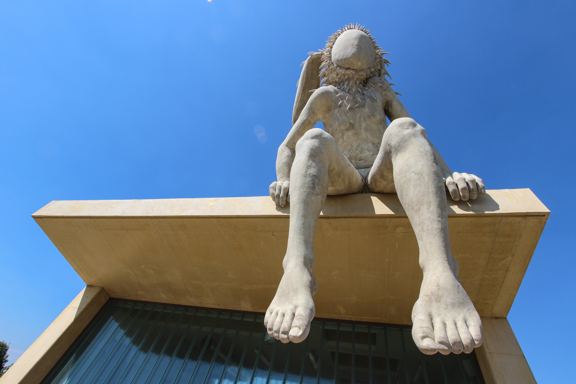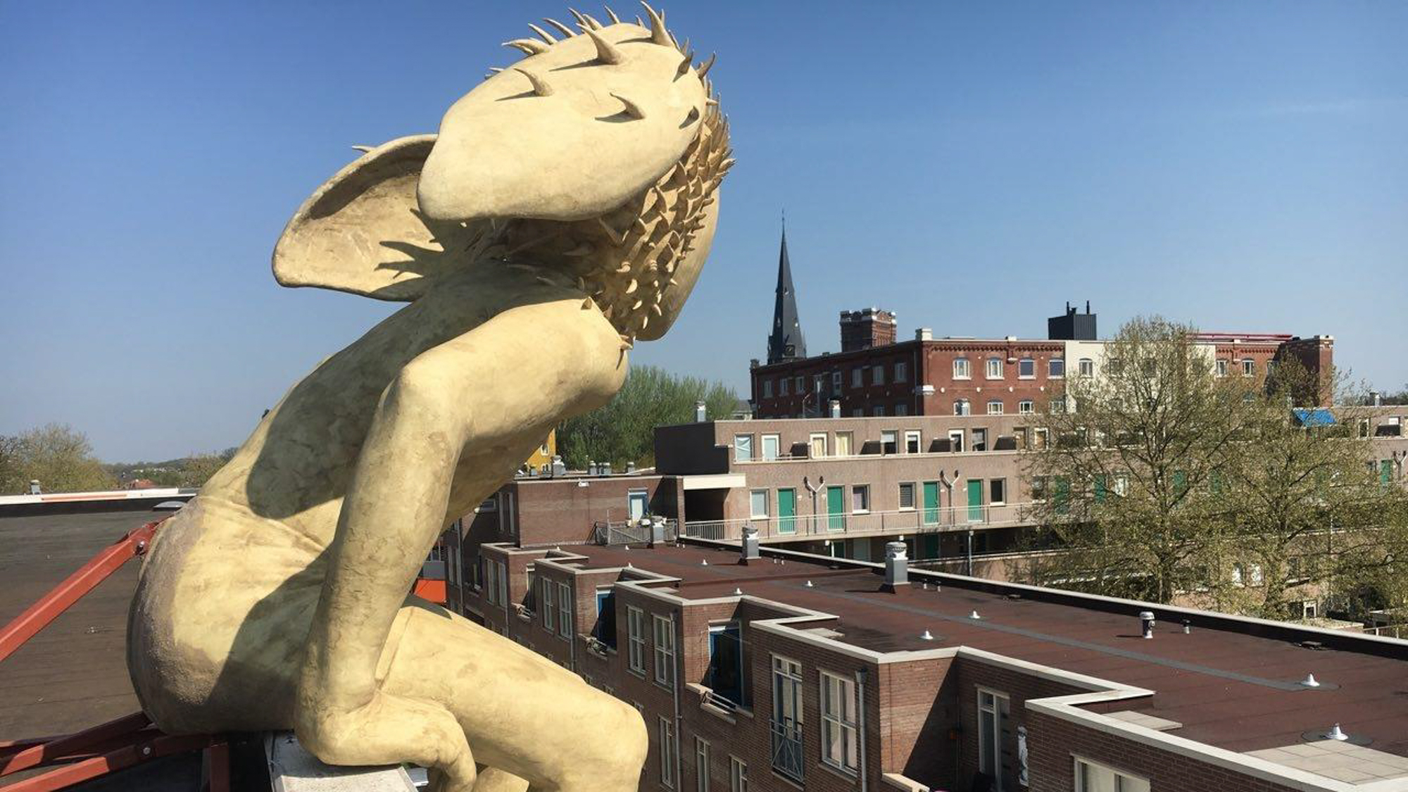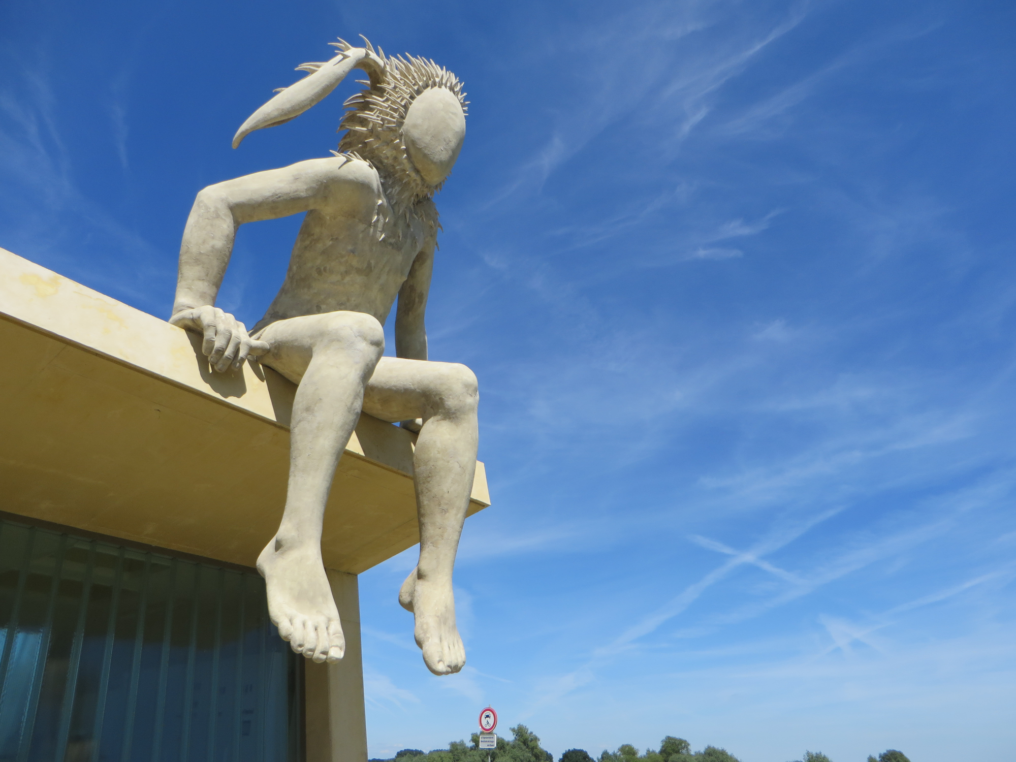 Hij zit daar met de benen bungelend over de dakrand, de voeten bijna aanraakbaar. Op een hoek van het gebouw, met de rug naar het Nijenbeek, kijkend in de richting van Zutphen over de Voorster Klei. Het gebouw heeft een overstekende dakrand en op die plek onder het beeld, onder de overstek, is ook een zitbank geplaatst. Bezoekers/beschouwers kijken vanaf die plek in dezelfde richting als dat onze ‘ PAN ‘ kijkt. Alleen al door z’n aanwezigheid en de vervreemdende maatvoering van het beeld zal deze plek en dit landschap anders ervaren worden.