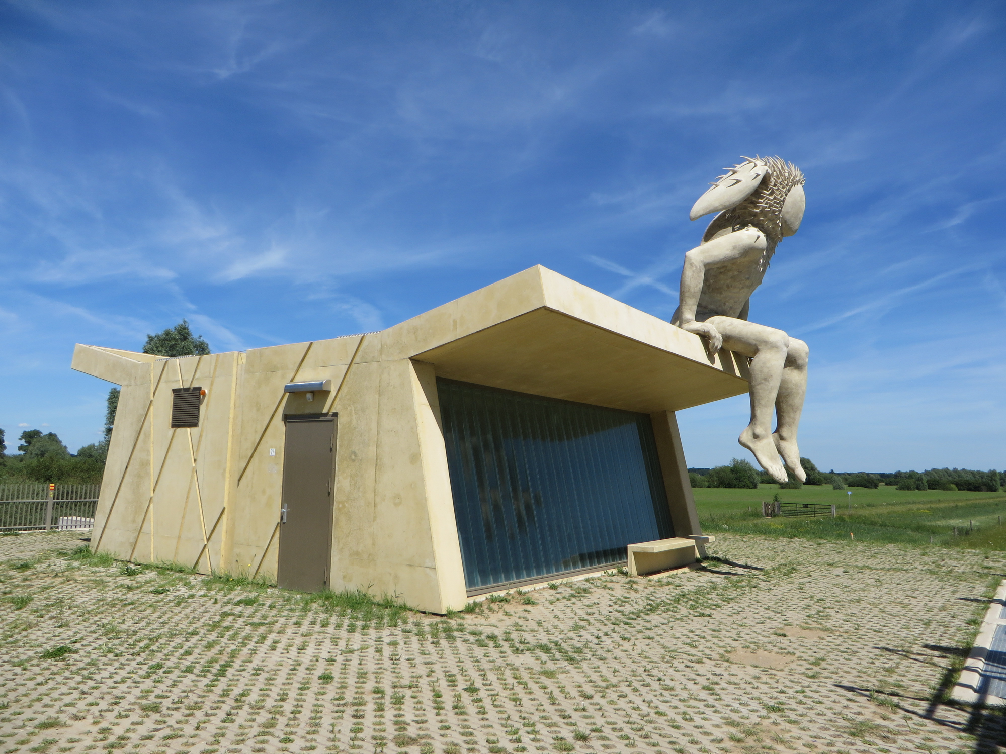 Jongetje, jong, jeugd. Dit refereert natuurlijk aan de toekomst, maar brengt tegelijk ook onze eigen jeugd in herinnering. De tijd dat we aan de rand van een weiland op een hekje konden zitten staren in de verte, in de zon met een grasspriet in de mond een beetje weg zitten dromen. We willen ‘onze PAN’ dan ook boven op het nieuwe gemaalhuisje plaatsen. Zittend op de rand en uitkijkend over het landschap. Hij zit daar heel ontspannen en vanzelfsprekend. De uitdrukking in lichaamstaal is afwachtend, beschouwend en wellicht een beetje weemoedig. Maar vooral zit hij daar te wachten op de kans dat ie z’n gang kan gaan; als een zaadje dat bij een eerste regenbui ontspruit, als een roofdier in verwachtingsvolle spanning vlak voor het z’n prooi bespringt.
