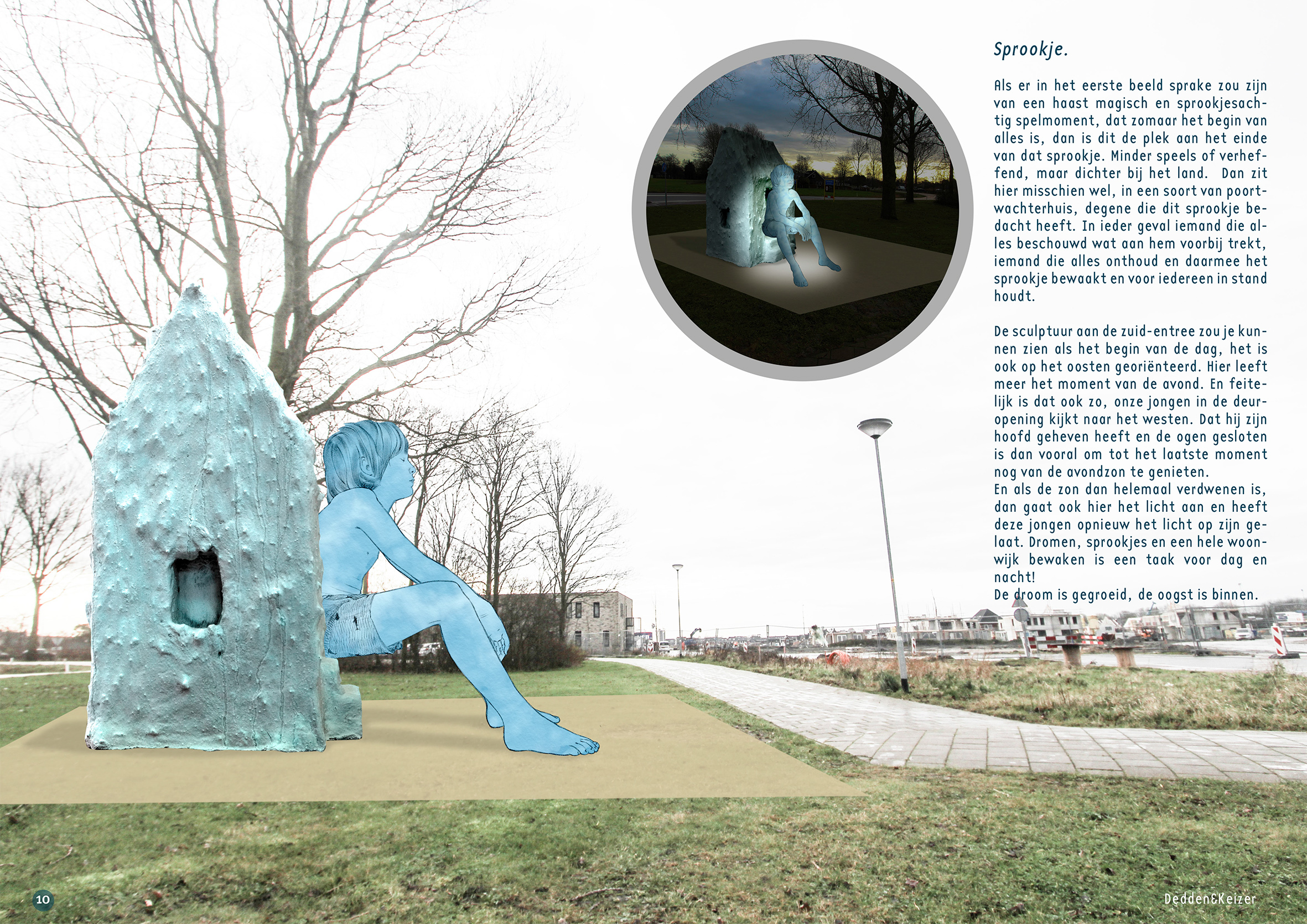 Als er in het eerste beeld sprake zou zijn van een haast magisch en sprookjesachtig spelmoment, dat zomaar het begin van alles is, dan is dit de plek aan het einde van dat sprookje. Minder speels of verheffend, maar dichter bij het land. Dan zit hier misschien wel, in een soort van poortwachterhuis, degene die dit sprookje bedacht heeft. In ieder geval iemand die alles beschouwd wat aan hem voorbij trekt, iemand die alles onthoud en daarmee het sprookje bewaakt en voor iedereen in stand houdt. De sculptuur aan de zuid-entree zou je kunnen zien als het begin van de dag, het is ook op het oosten georiënteerd. Hier leeft meer het moment van de avond. En feitelijk is dat ook zo, onze jongen in de deuropening kijkt naar het westen. Dat hij zijn hoofd geheven heeft en de ogen gesloten is dan vooral om tot het laatste moment nog van de avondzon te genieten. En als de zon dan helemaal verdwenen is, dan gaat ook hier het licht aan en heeft deze jongen opnieuw het licht op zijn gelaat. Dromen, sprookjes en een hele woonwijk bewaken is een taak voor dag en nacht! De droom is gegroeid, de oogst is binnen.