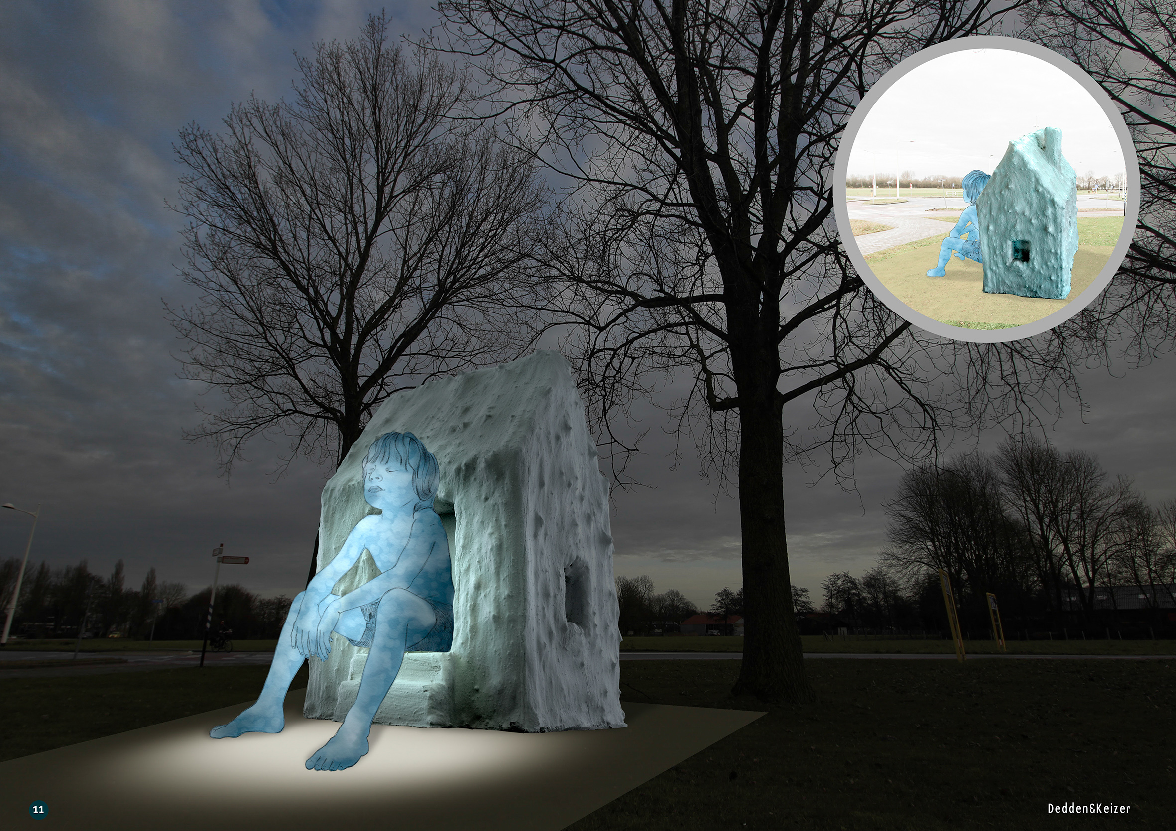 Voor als al die mensen weer thuis komen is er echter ook een avond/nachtbeeld. Het huisje dat de jongen in z’n handen heeft zweeft boven de grond en precies er onder zit een grondspot! Het licht in die grondspot gaat in de avond aan. Het huisje komt daardoor niet alleen vol in het licht te staan, het doet zelf ook mee! Het is eigenlijk een object dat hol is aan de onderzijde en de transparante kunststof waarmee het gegoten is, zal door het licht van onderen zelf ook oplichten. Het wordt daardoor een lichtobject dat van binnenuit straalt en voor een deel ook de jongen zelf aanlicht. In de avond en de nacht is het daarmee een helder baken om goed bij thuis te komen.