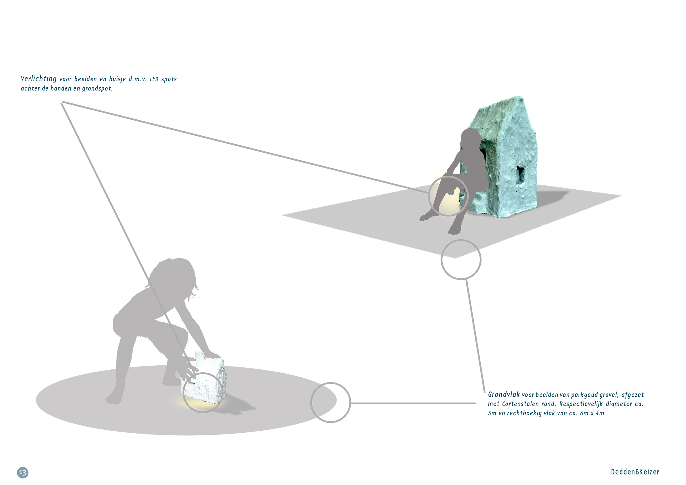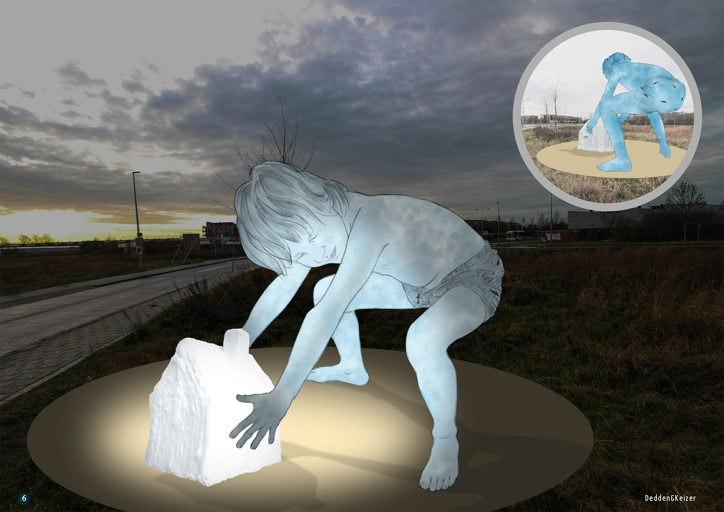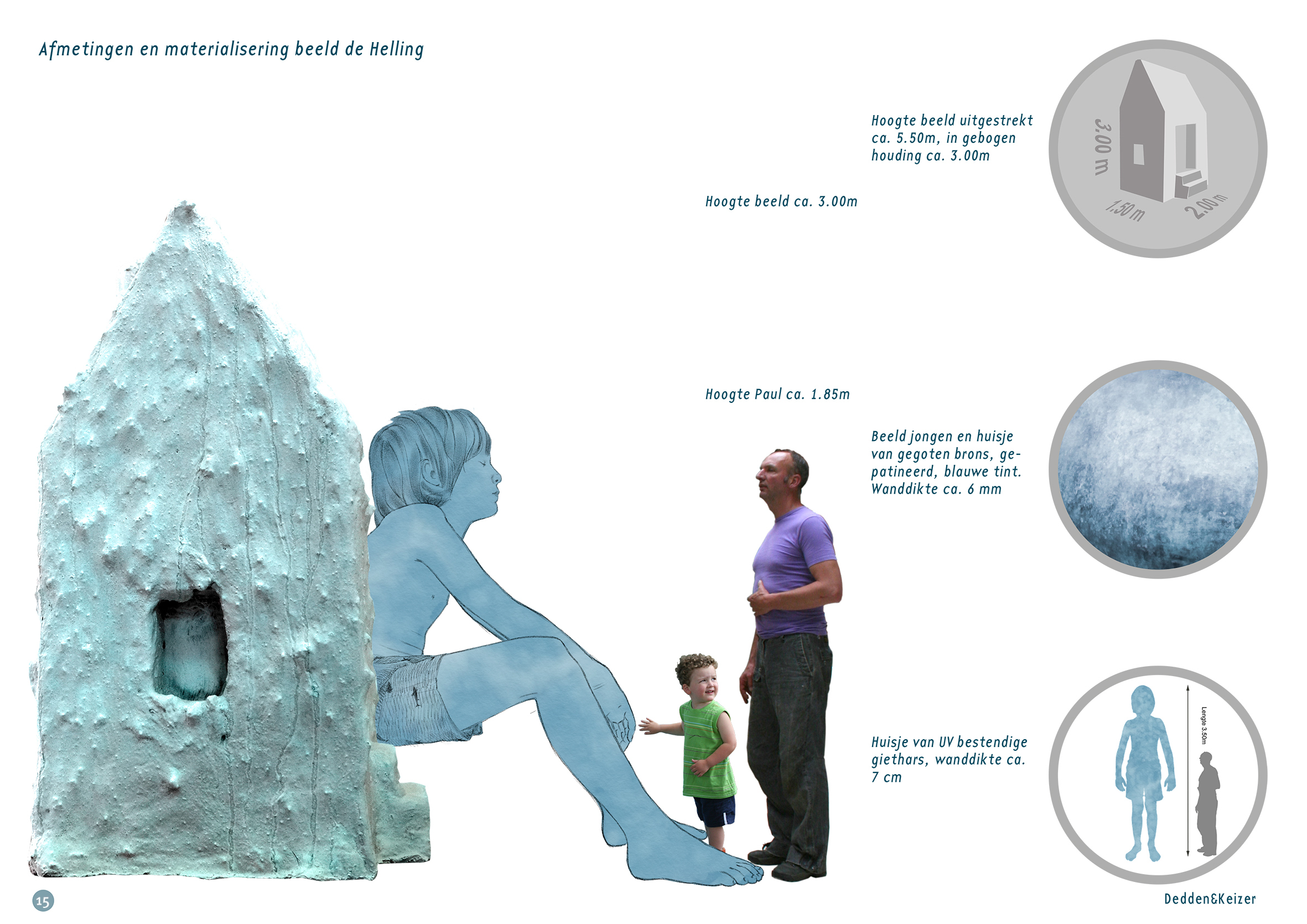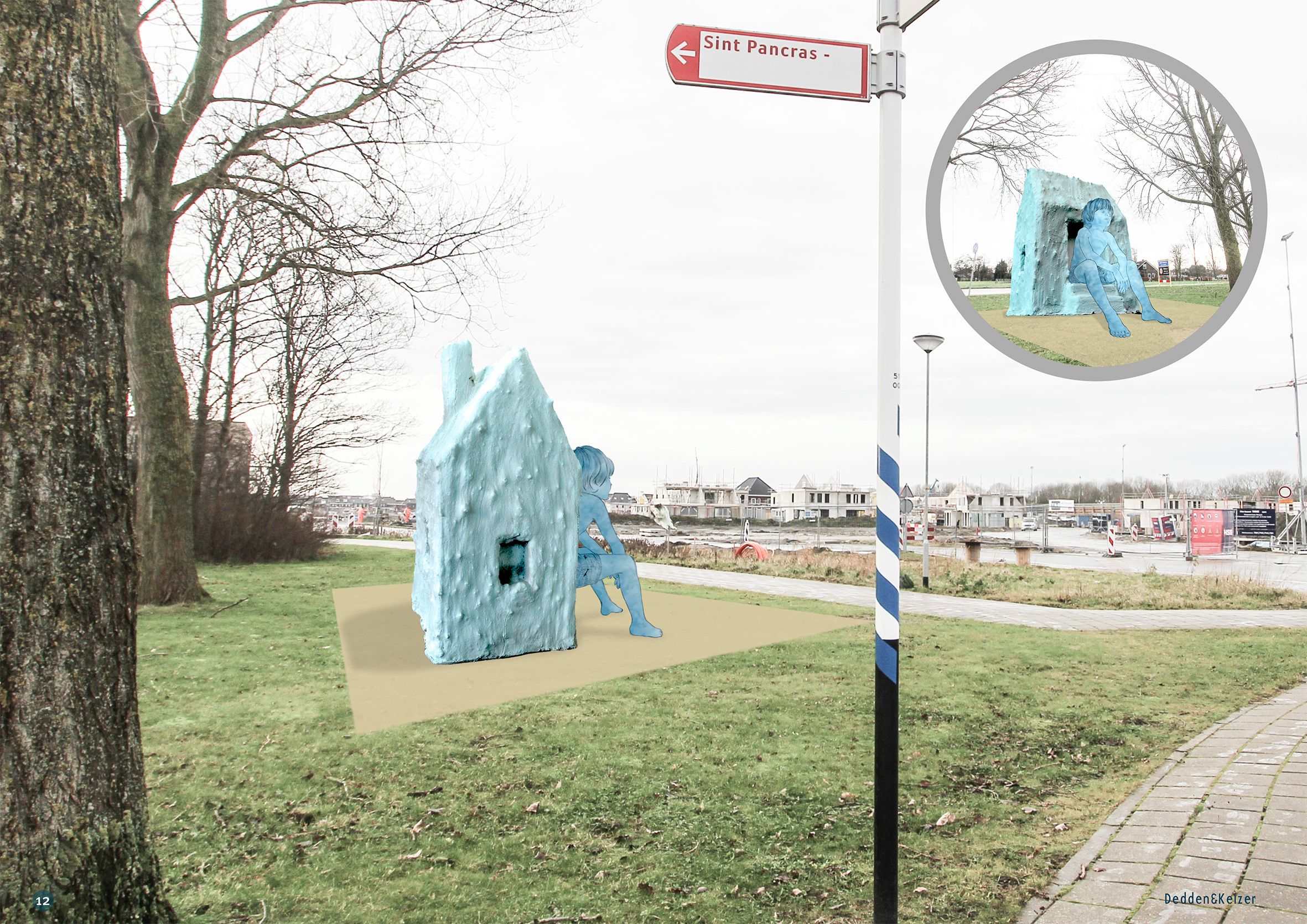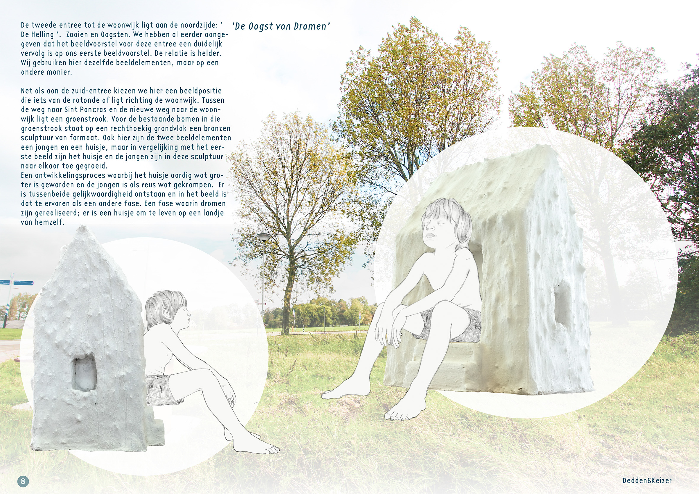 De tweede entree tot de woonwijk ligt aan de noordzijde: ‘ De Helling ‘. Zaaien en Oogsten. We hebben al eerder aangegeven dat het beeldvoorstel voor deze entree een duidelijk vervolg is op ons eerste beeldvoorstel. De relatie is helder. Wij gebruiken hier dezelfde beeldelementen, maar op een andere manier. Net als aan de zuid-entree kiezen we hier een beeldpositie die iets van de rotonde af ligt richting de woonwijk. Tussen de weg naar Sint Pancras en de nieuwe weg naar de woonwijk ligt een groenstrook. Voor de bestaande bomen in die groenstrook staat op een rechthoekig grondvlak een bronzen sculptuur van formaat. Ook hier zijn de twee beeldelementen een jongen en een huisje, maar in vergelijking met het eerste beeld zijn het huisje en de jongen zijn in deze sculptuur naar elkaar toe gegroeid. Een ontwikkelingsproces waarbij het huisje aardig wat groter is geworden en de jongen is als reus wat gekrompen. Er is tussenbeide gelijkwaardigheid ontstaan en in het beeld is dat te ervaren als een andere fase. Een fase waarin dromen zijn gerealiseerd; er is een huisje om te leven op een landje van hemzelf.